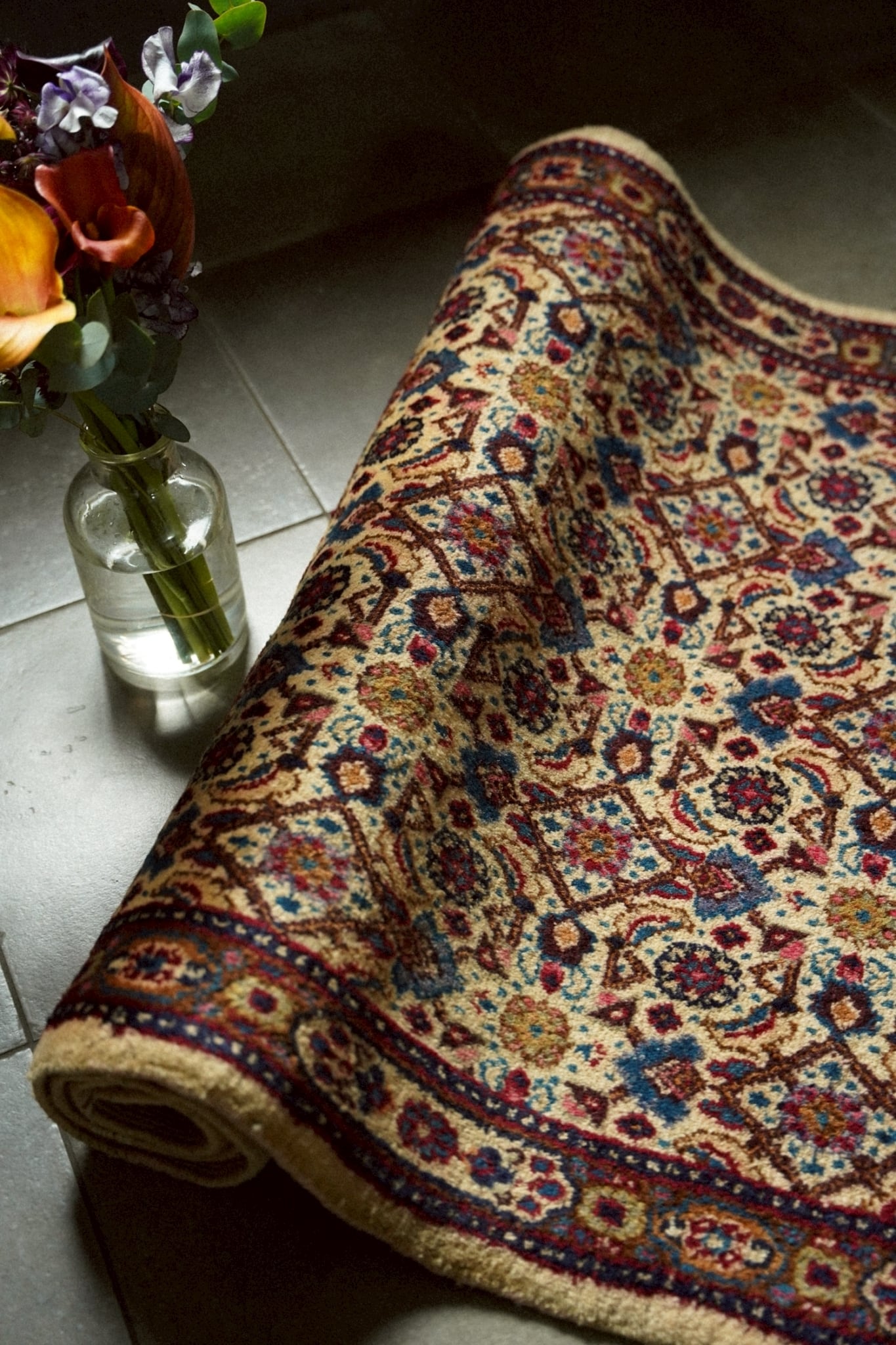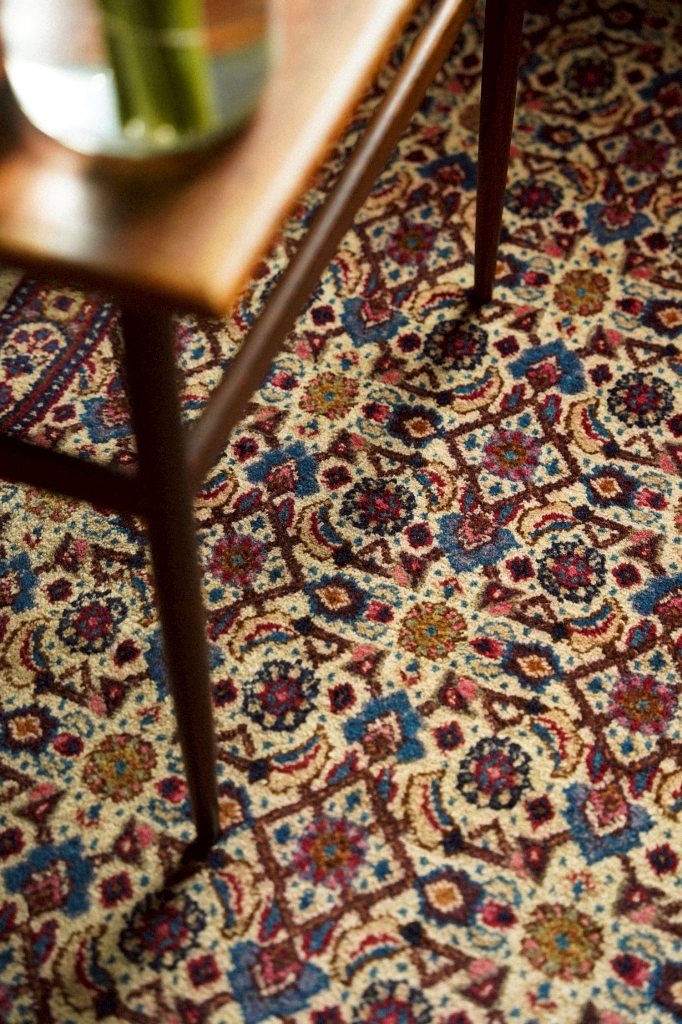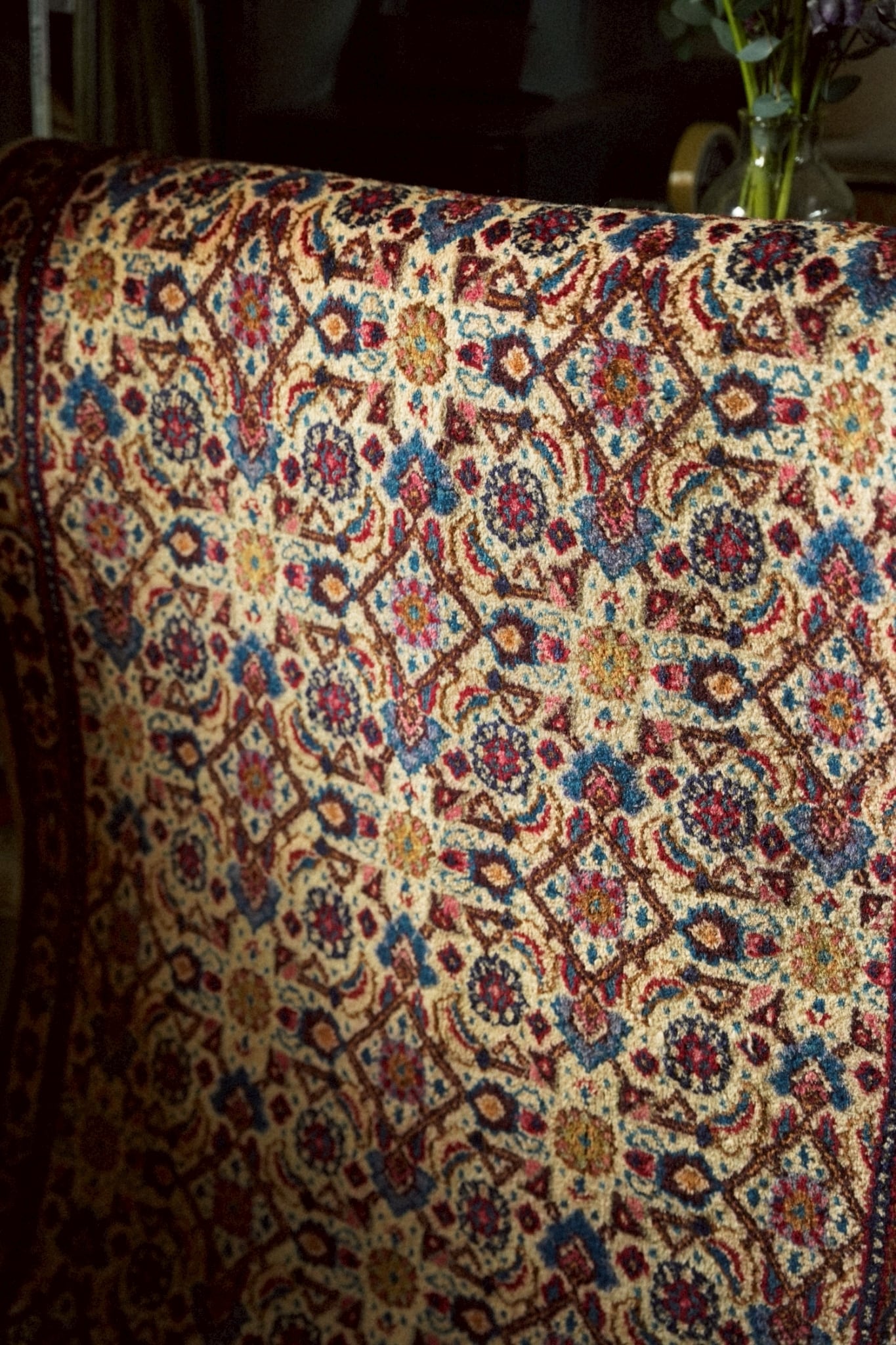 お花の周りを葉が囲むヘラティ文様が全体に織り込まれた華やかなデザイン。