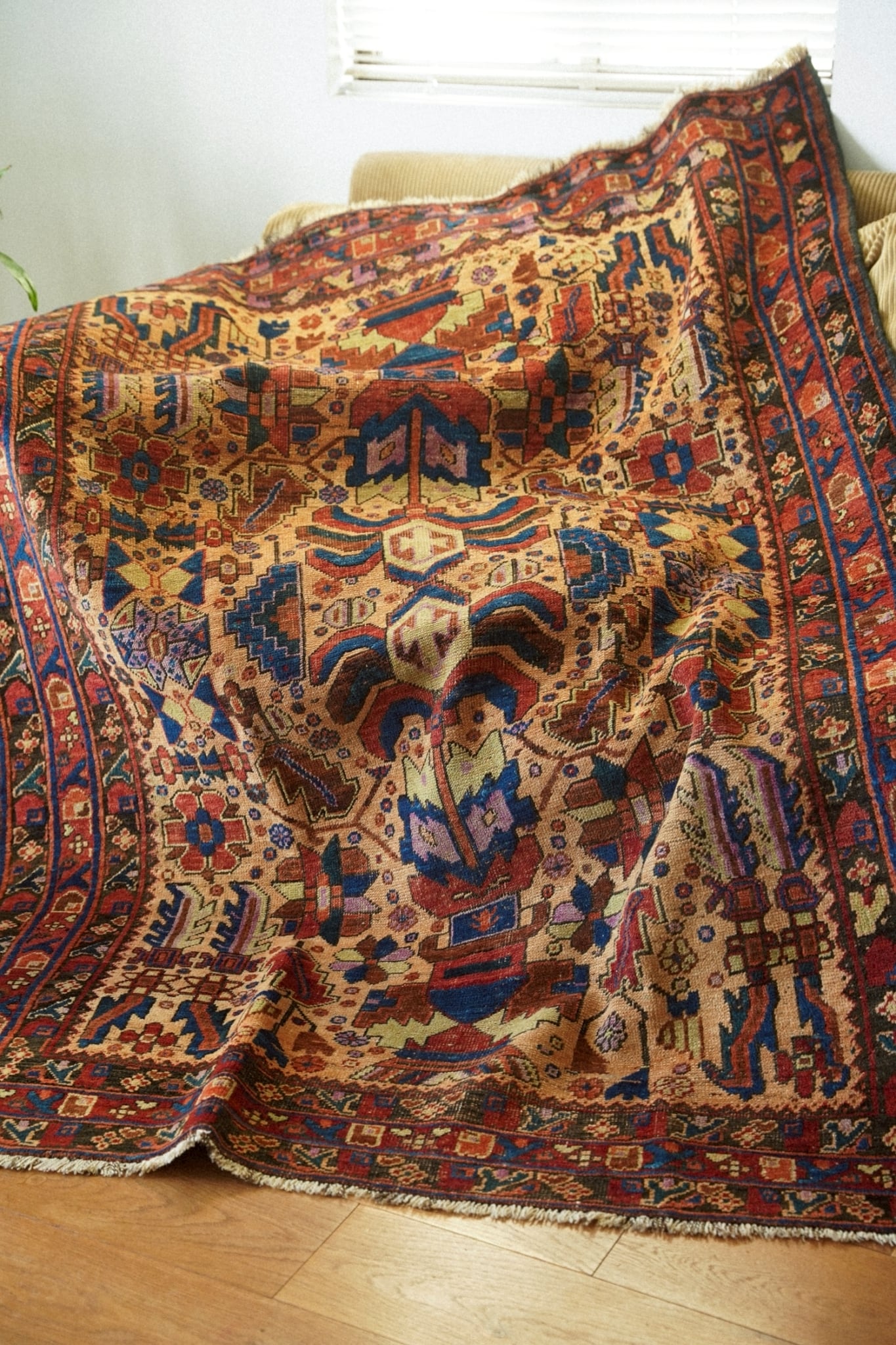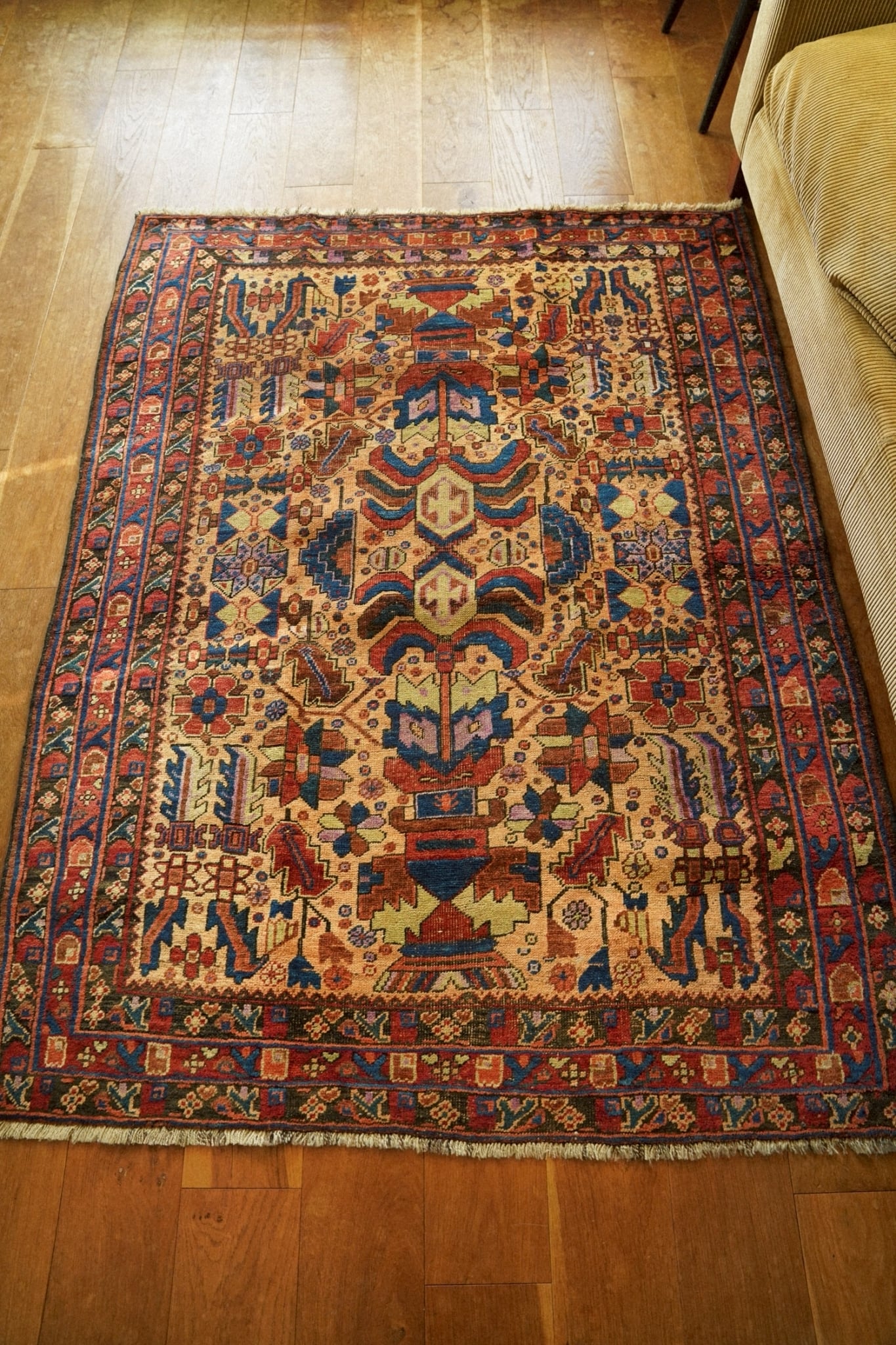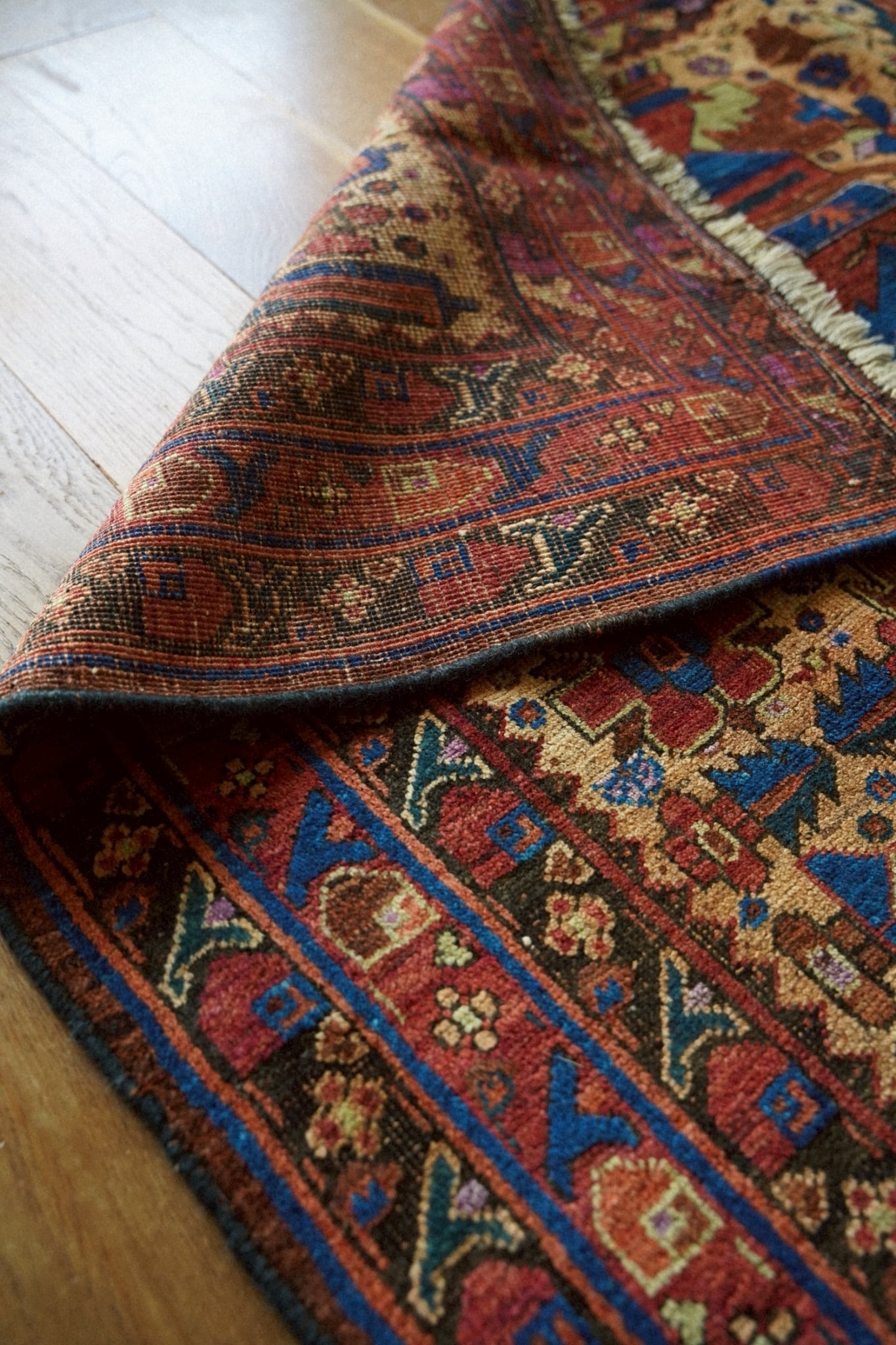 経年80年程のアンティークに近いラグのため、擦れによってパイルが低い箇所もございますが使用に問題はございません。