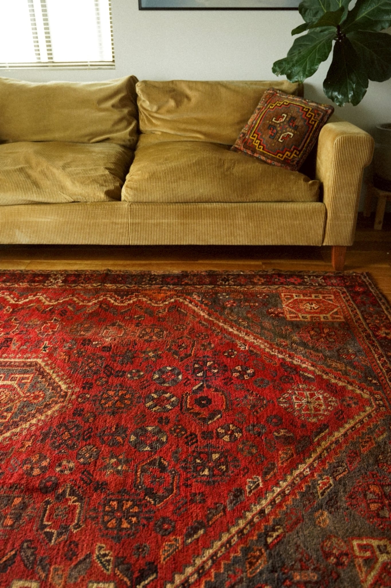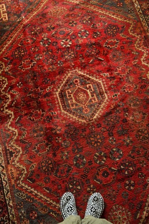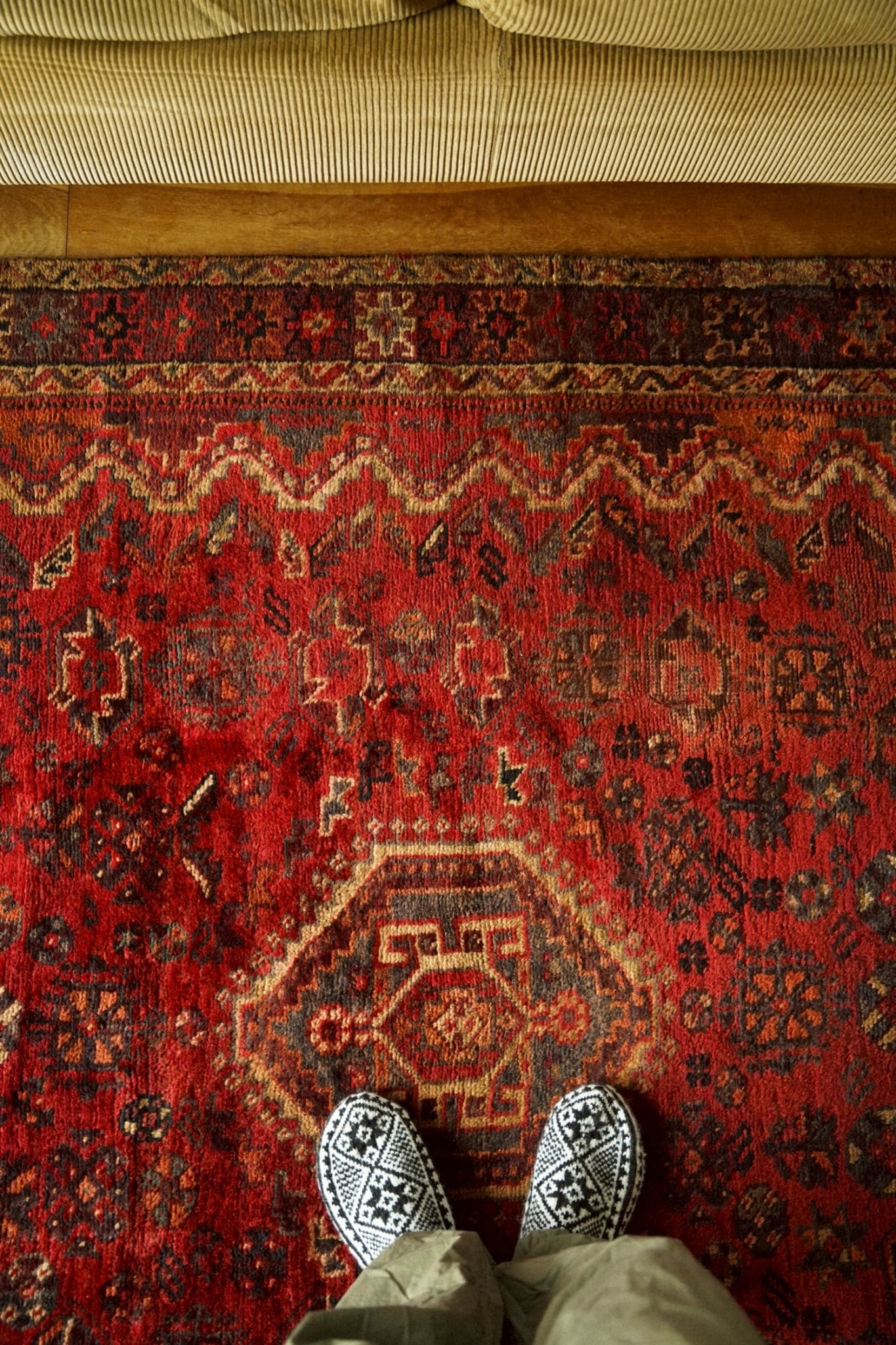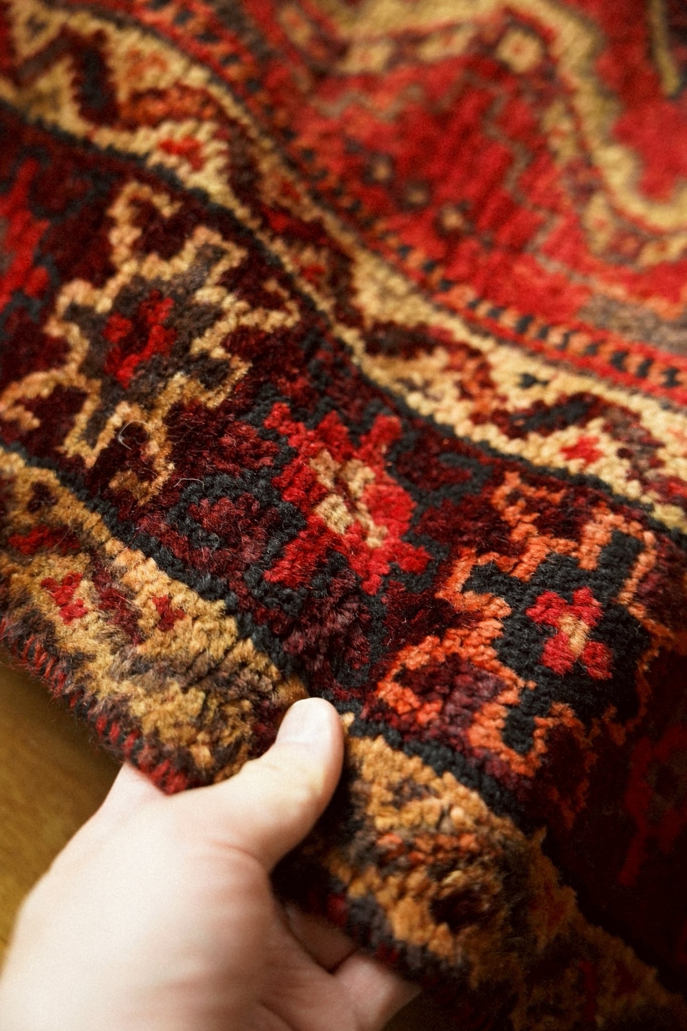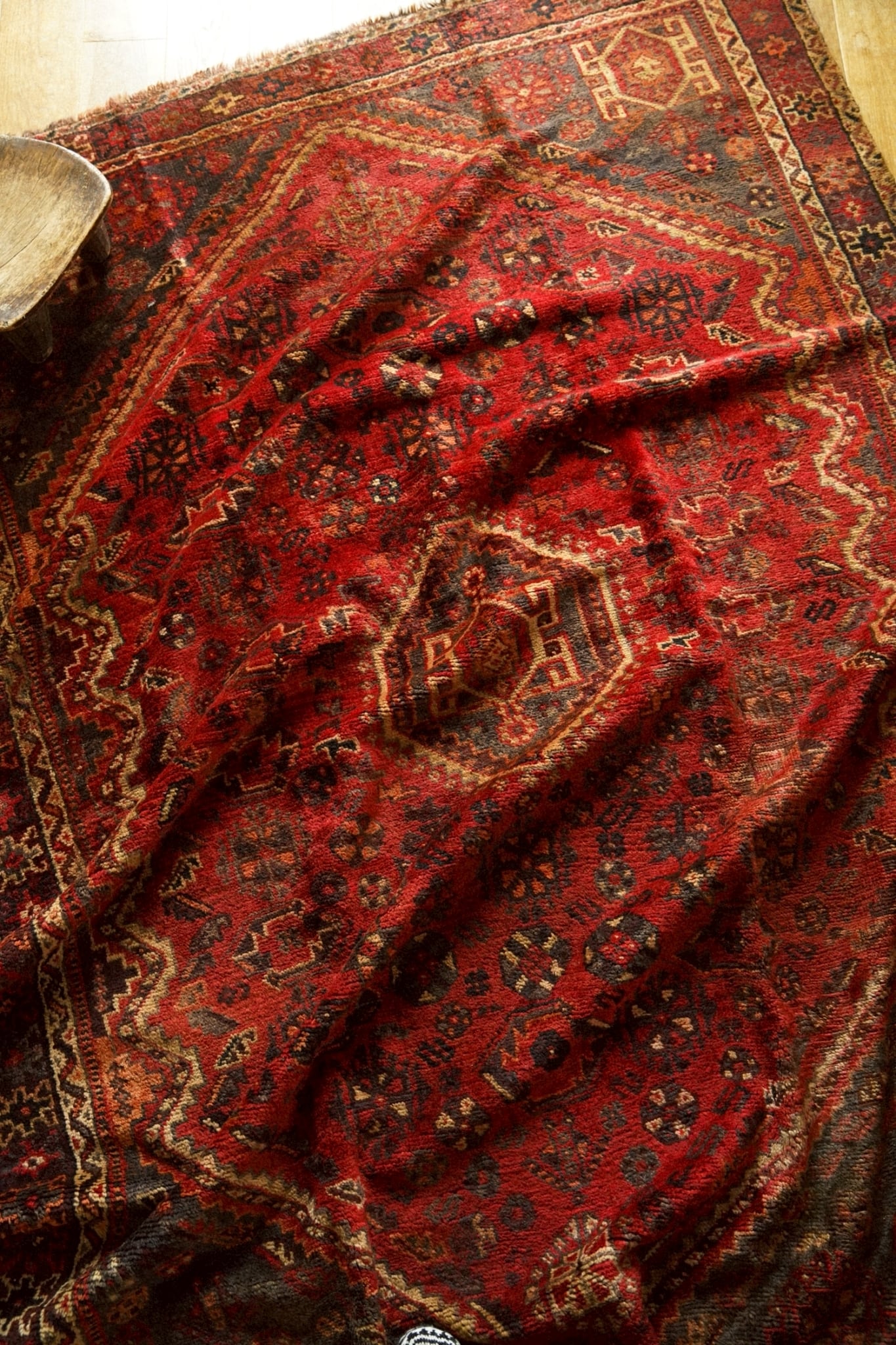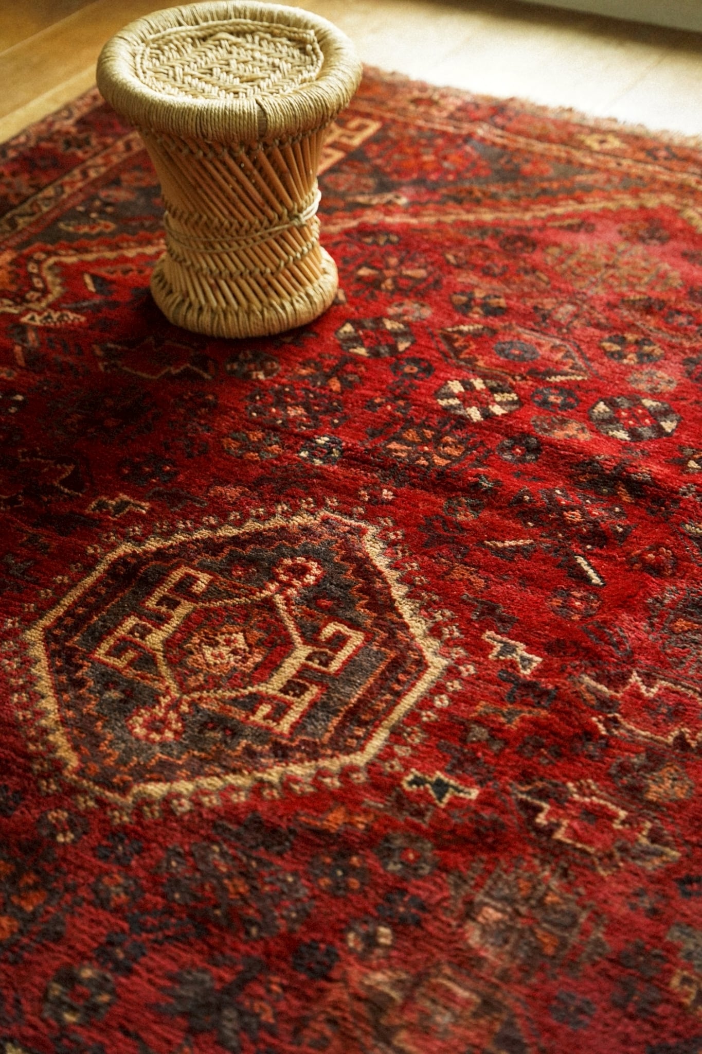 中央のメダリオンを囲むように可愛らしい花文様や生命の樹、八芒星など部族の伝統的なモチーフが一面に織り込まれた華やかな一枚です。