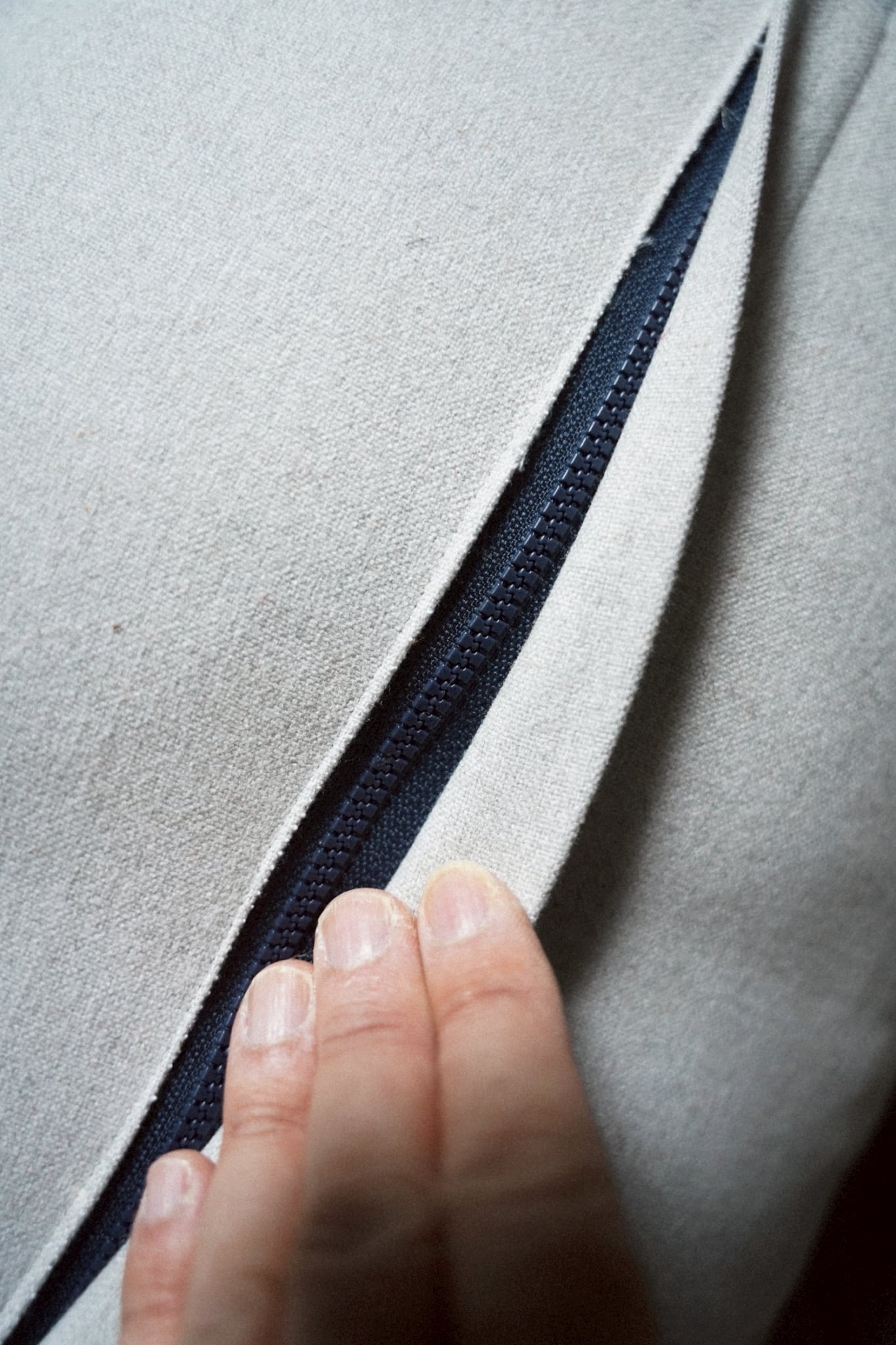 裏地にはライトグレーの無地布を使用し、ファスナー付きで中材の出し入れが可能です。