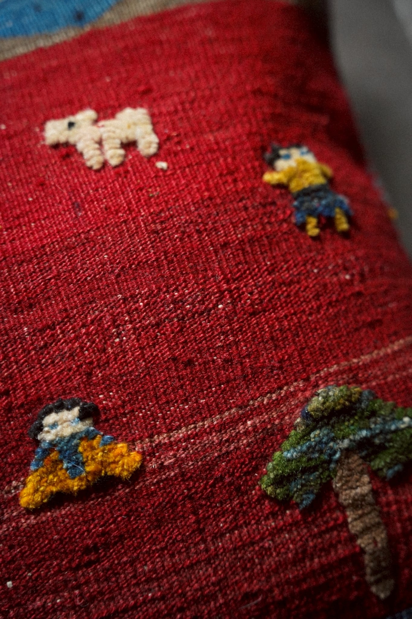 深みのある赤をベースに、山並みや家、人物、動物や木々など、暮らしの情景を思わせるモチーフが散りばめられています。