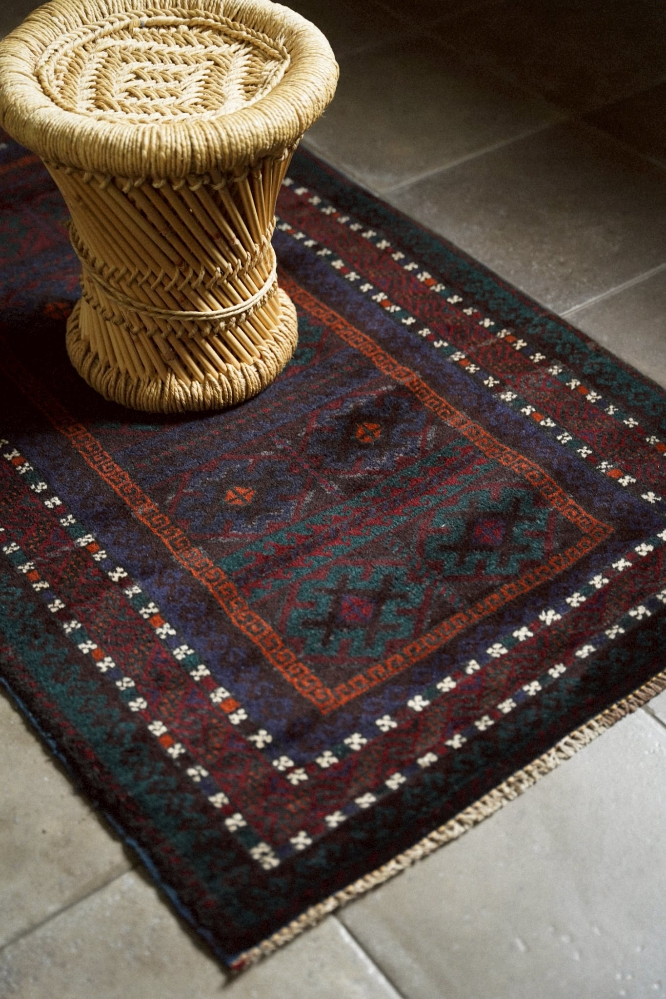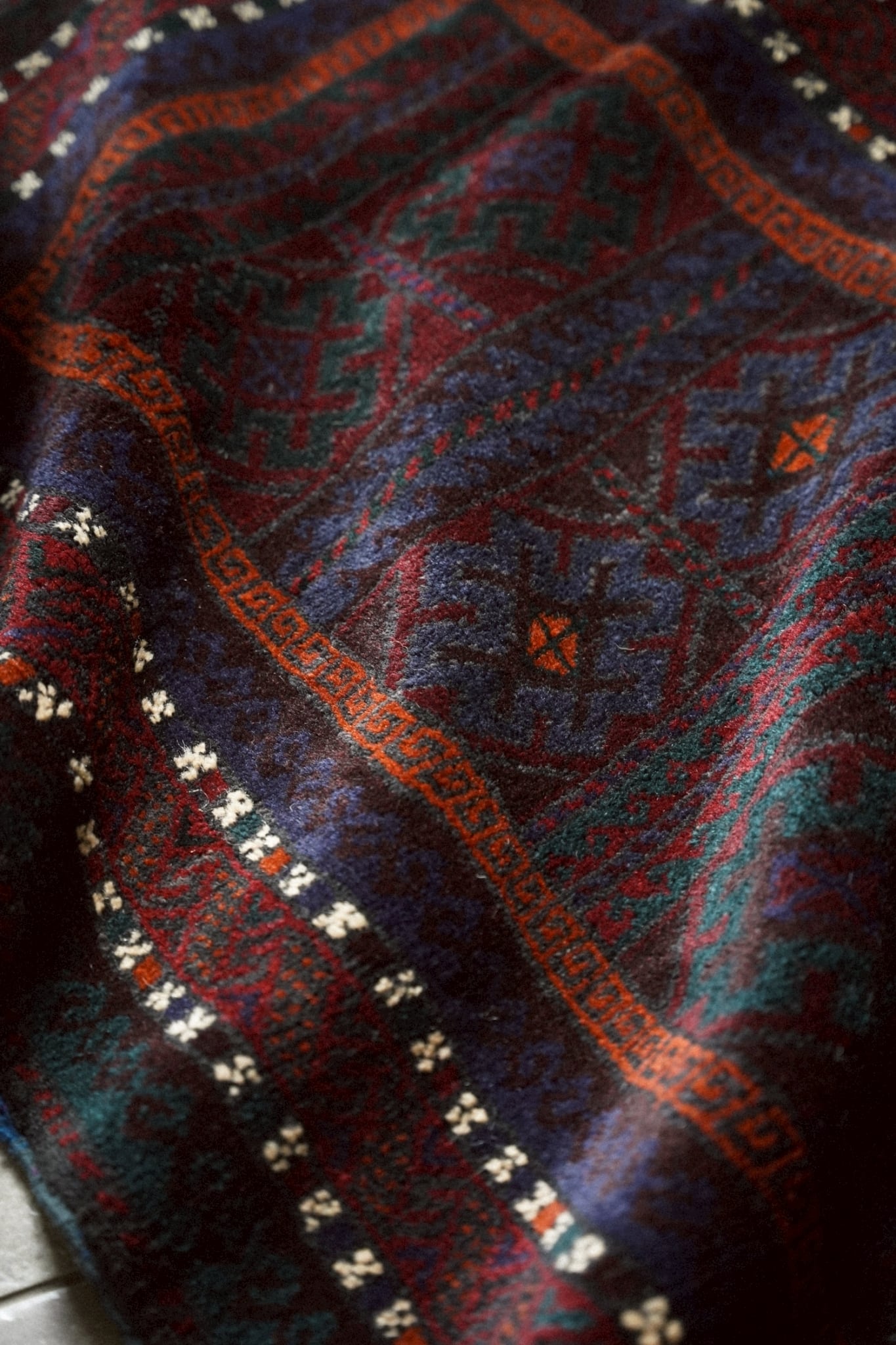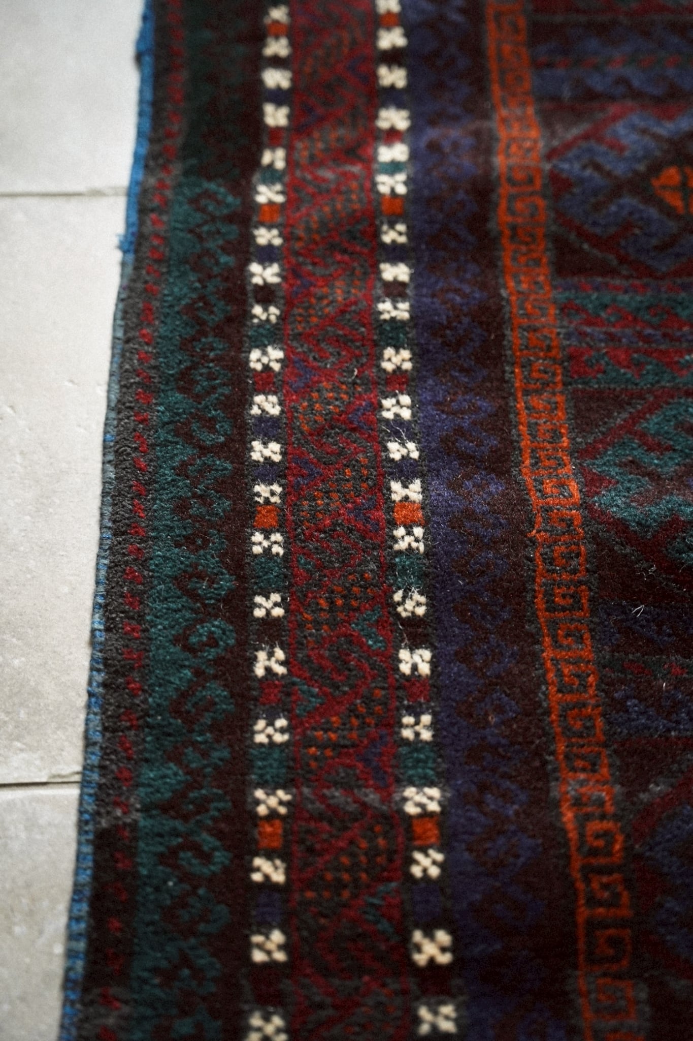ネイビー、ダークグリーン、レッド、ボルドーなどの渋めのカラーリングにボーダー部分を囲むように白い小さなモチーフが浮かび上がるのはバルーチ族のデザインの特徴です。
