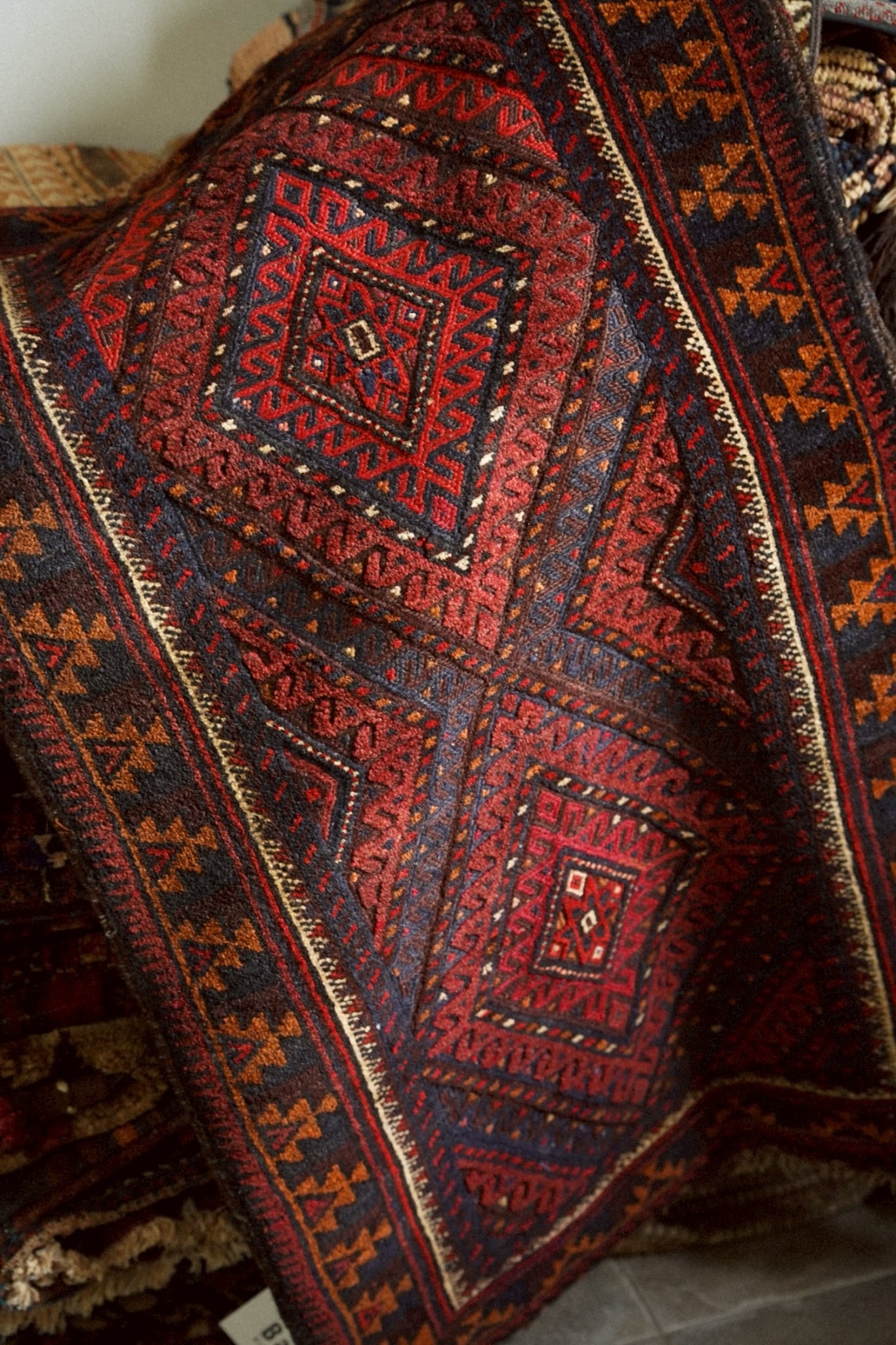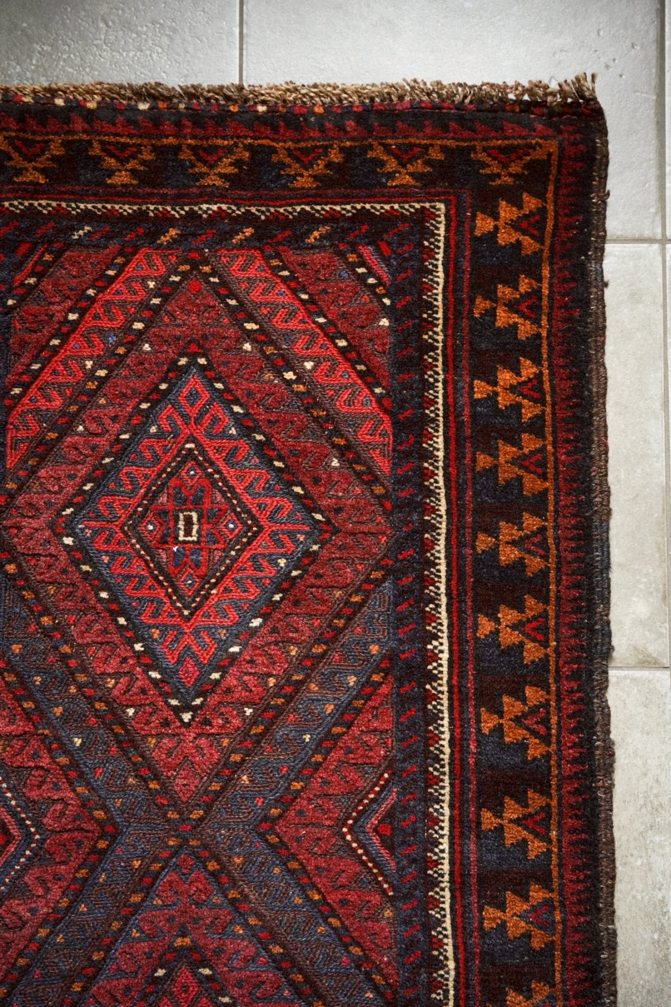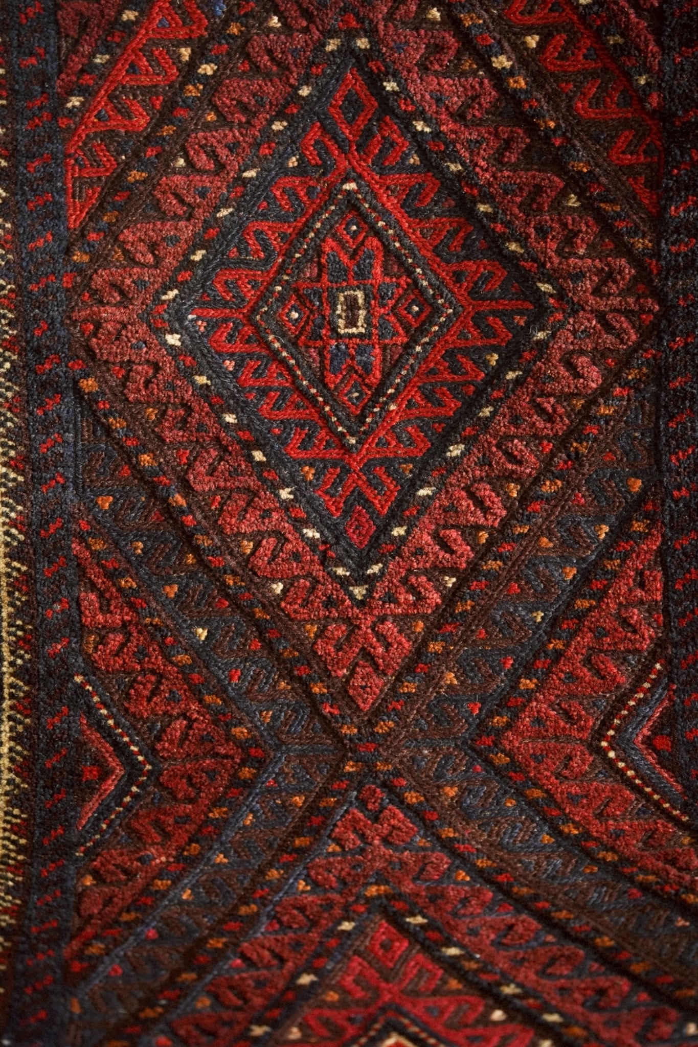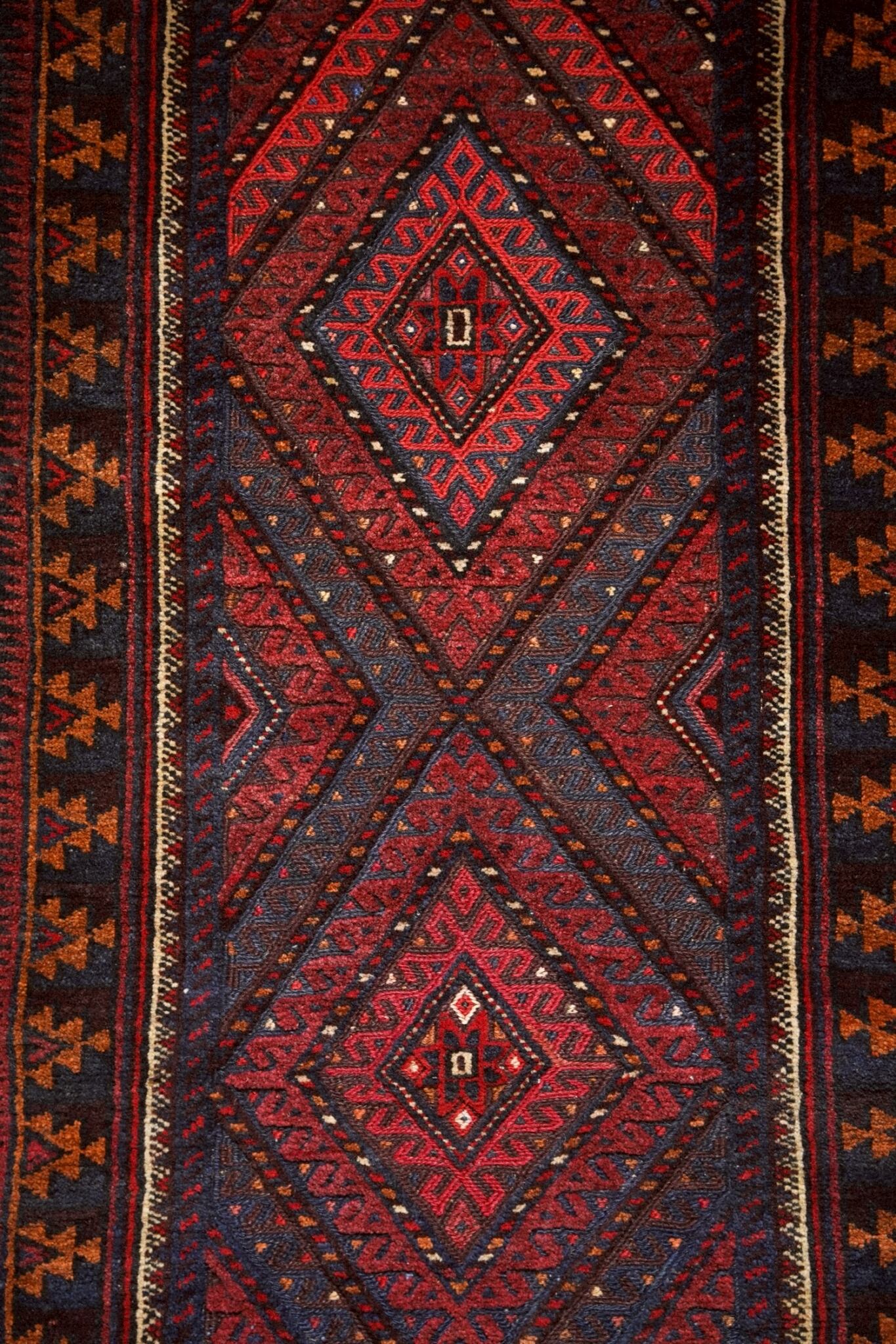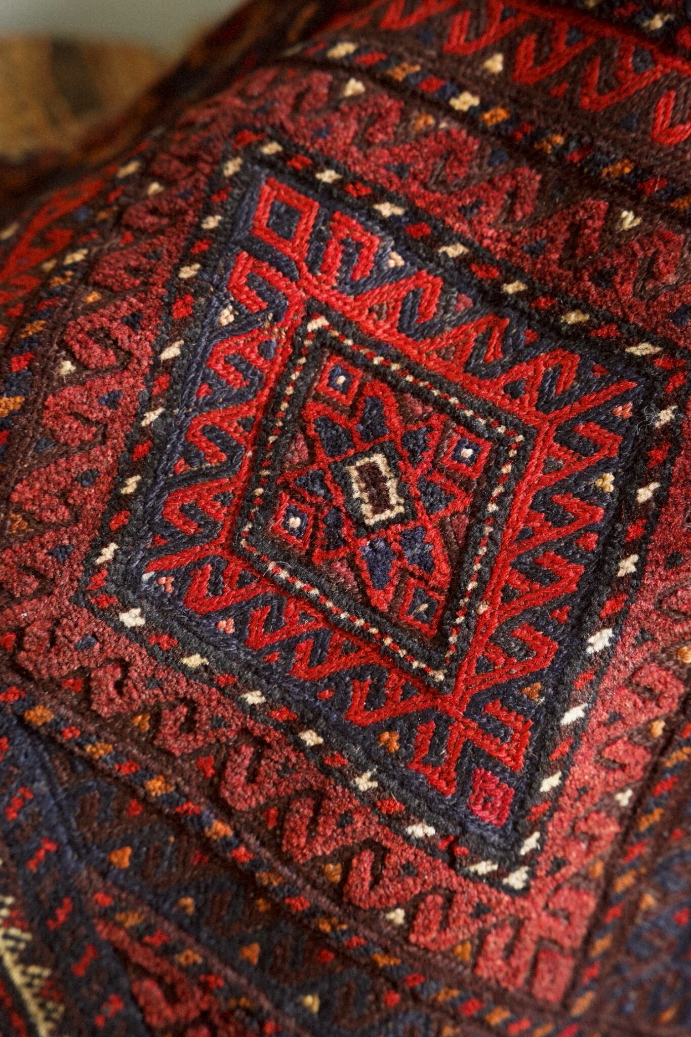 レッド、ネイビー、オレンジ、ボルドーの落ち着いた色味で描かれた菱形メダリオン。