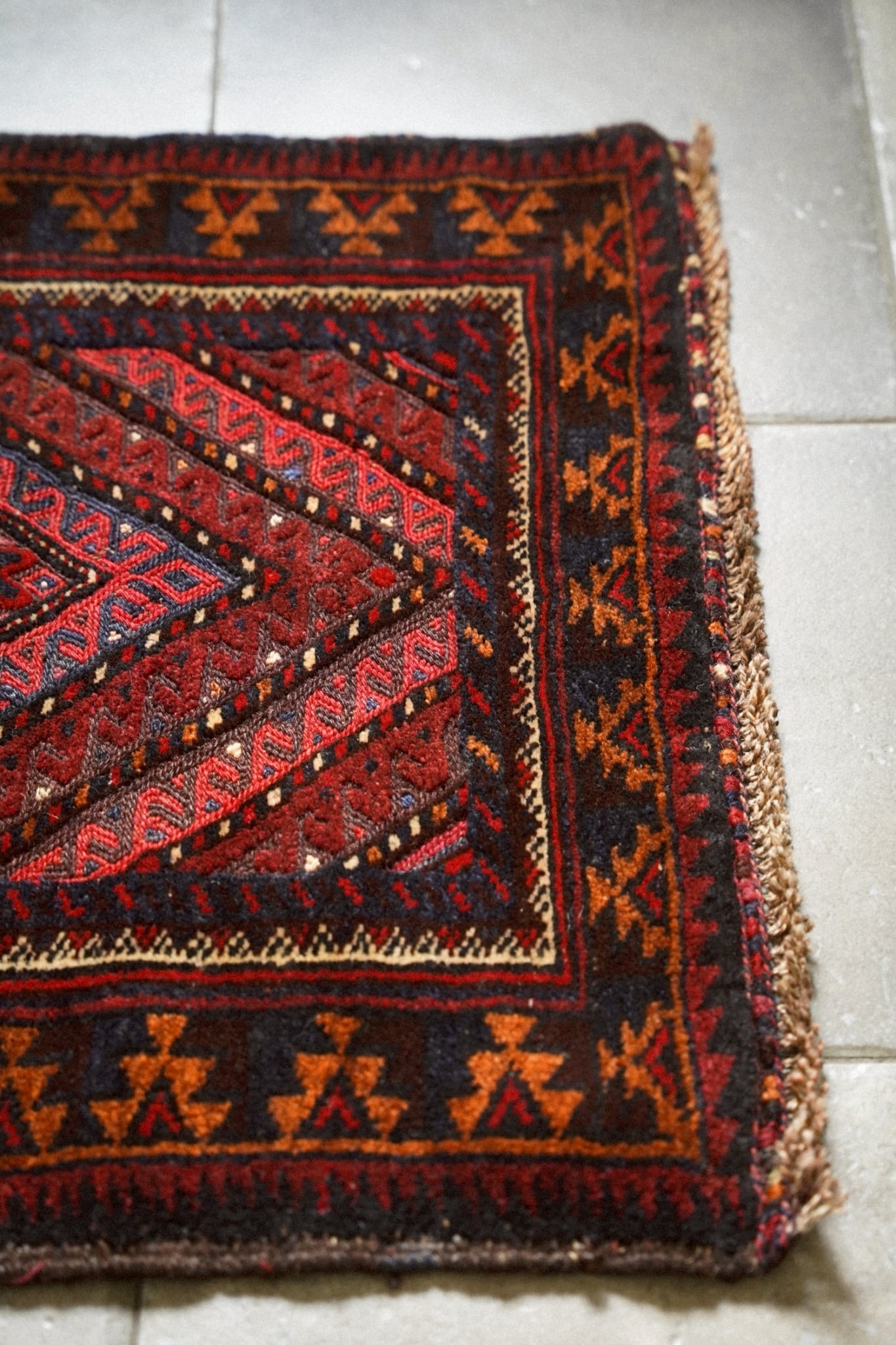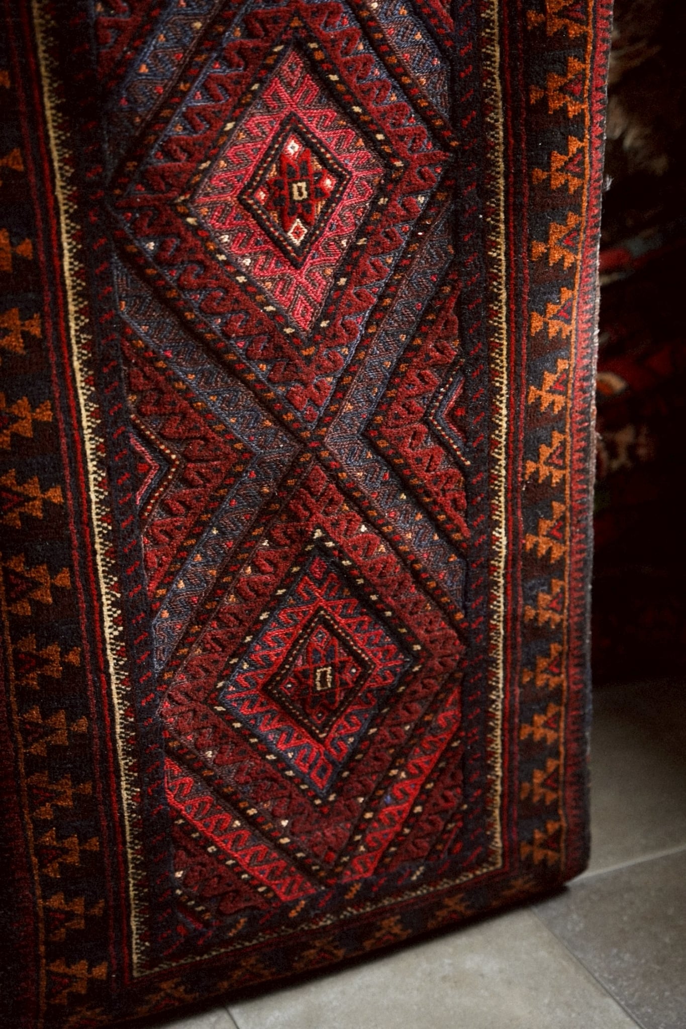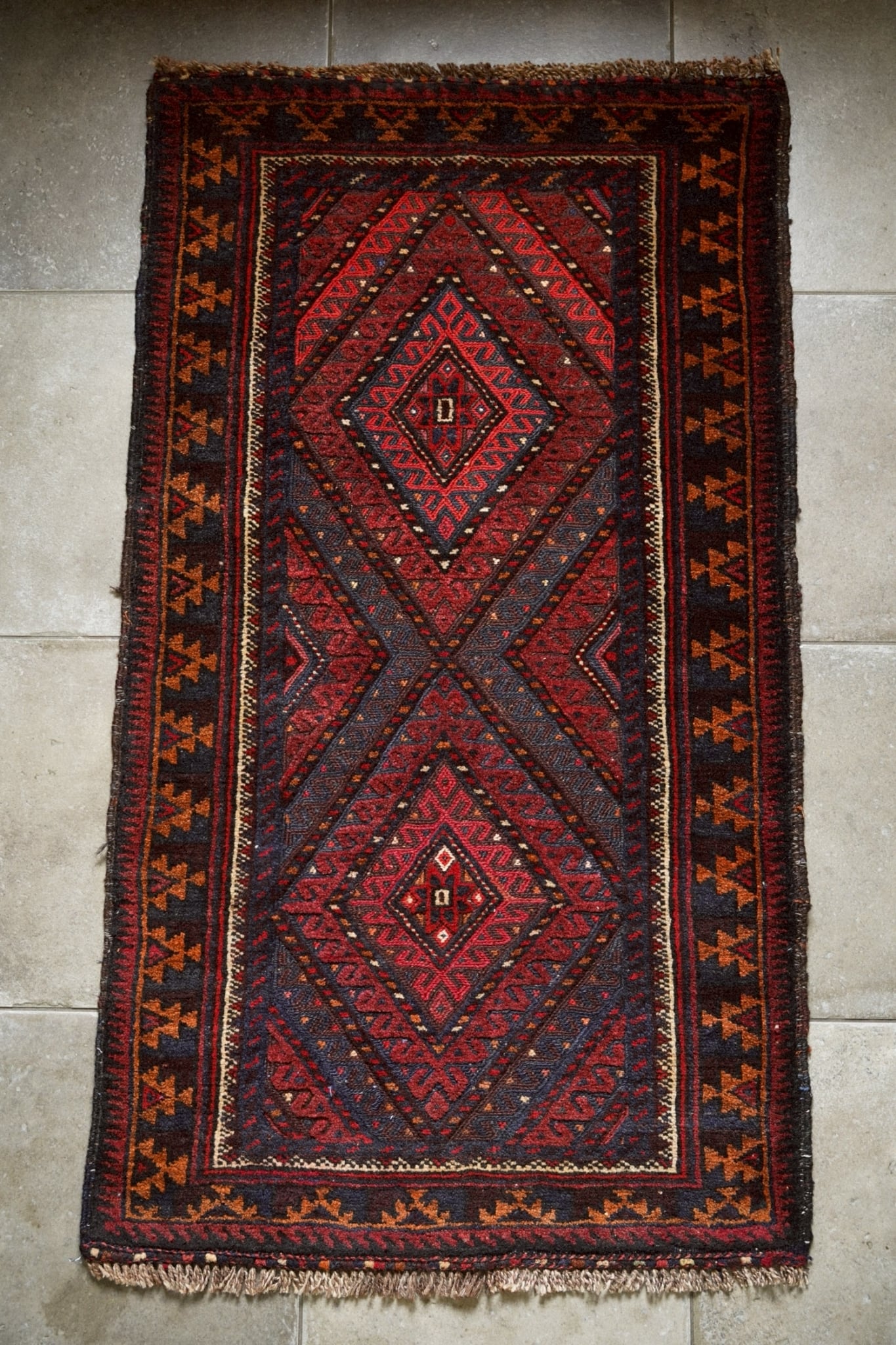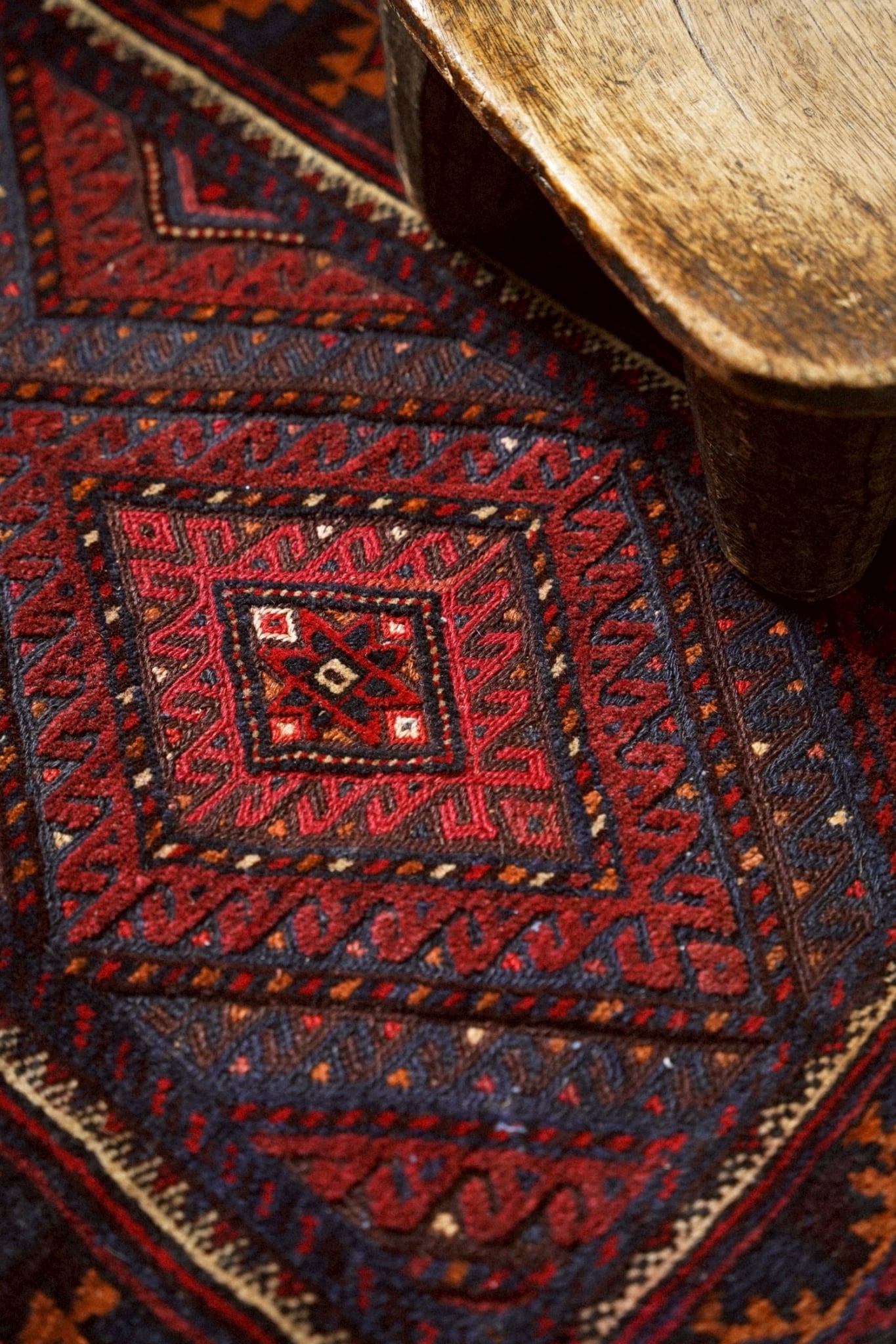 レッド、ネイビー、オレンジ、ボルドーの落ち着いた色味で描かれた菱形メダリオン。