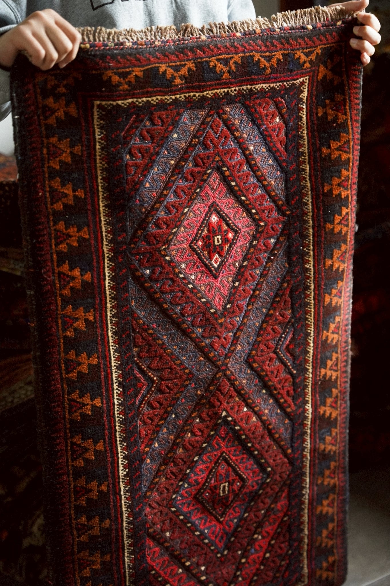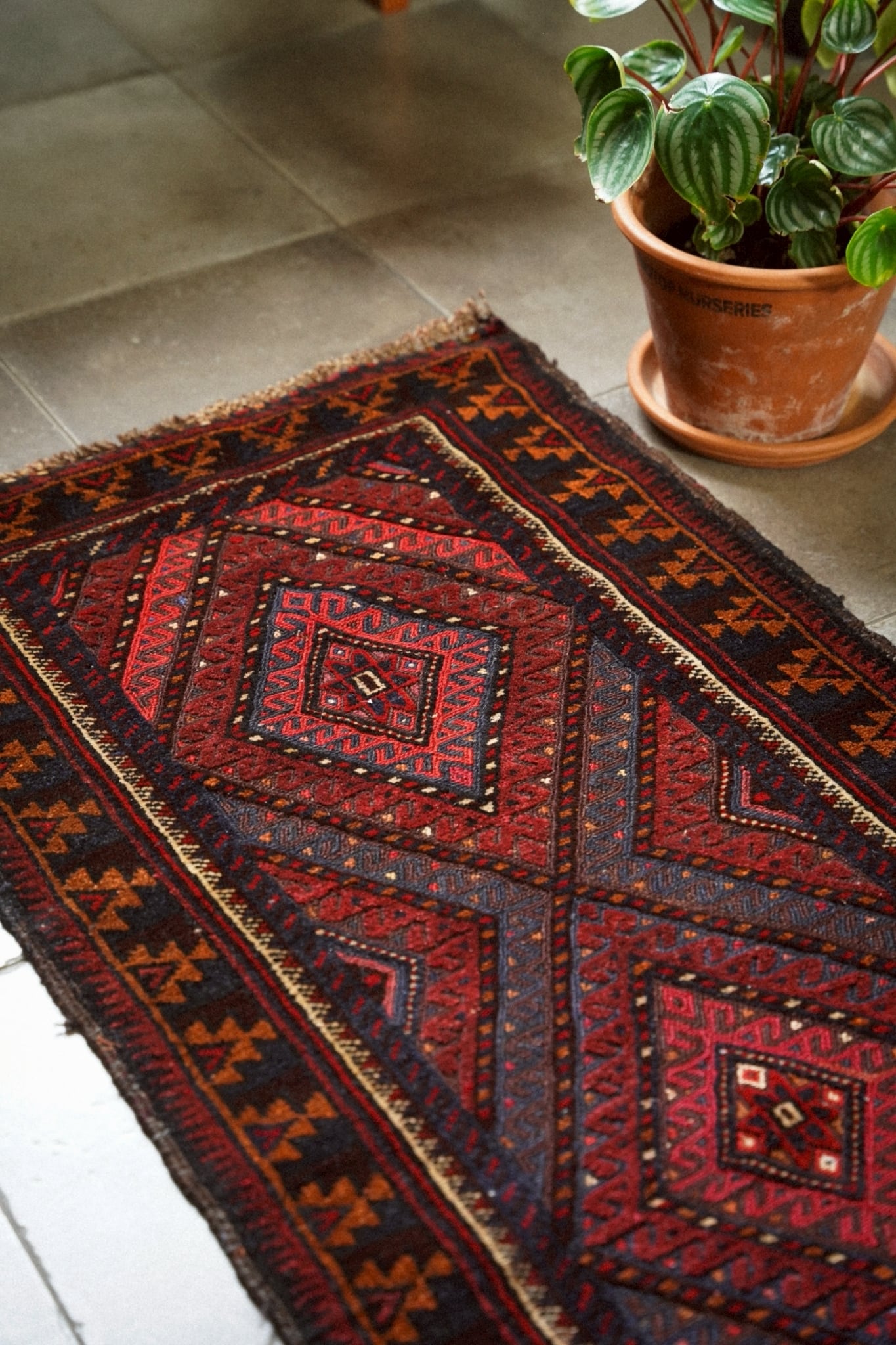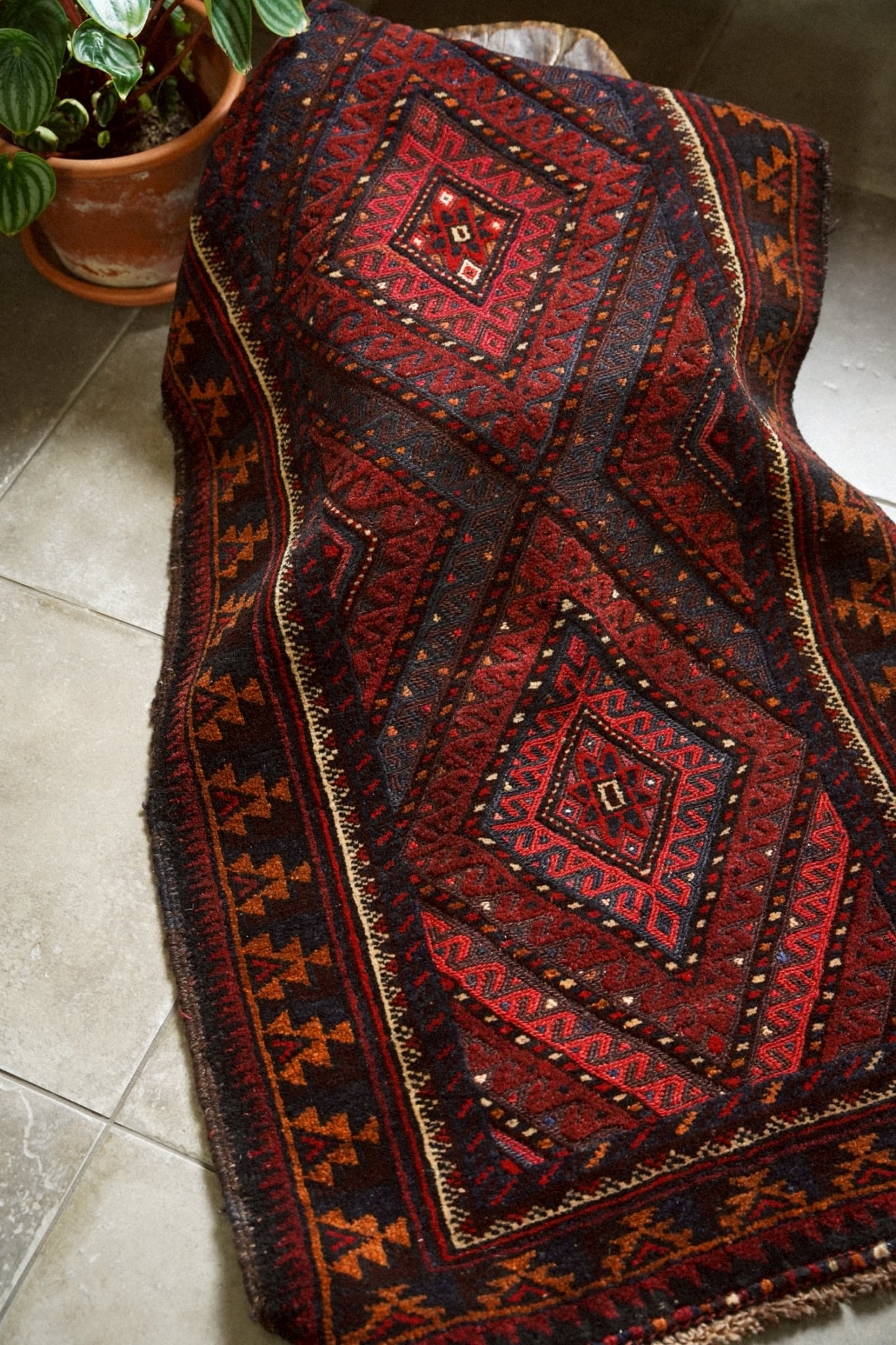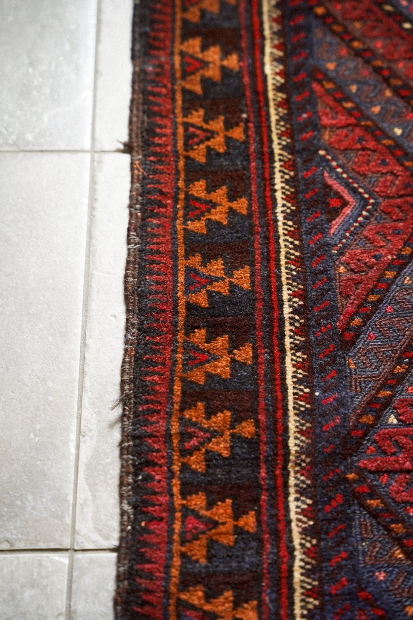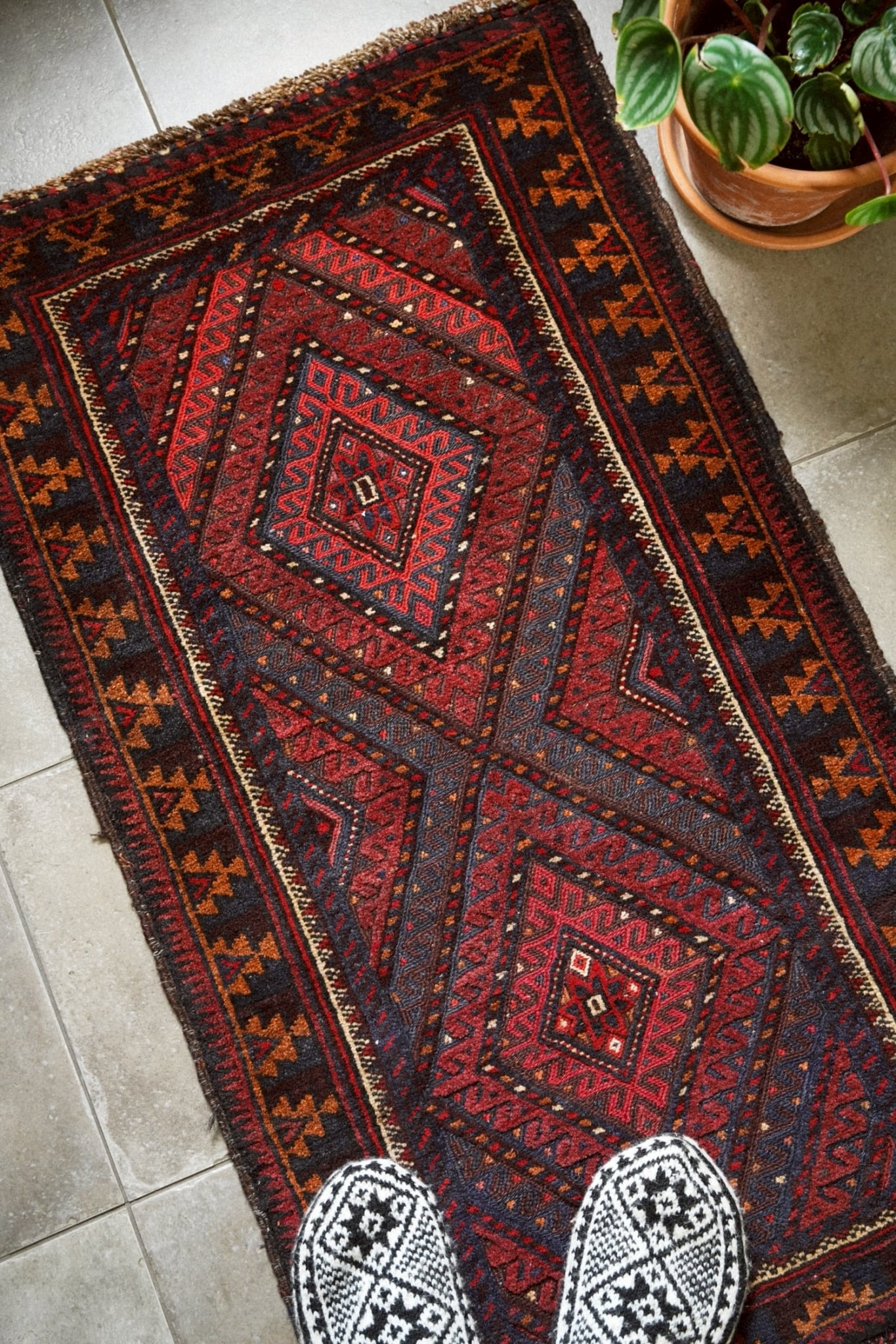レッド、ネイビー、オレンジ、ボルドーの落ち着いた色味で描かれた菱形メダリオン。