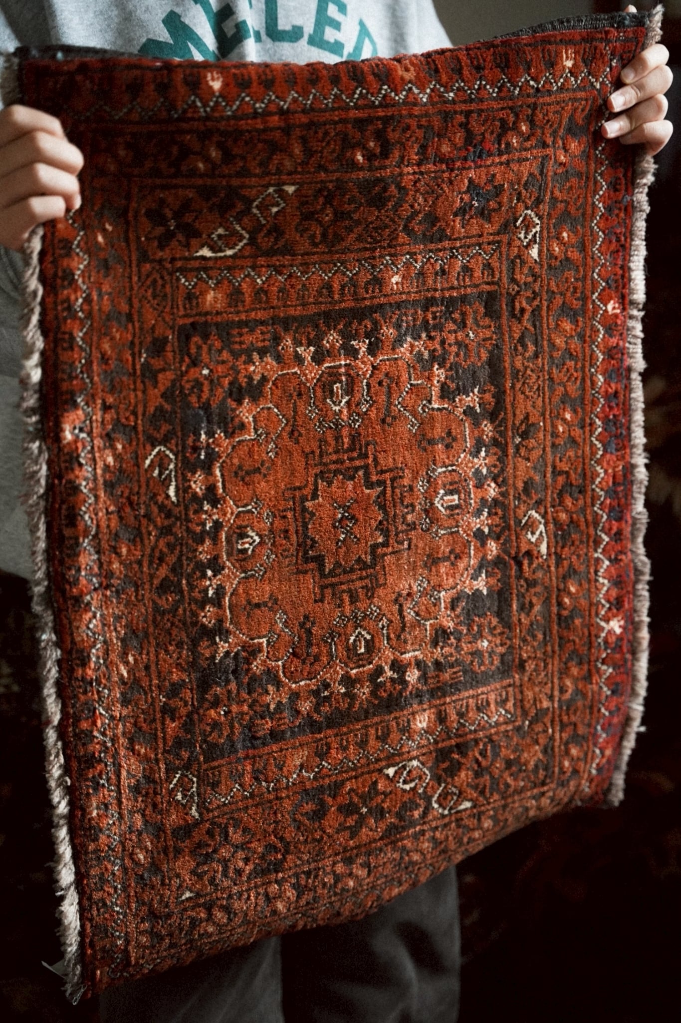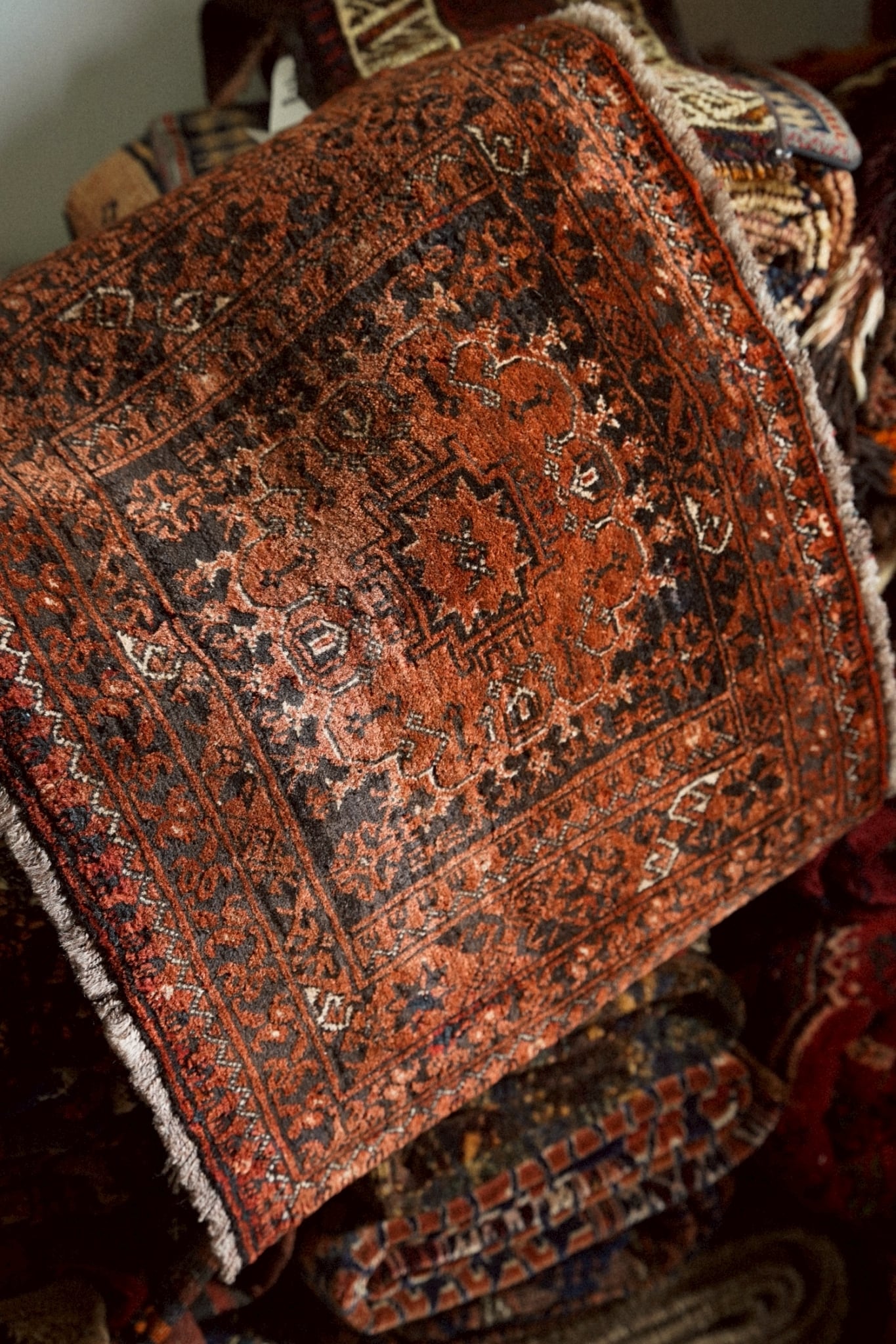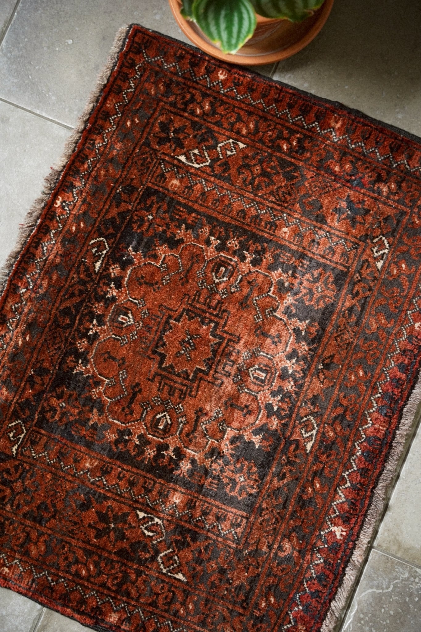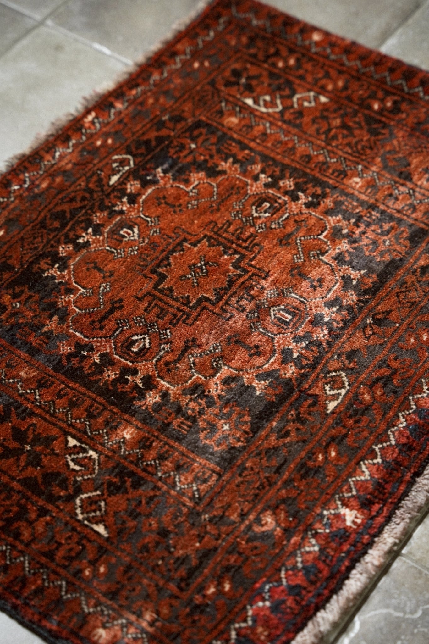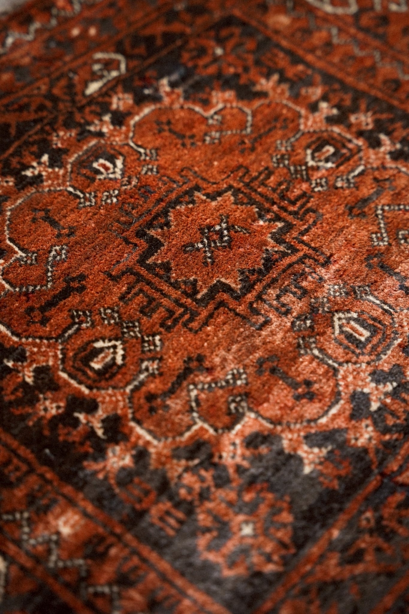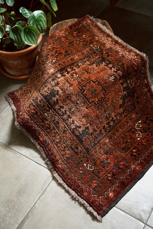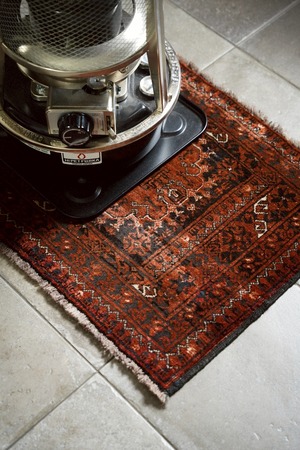 経年によってパイルが低い箇所もありますが、それもまたヴィンテージラグならではの表情。