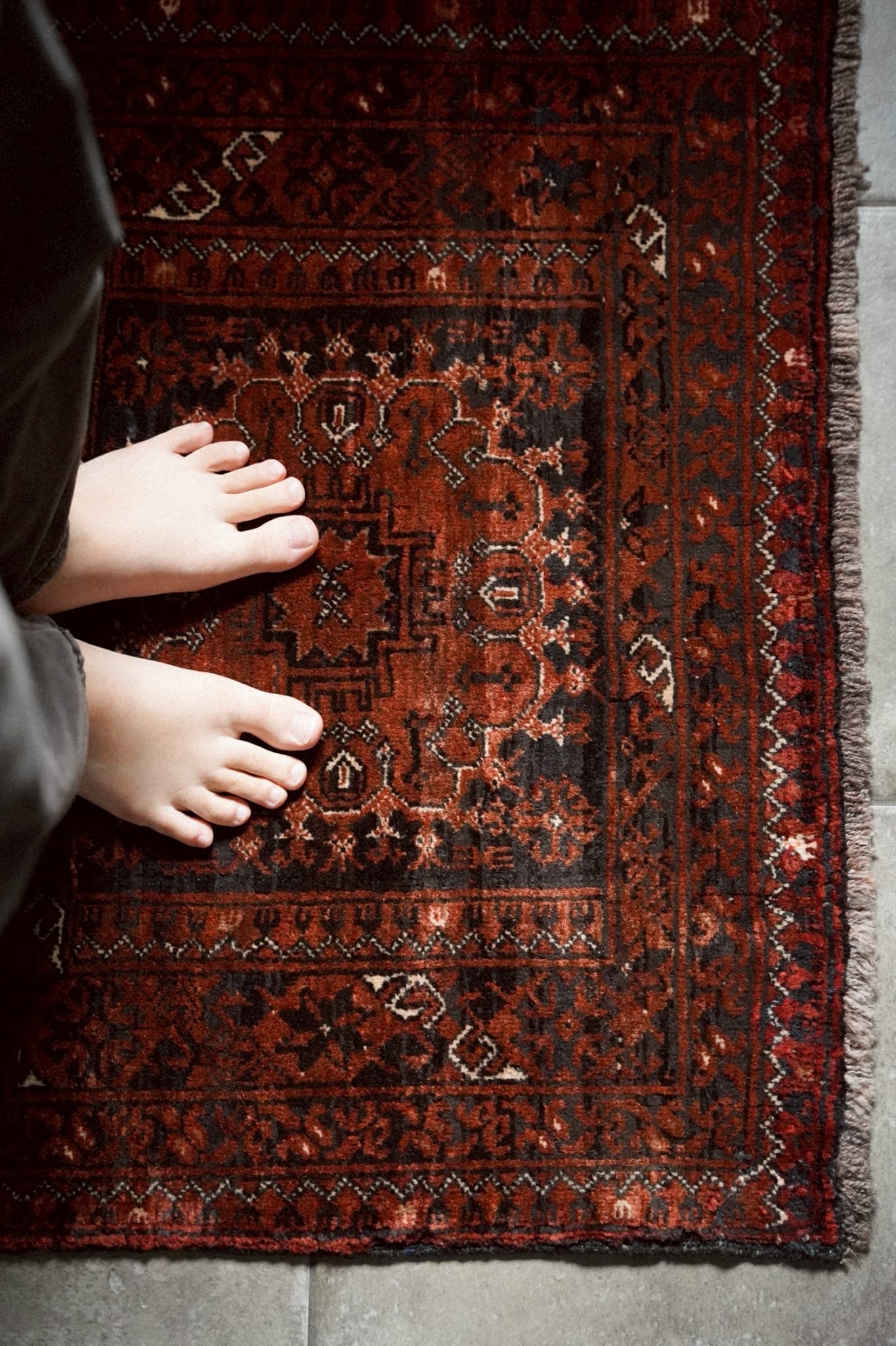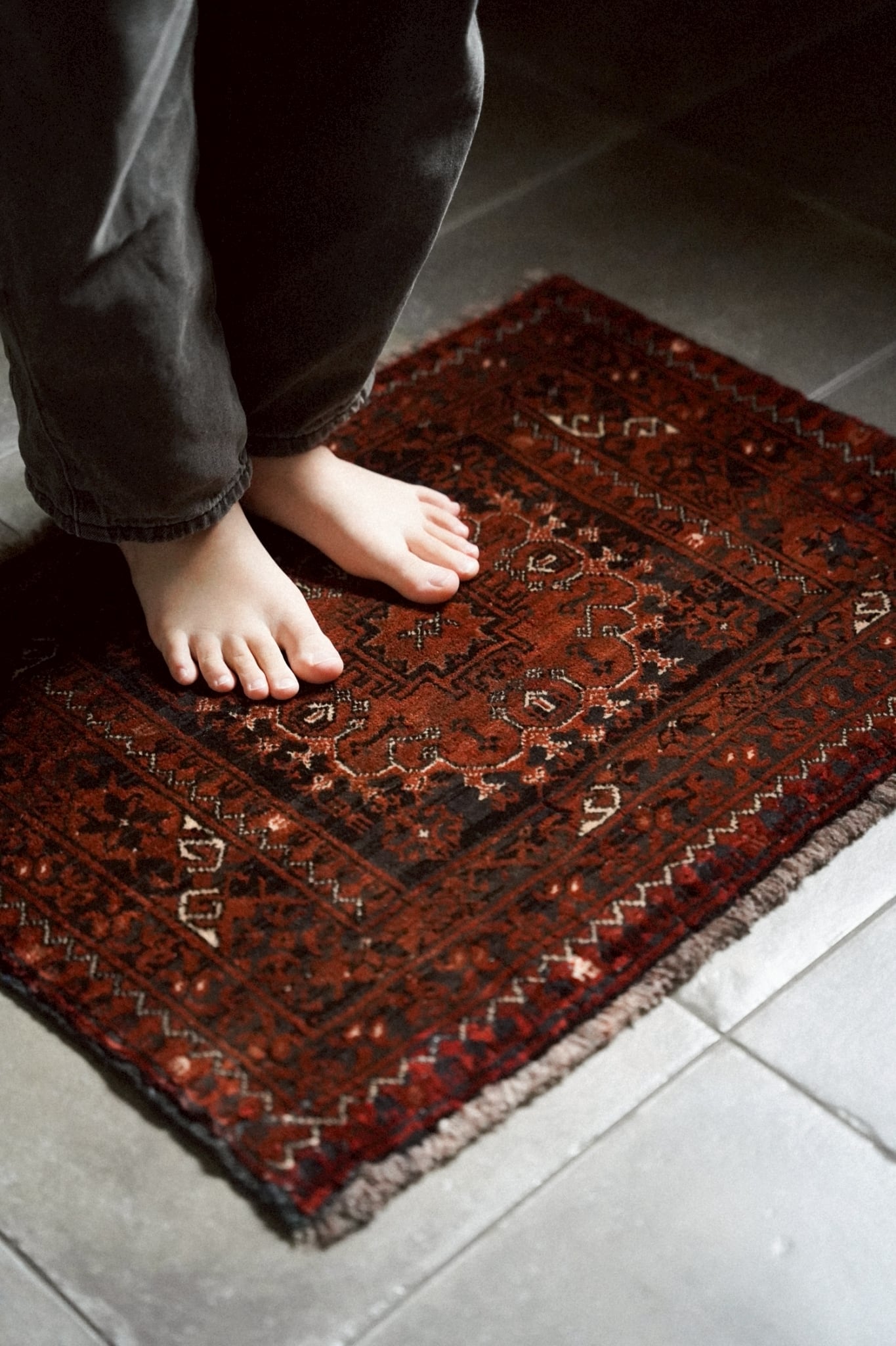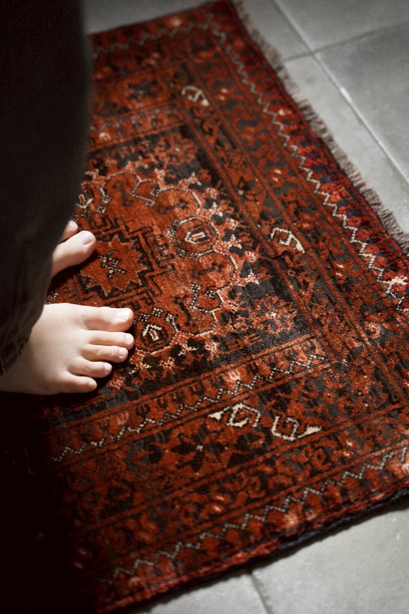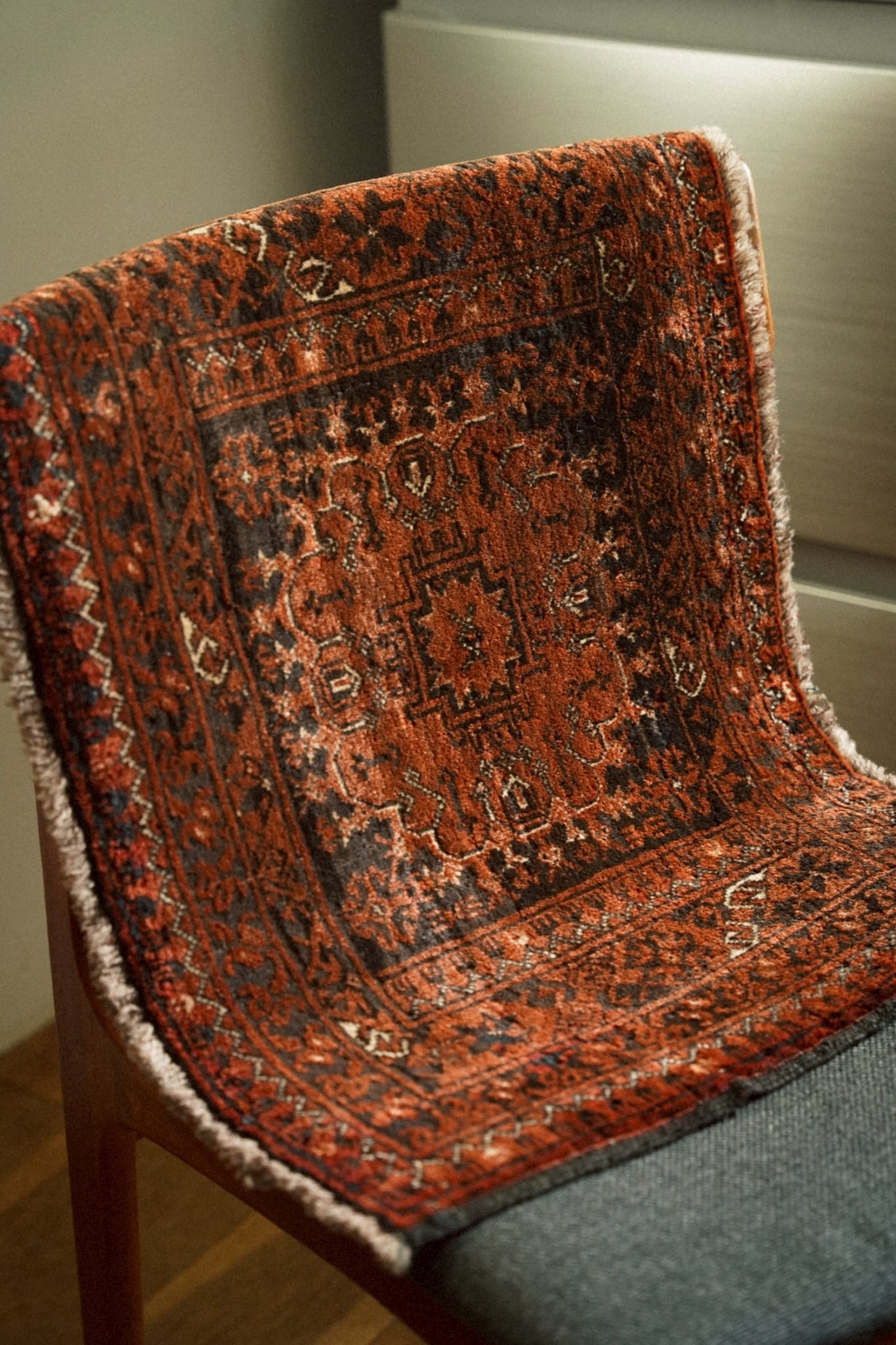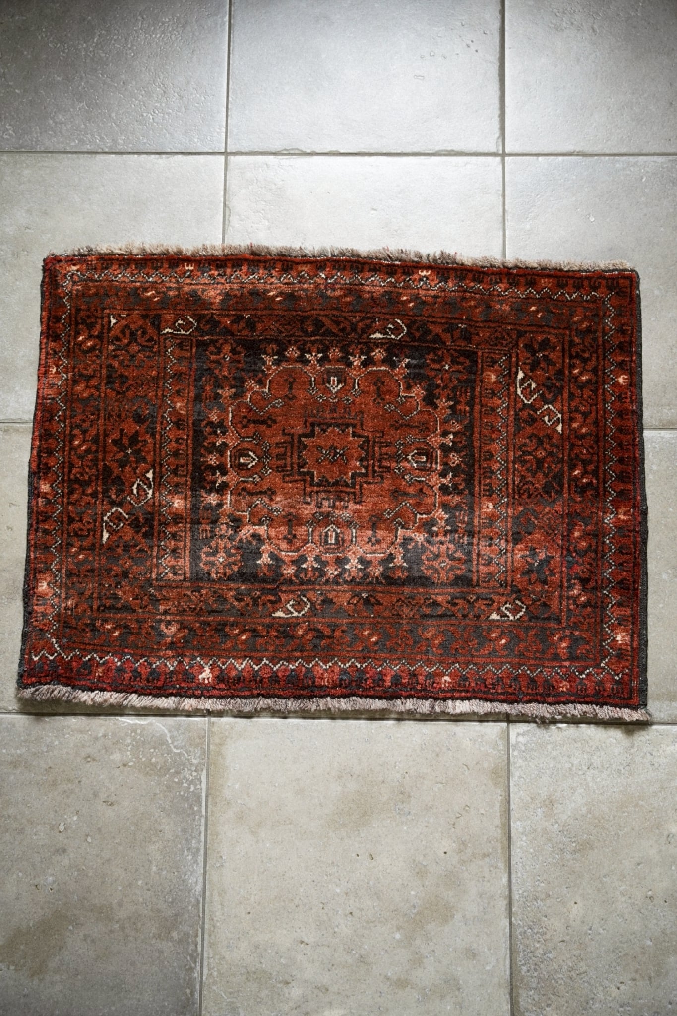 経年によってパイルが低い箇所もありますが、それもまたヴィンテージラグならではの表情。
