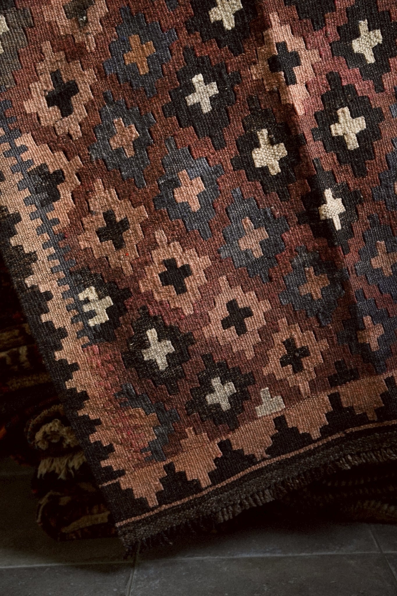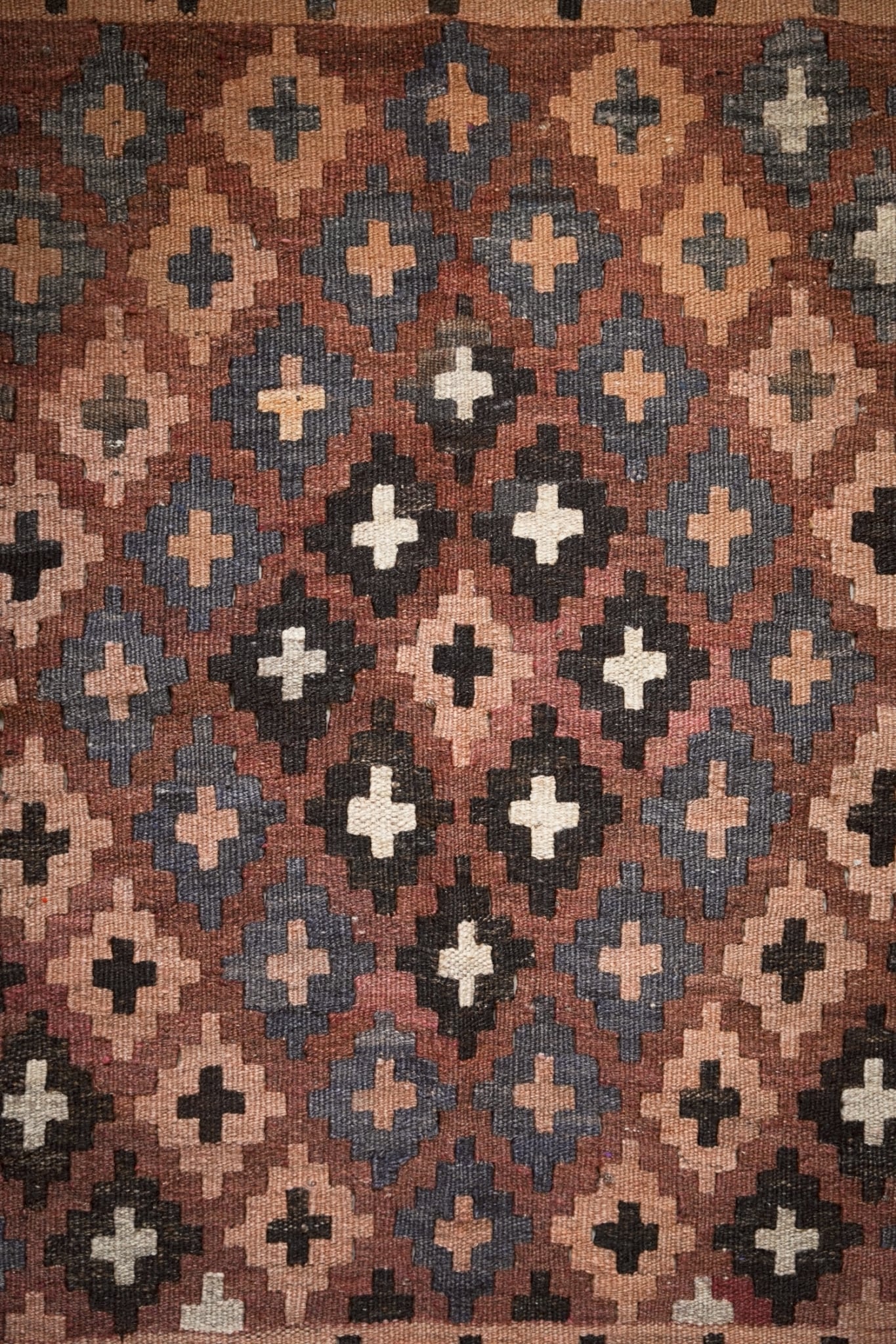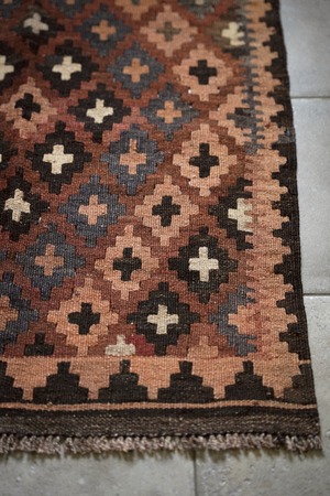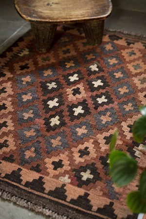 1970年代に織られたアフガニスタンのマイマナ産のキリム。落ち着きのある深みのある色合いが静かな存在感を放つ一枚。