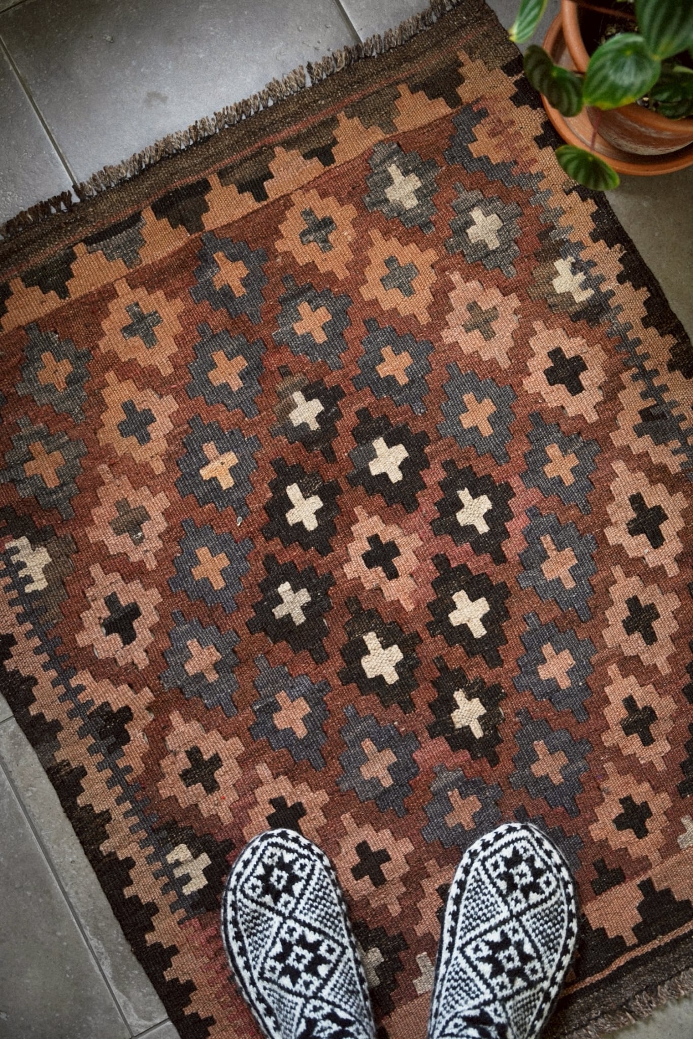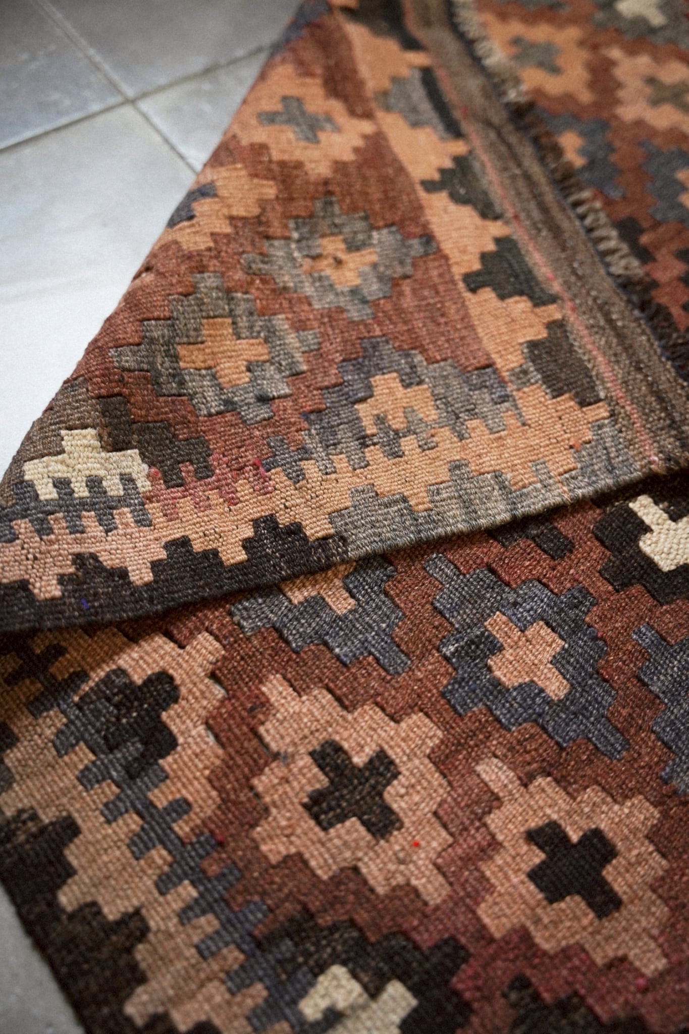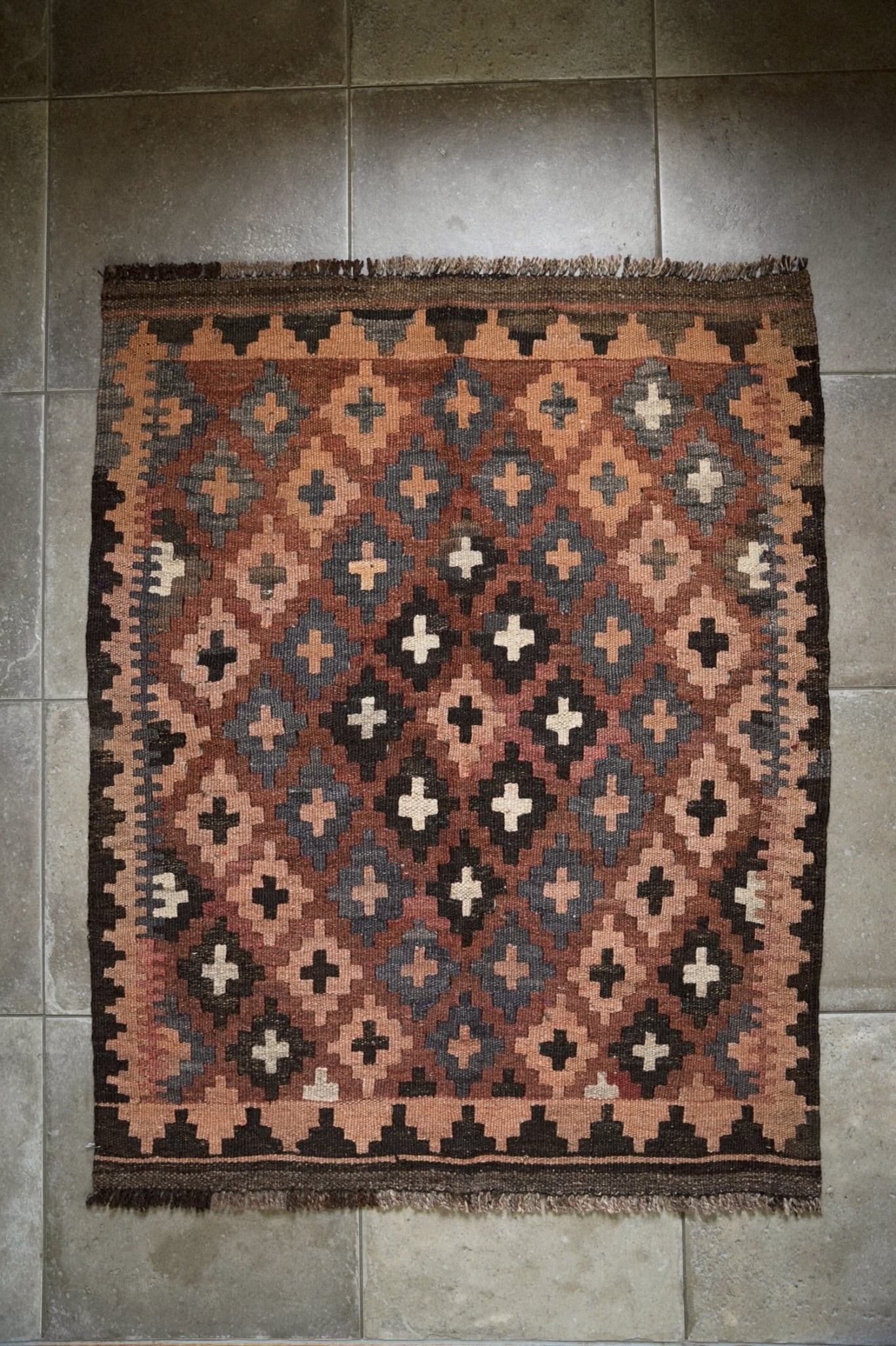 1970年代に織られたアフガニスタンのマイマナ産のキリム。落ち着きのある深みのある色合いが静かな存在感を放つ一枚。