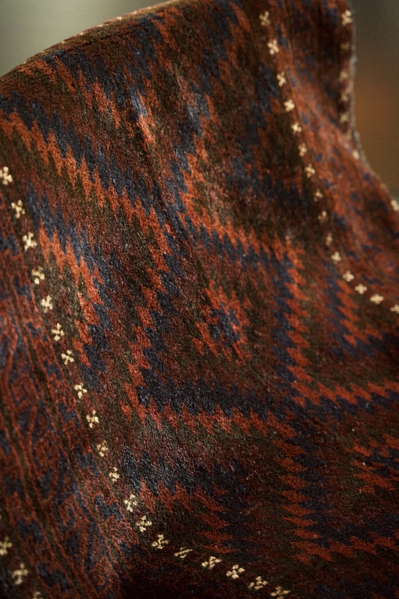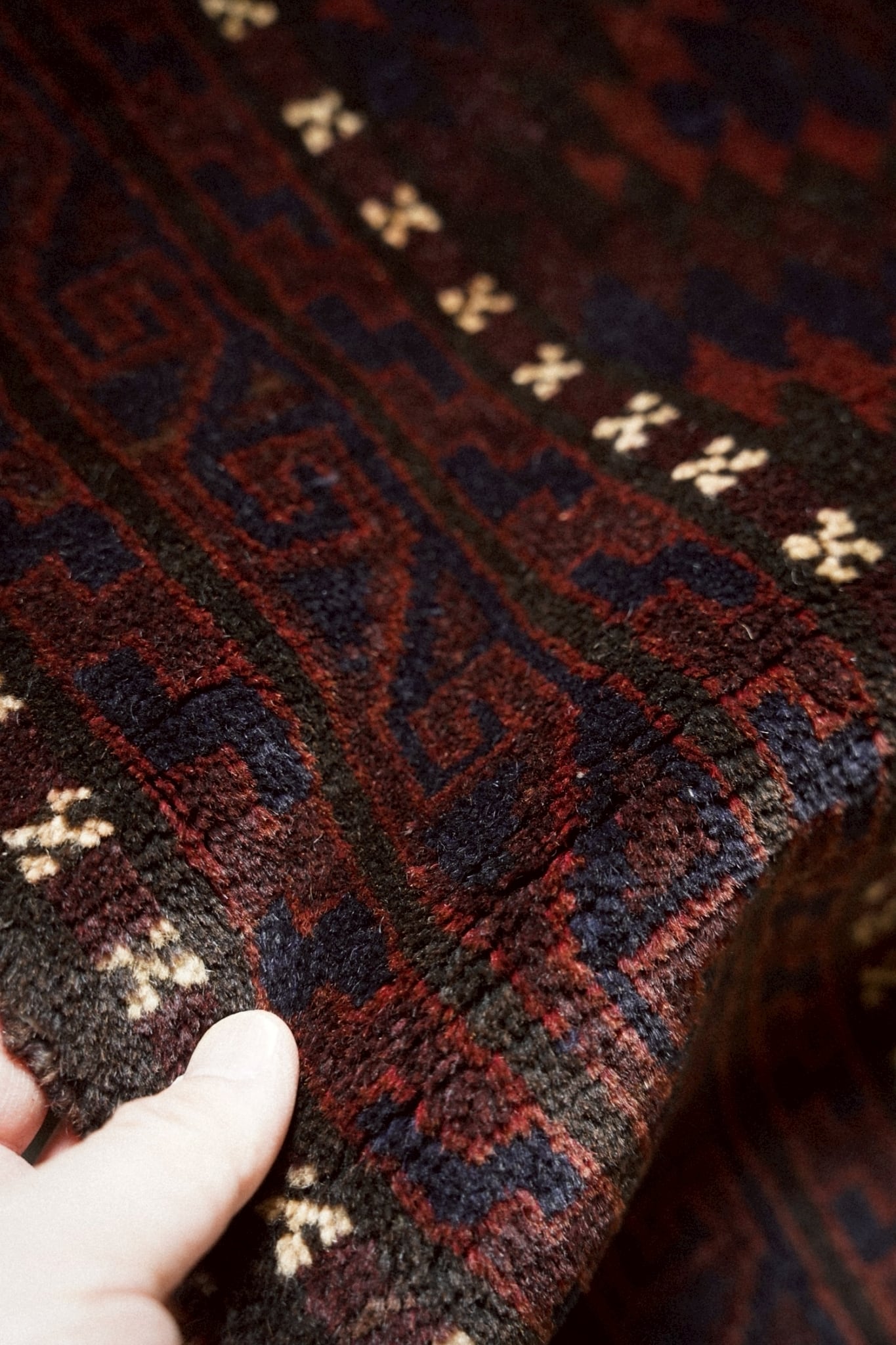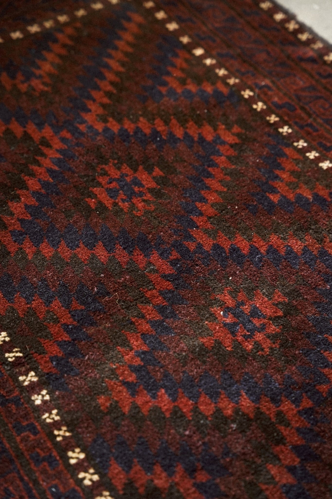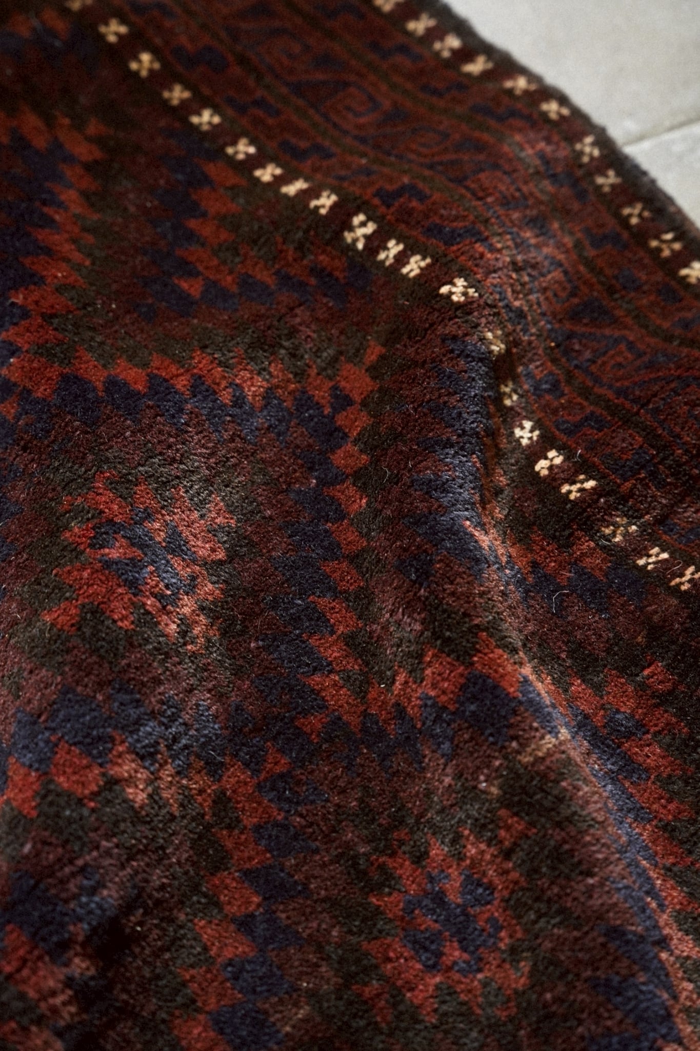 ボーダー部分を囲むように白い小さなモチーフが浮かび上がるのはバルーチ族の特徴的なデザイン。