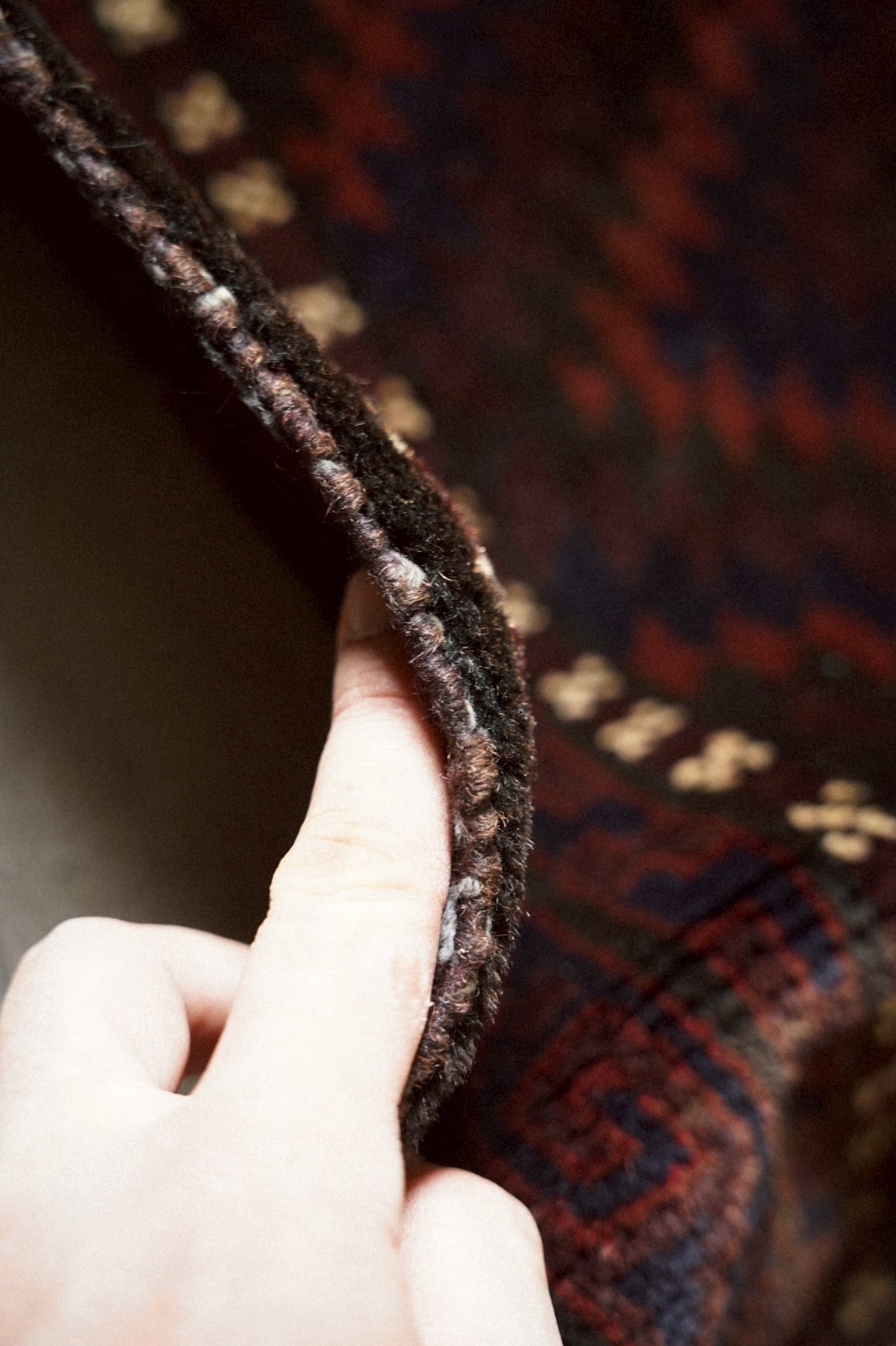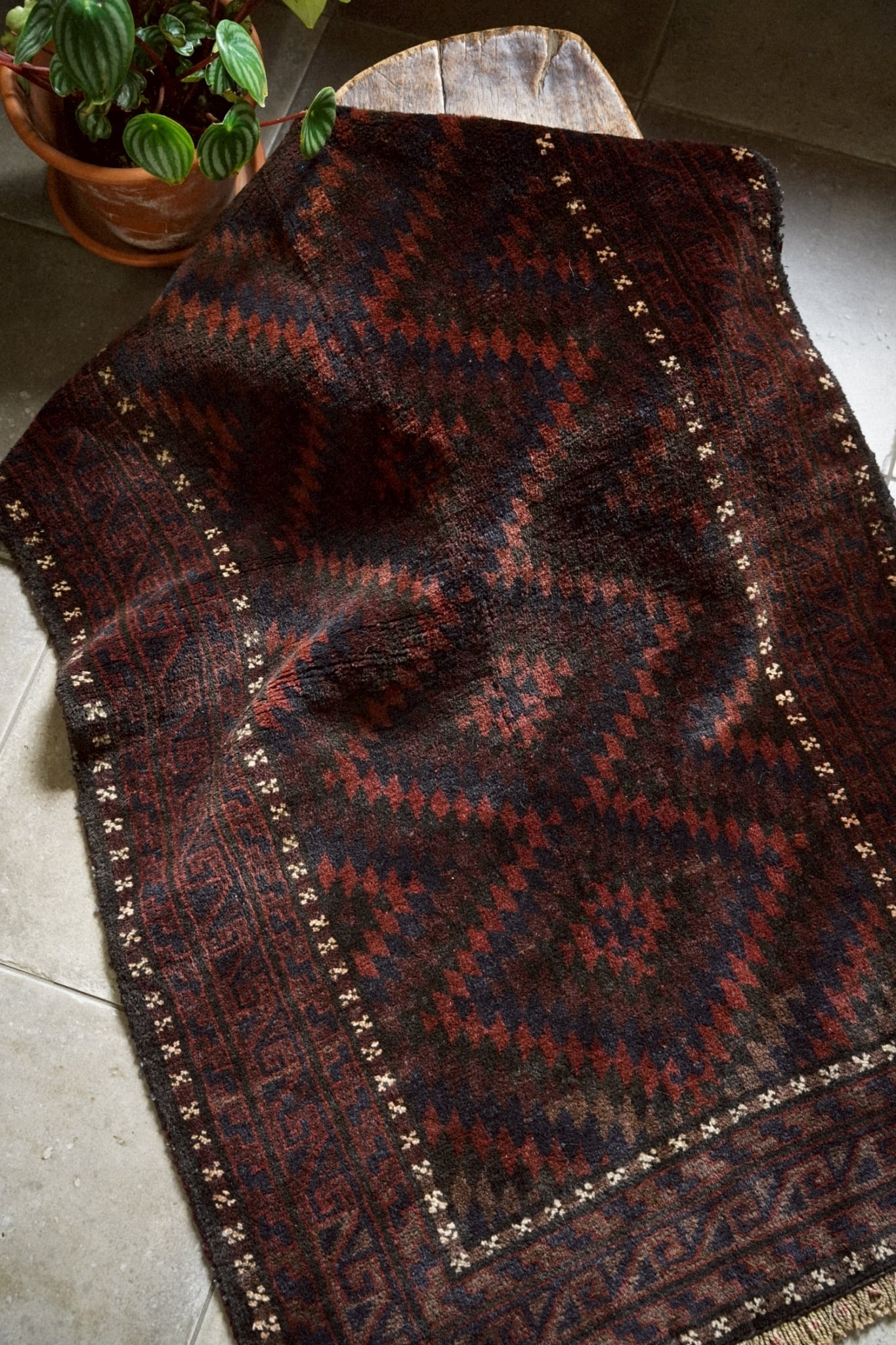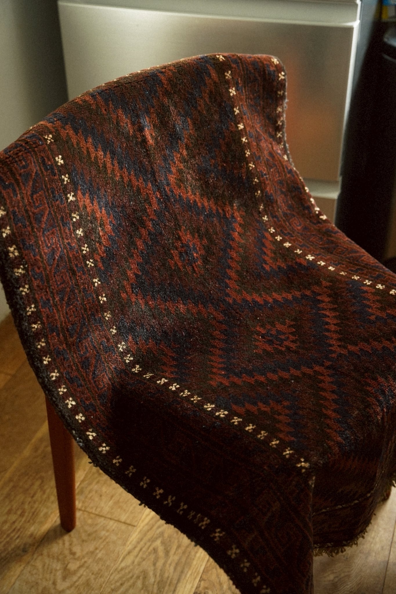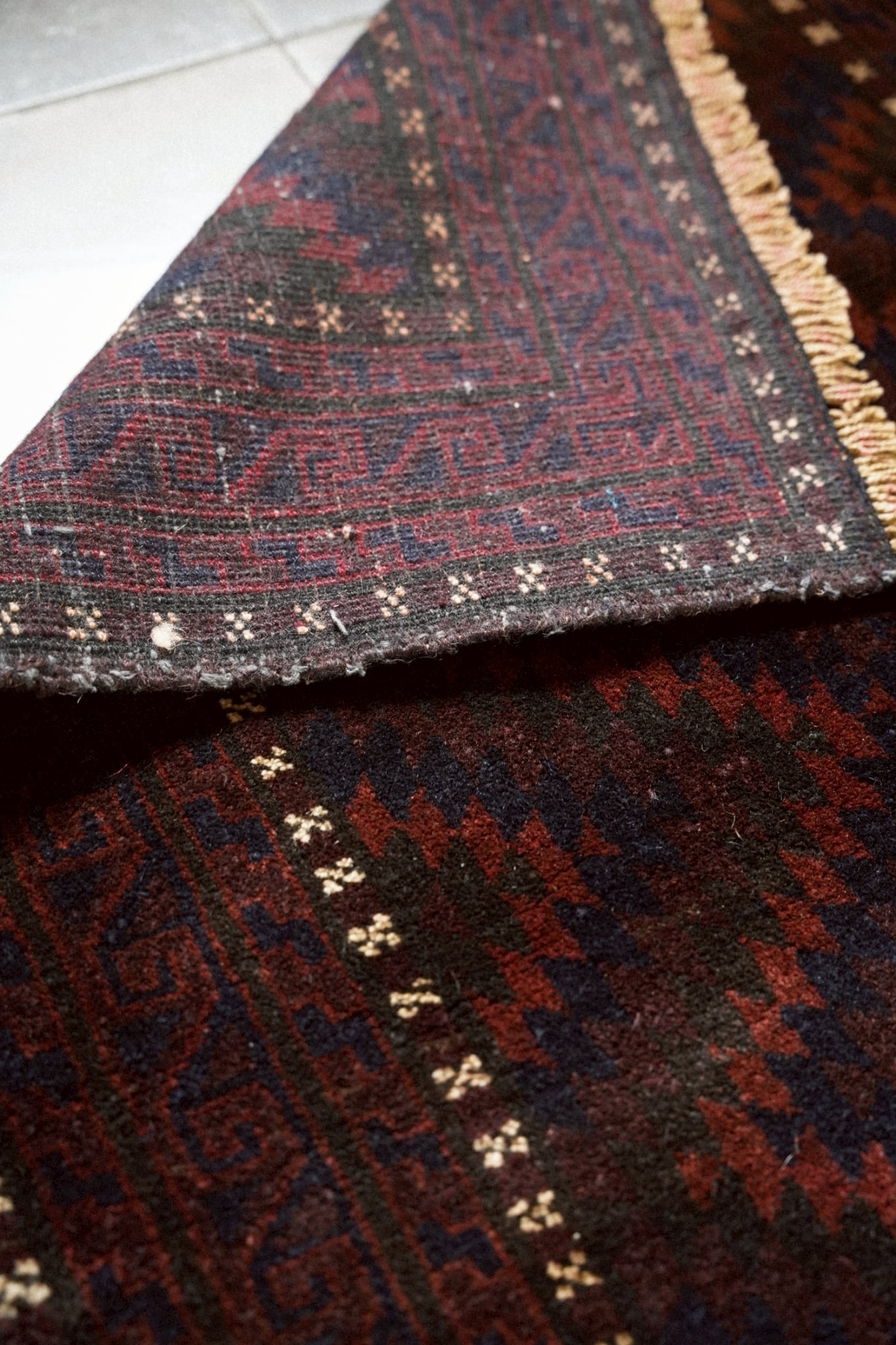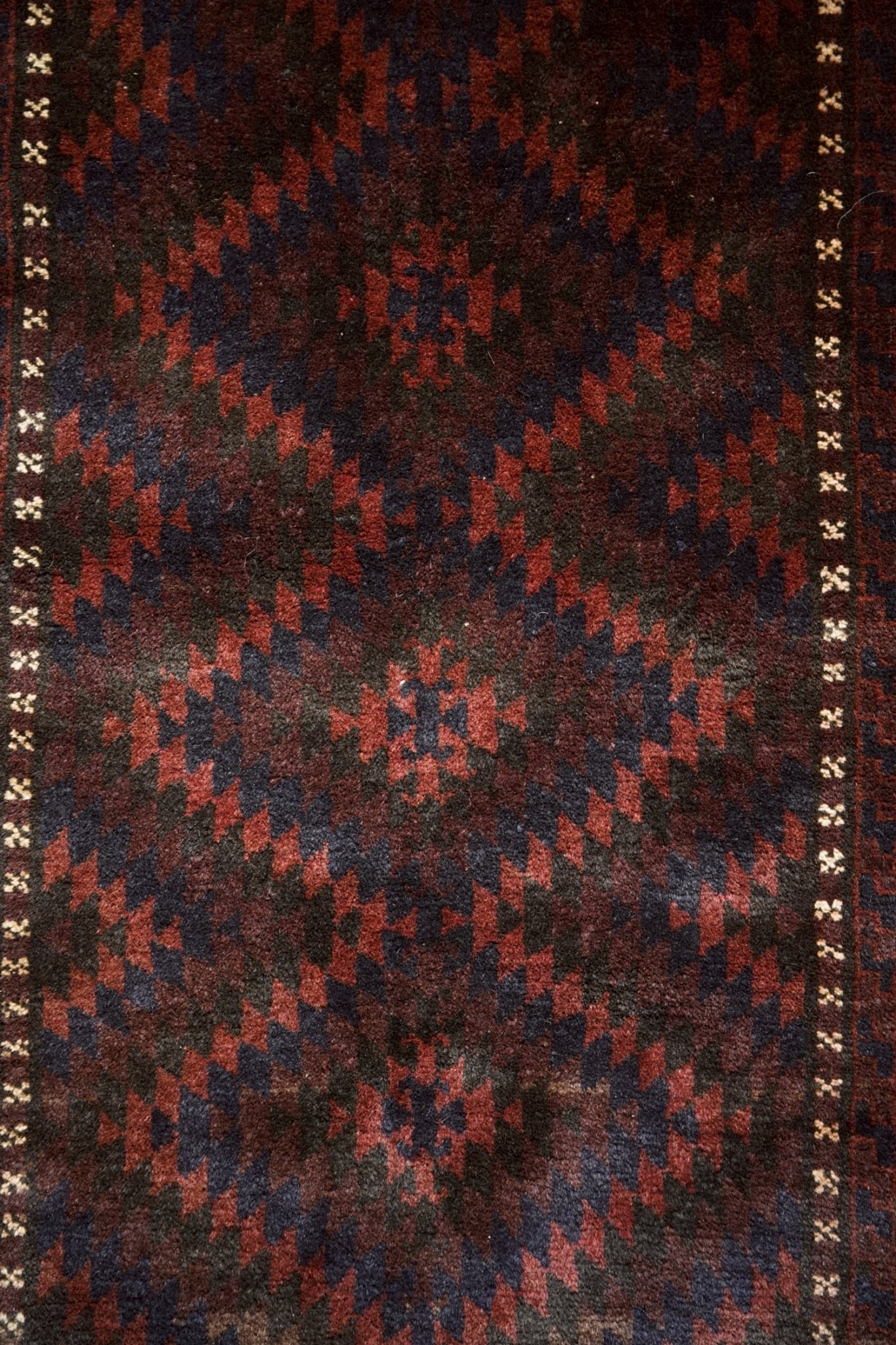 ボーダー部分を囲むように白い小さなモチーフが浮かび上がるのはバルーチ族の特徴的なデザイン。