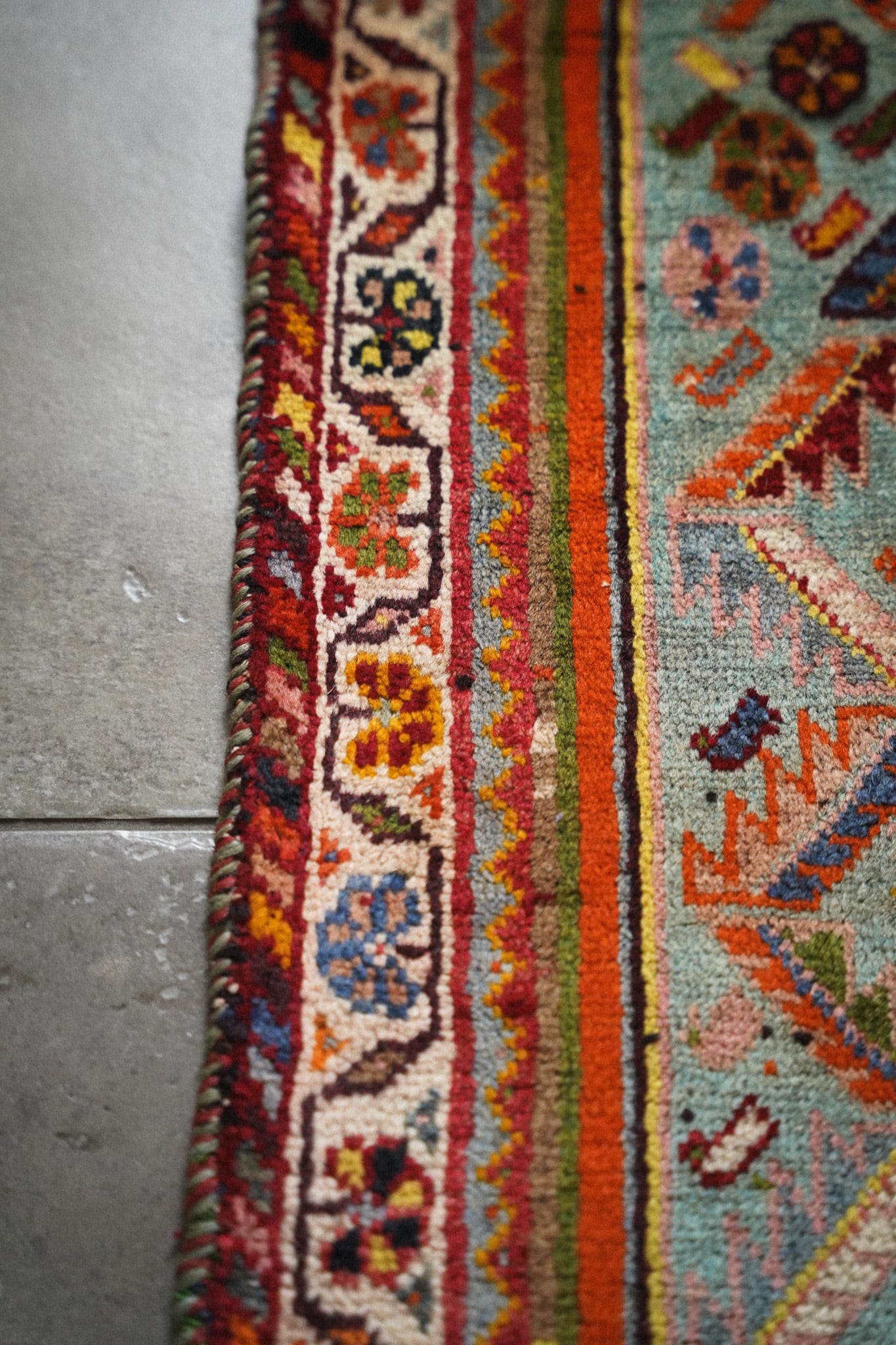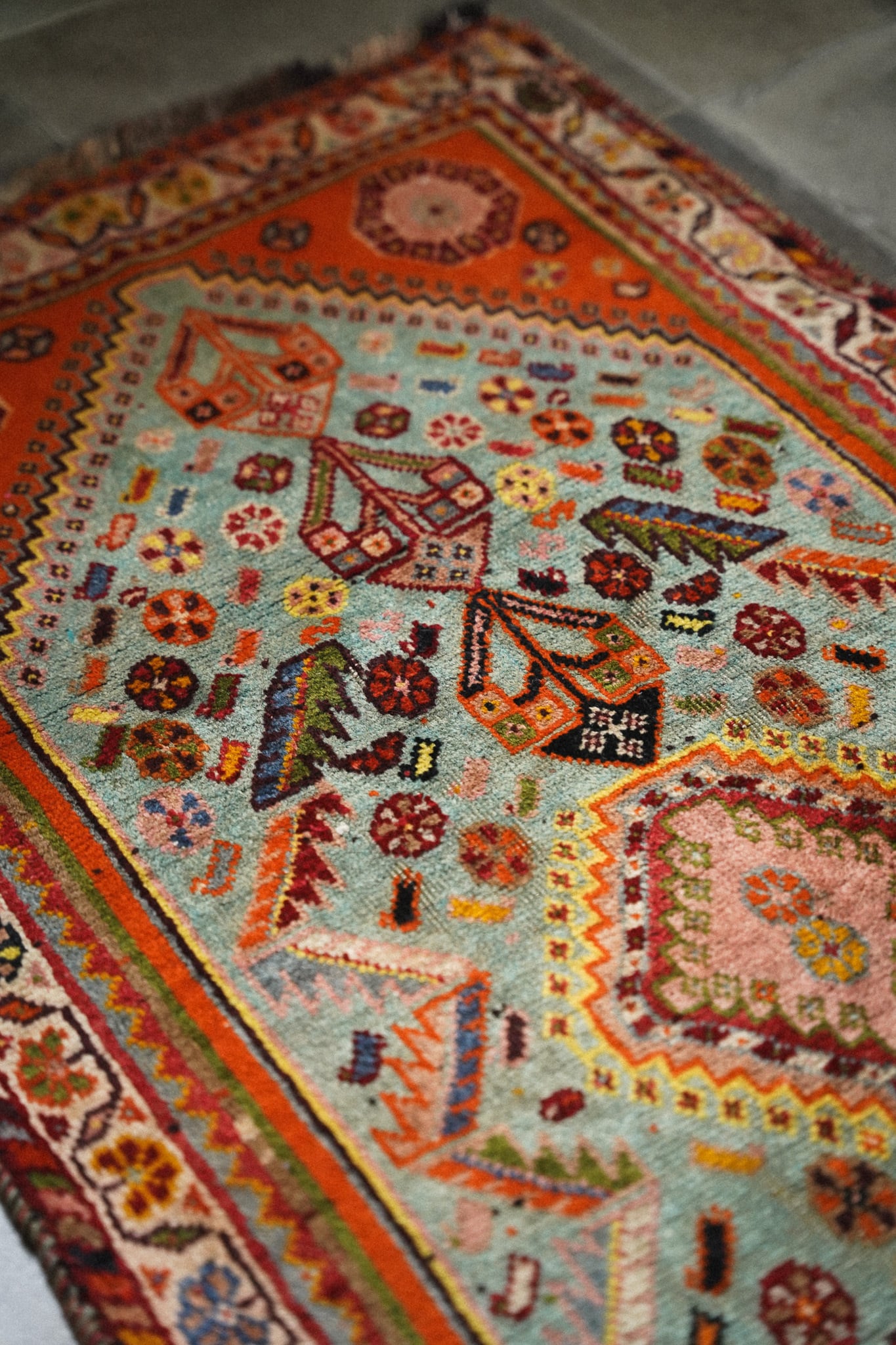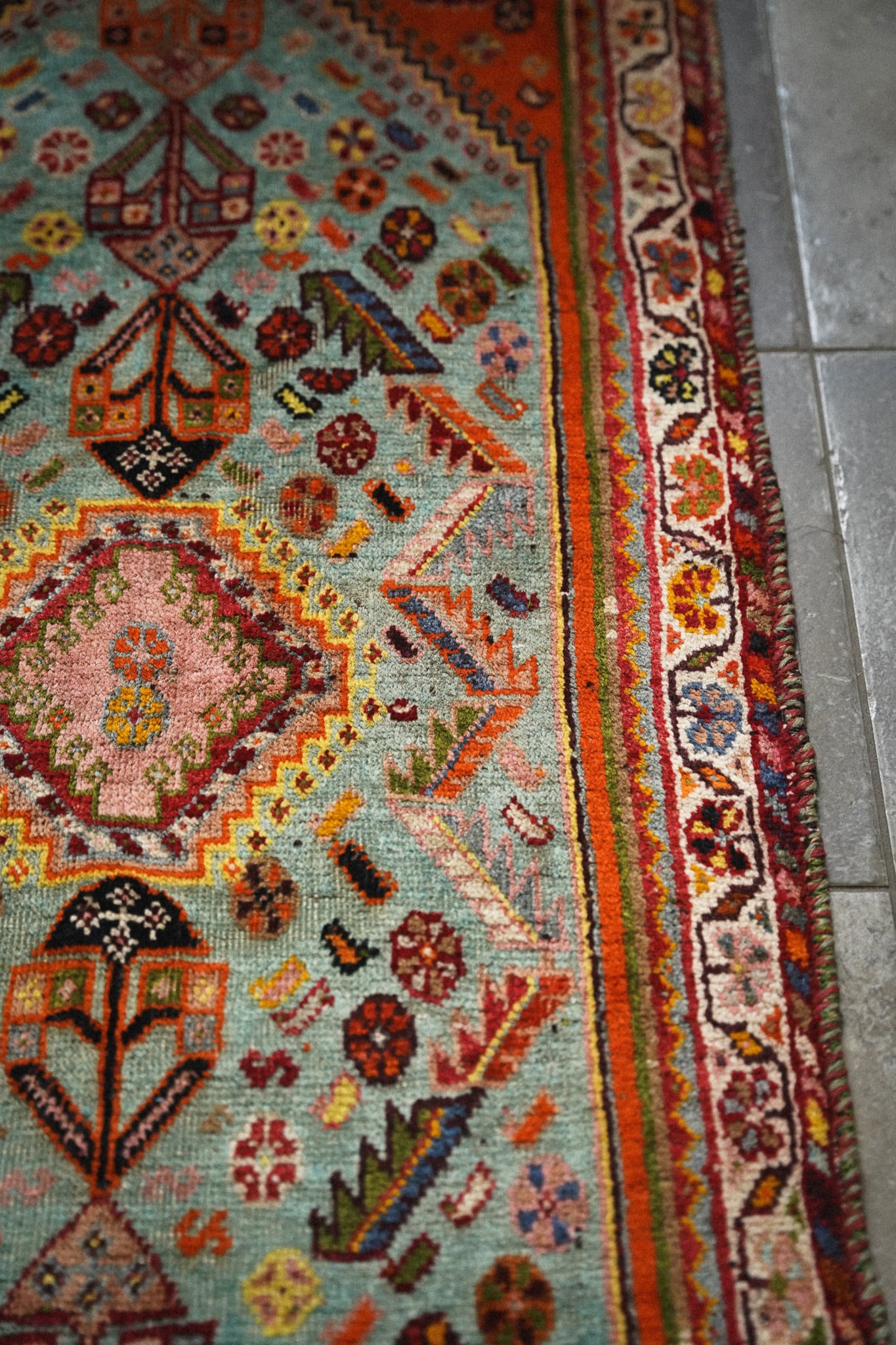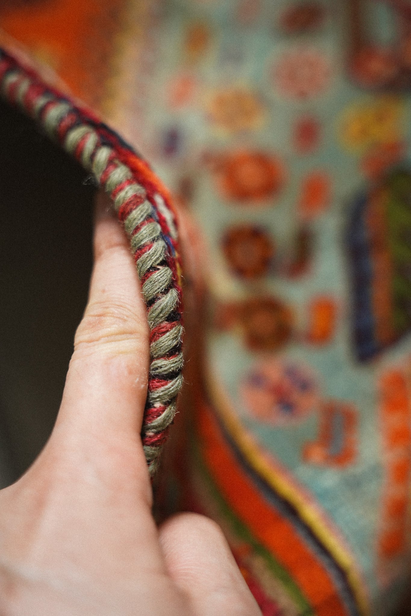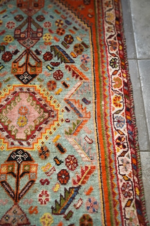 温かみのあるオレンジに、澄んだ水色が映え、春らしい軽やかさを感じさせてくれる一枚です。メダリオンを中心に草花モチーフが彩り豊かに描かれ、空間に軽やかな風を運んでくれそうです。