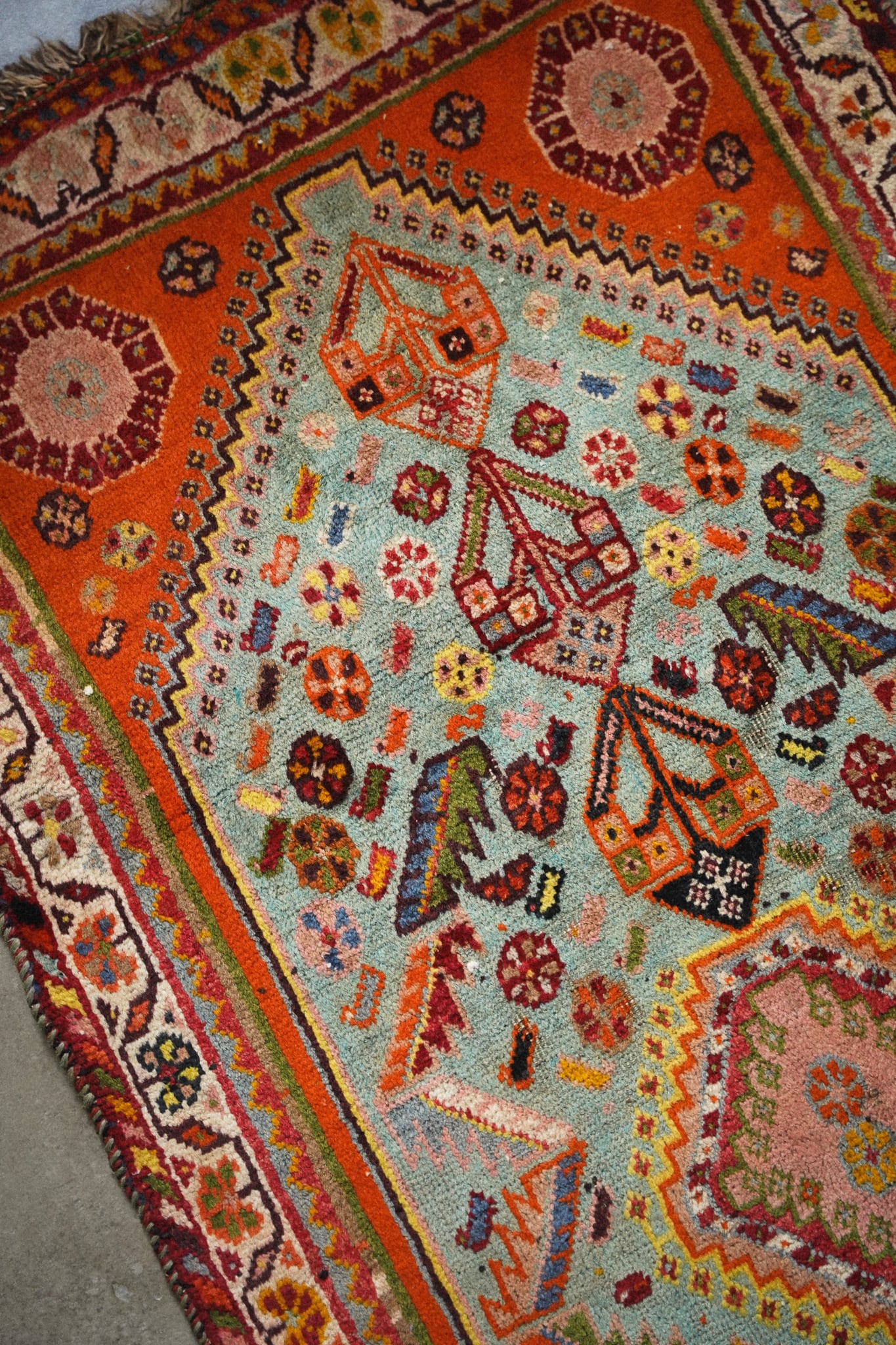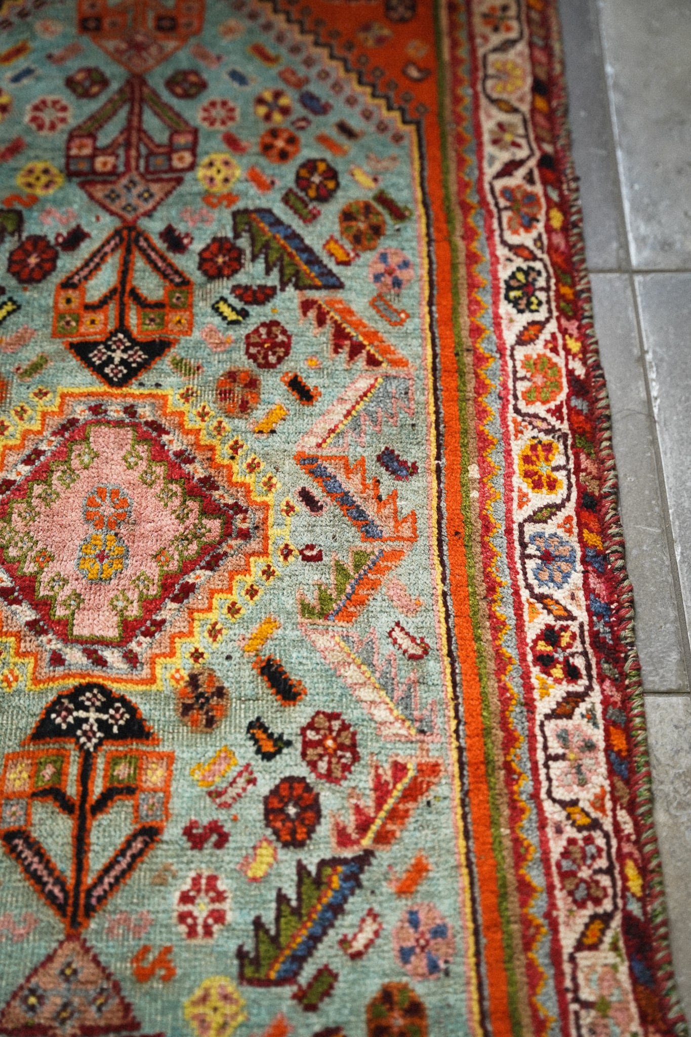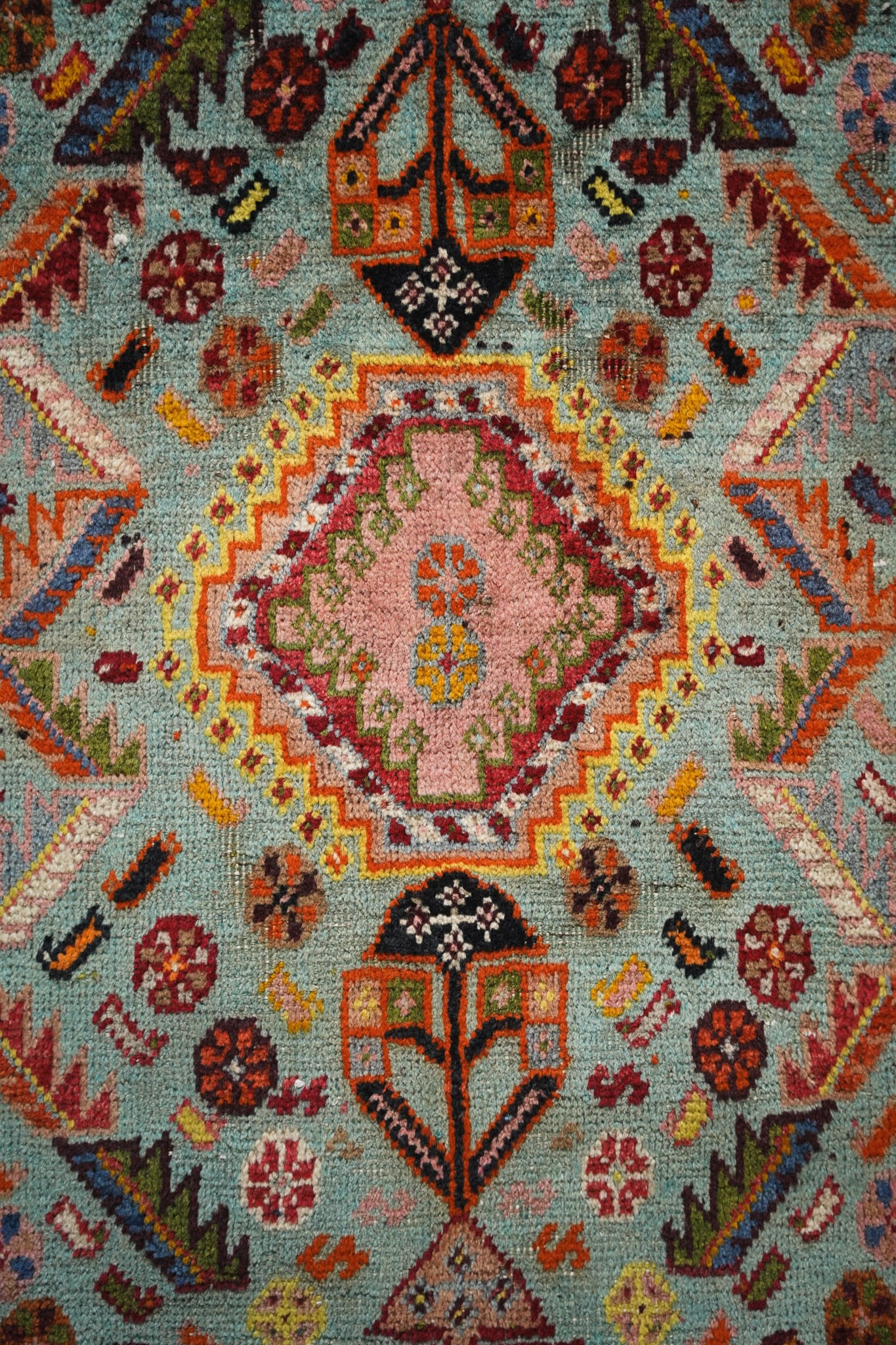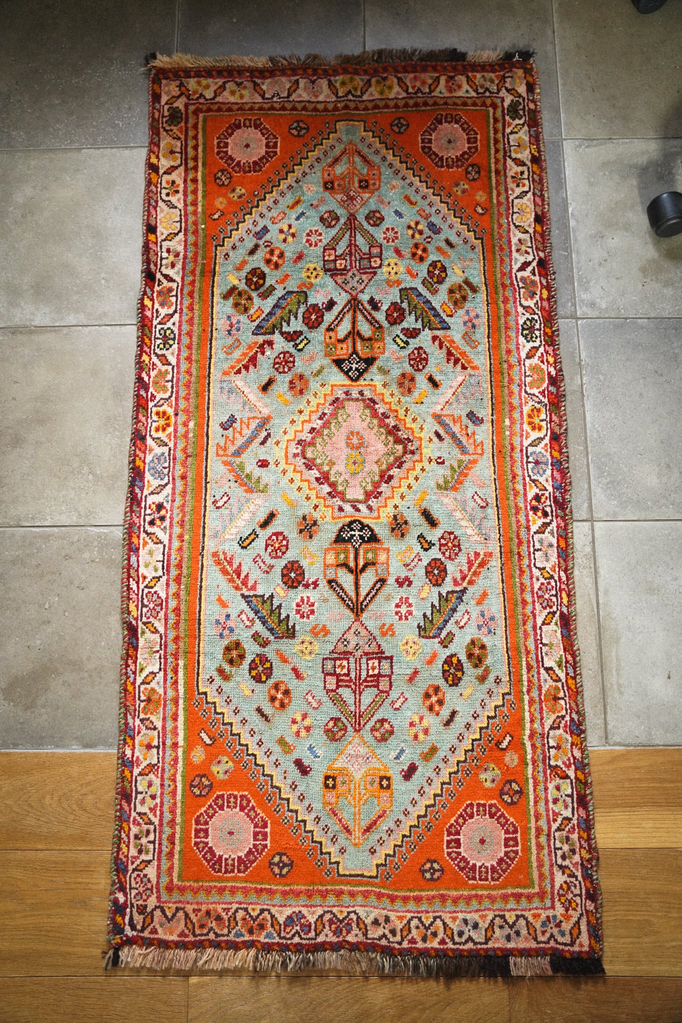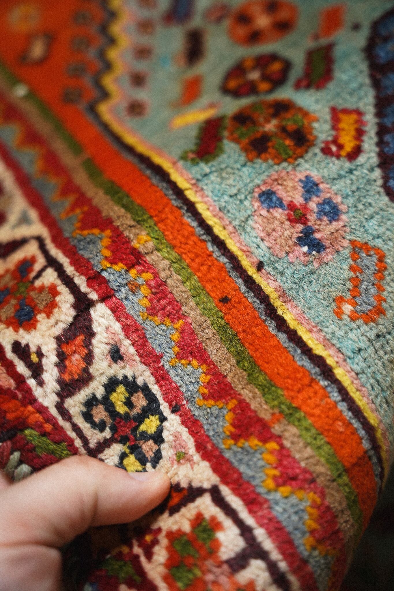 温かみのあるオレンジに、澄んだ水色が映え、春らしい軽やかさを感じさせてくれる一枚です。メダリオンを中心に草花モチーフが彩り豊かに描かれ、空間に軽やかな風を運んでくれそうです。