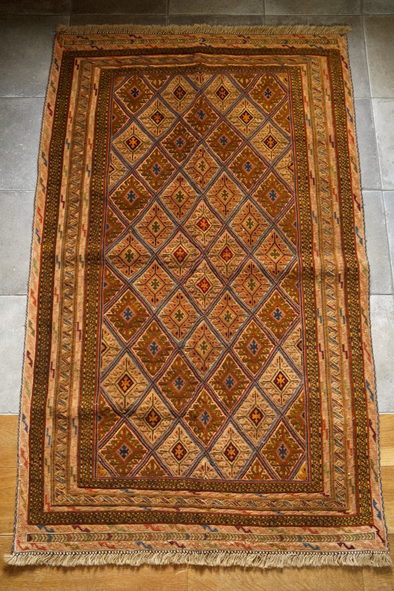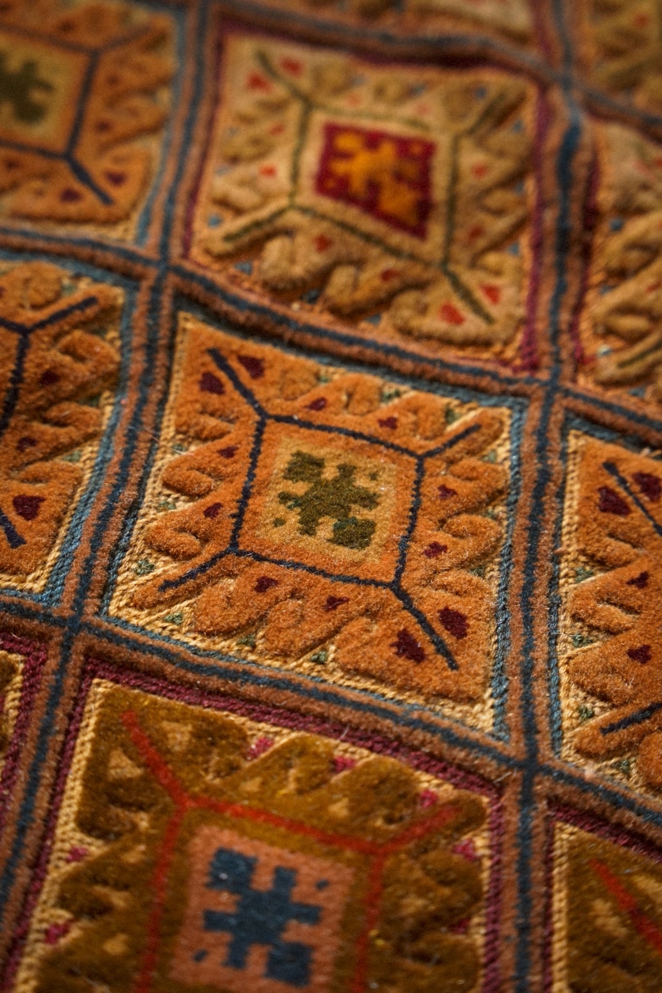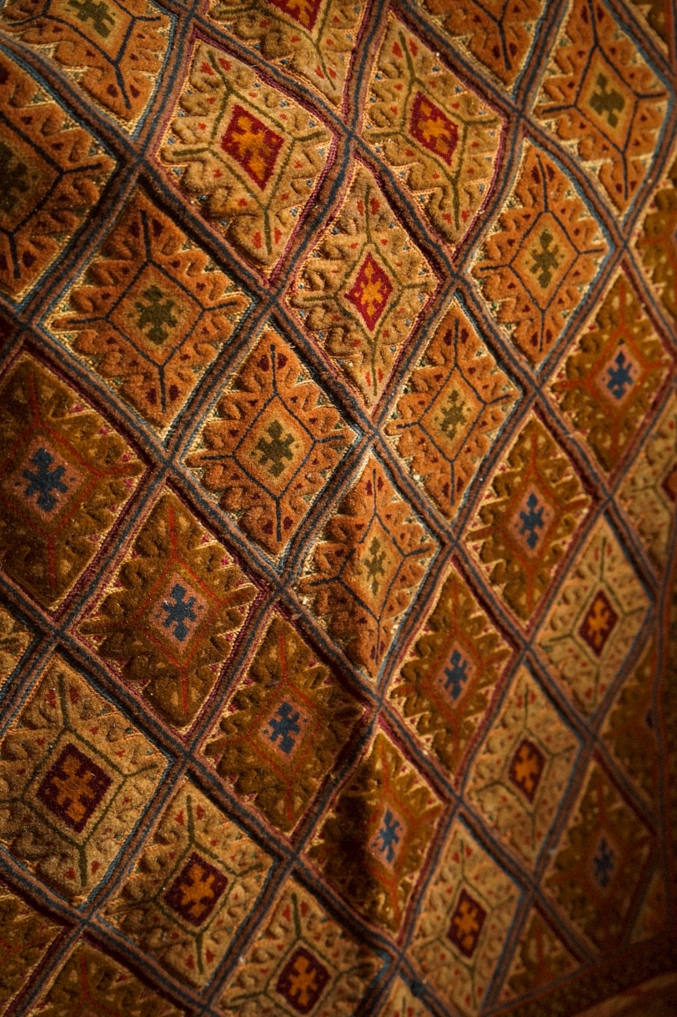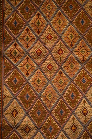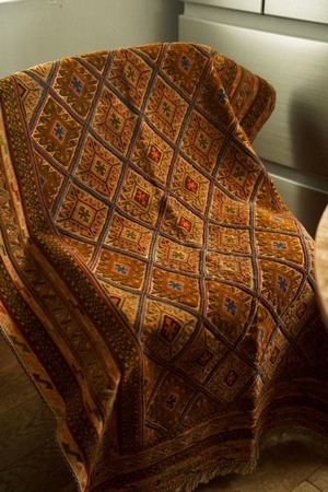 キャメルカラーをベースにレッド、ブルー、ボルドー、マスタードなど落ち着いた色味で菱形紋様が織り込まれたデザインです。