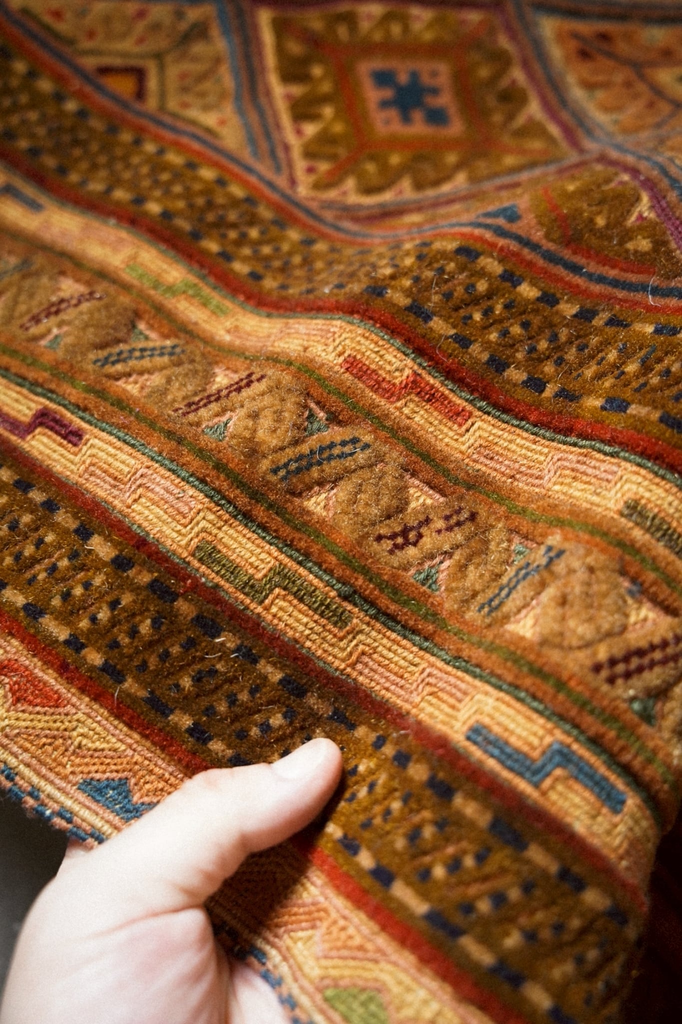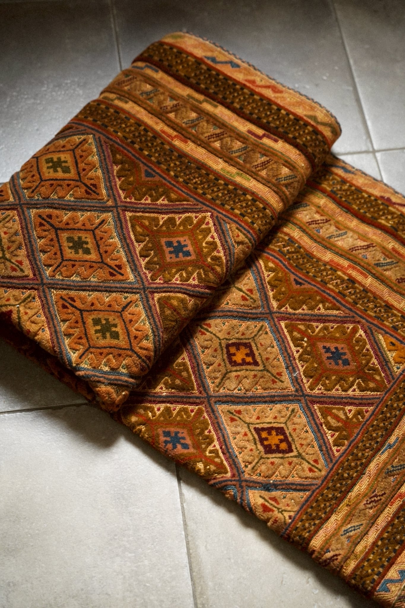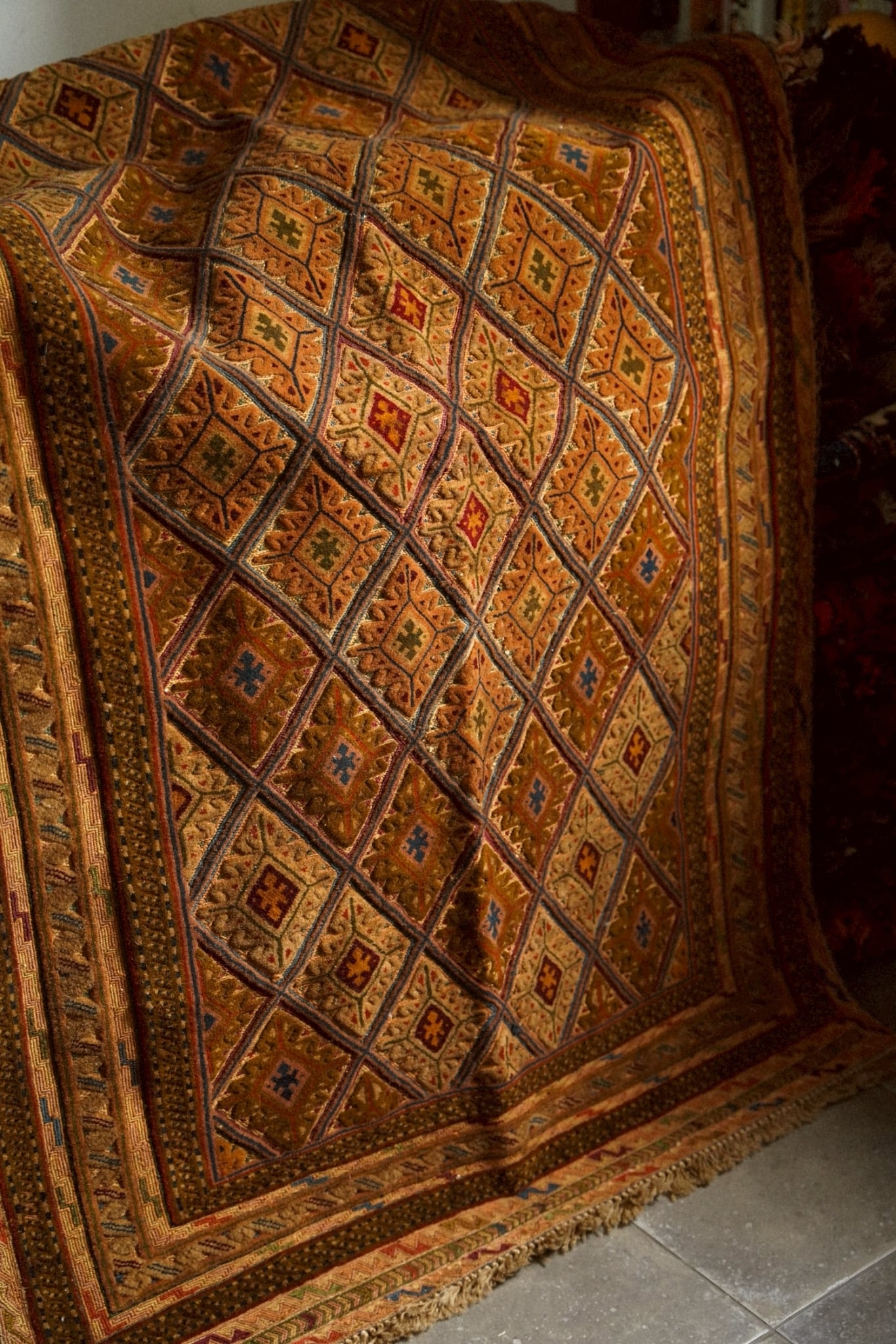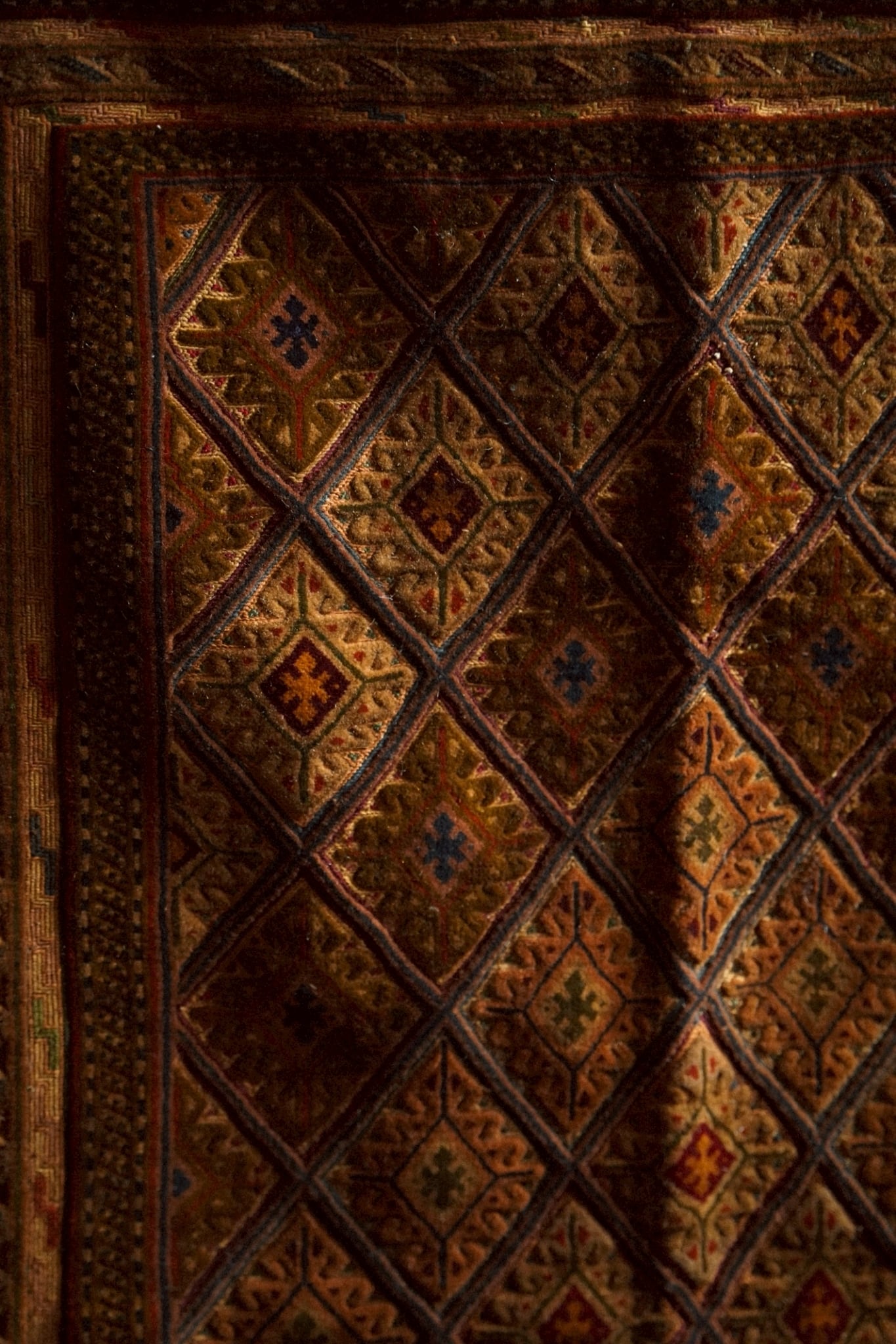 キャメルカラーをベースにレッド、ブルー、ボルドー、マスタードなど落ち着いた色味で菱形紋様が織り込まれたデザインです。