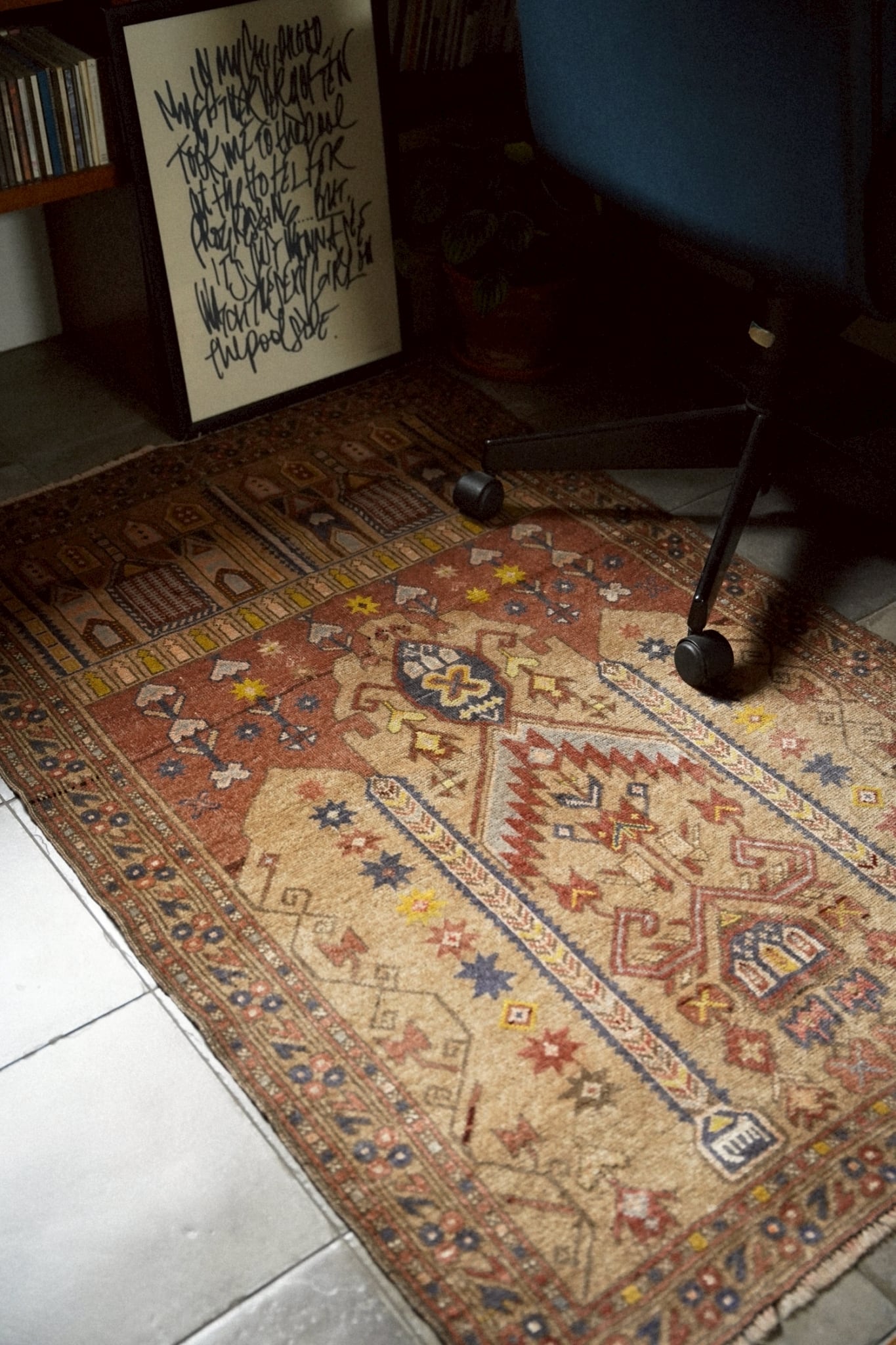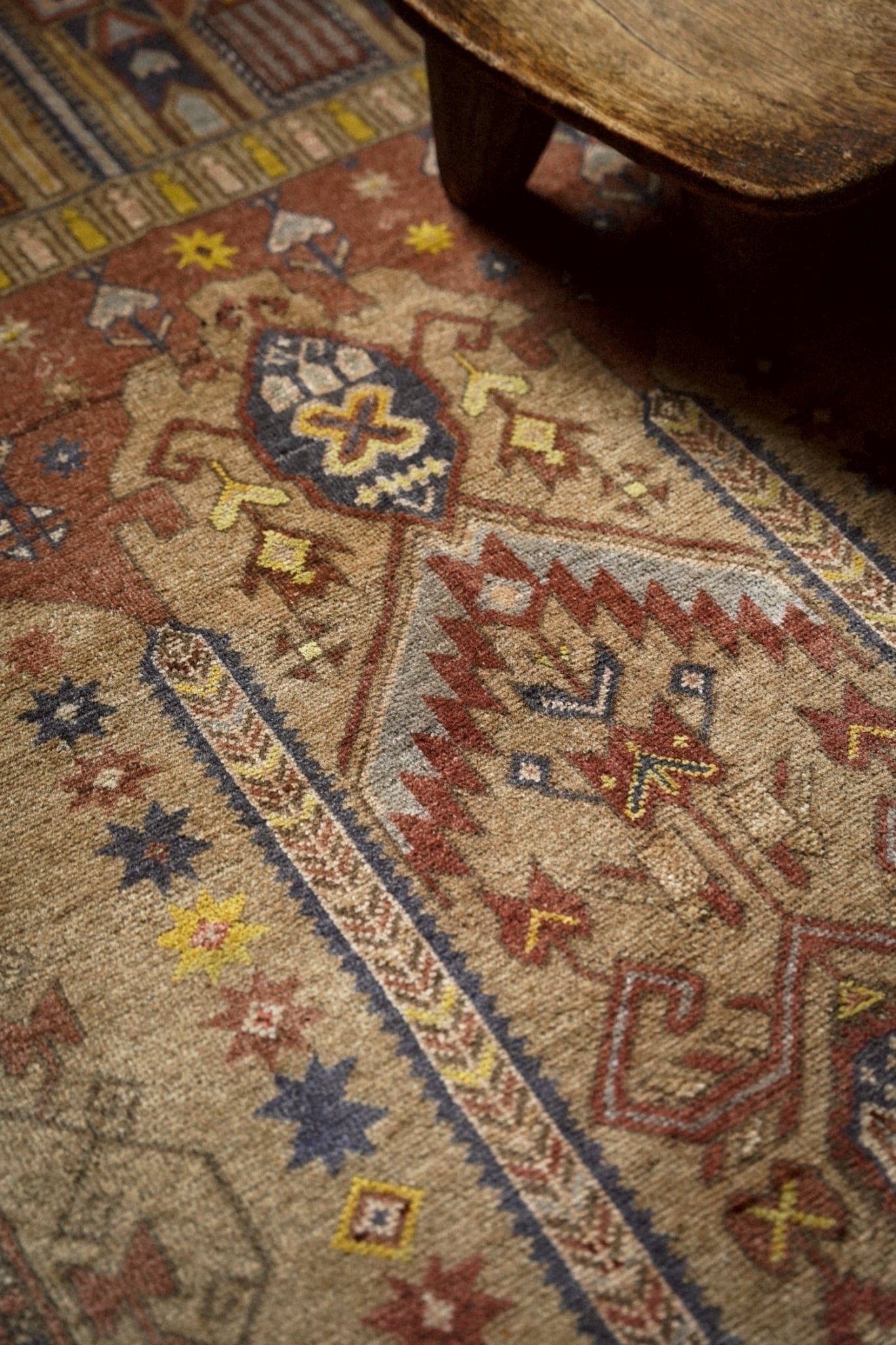 ベースカラーはベージュとテラコッタ。やわらかな大地色を背景に、ネイビーやマスタードイエロー、ボルドー、アイボリーなどで描かれたポップな色使いとデザインが可愛らしい一枚。