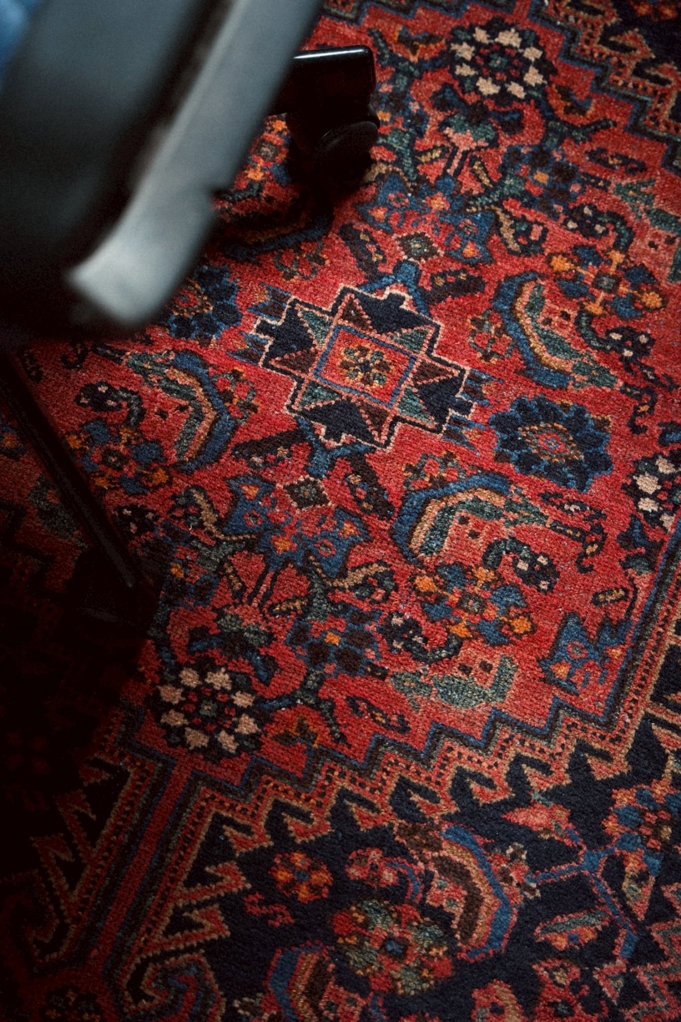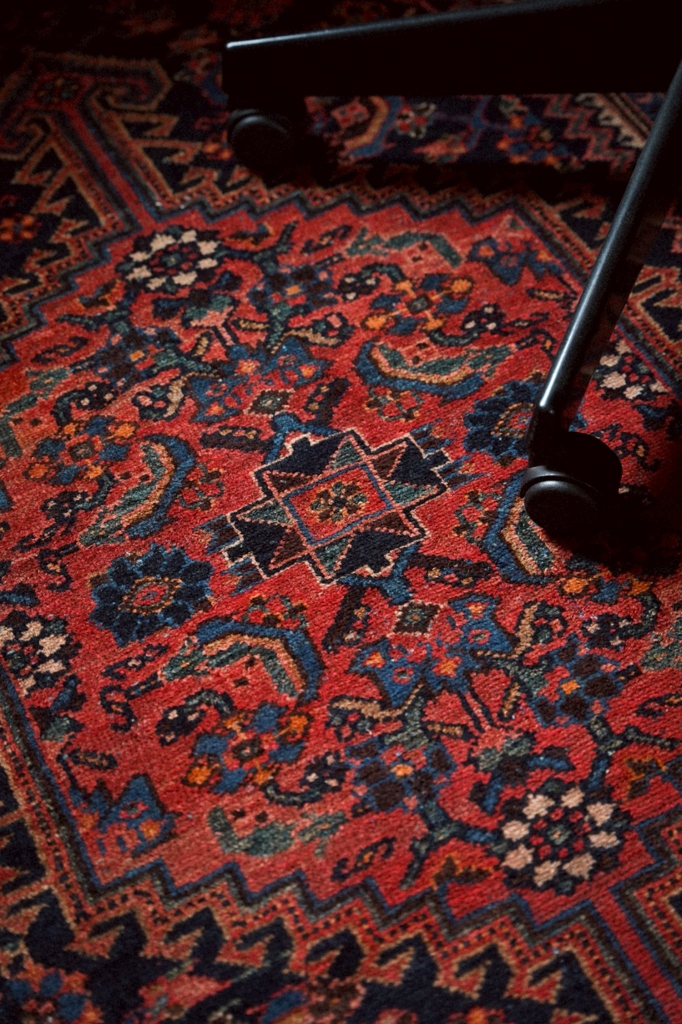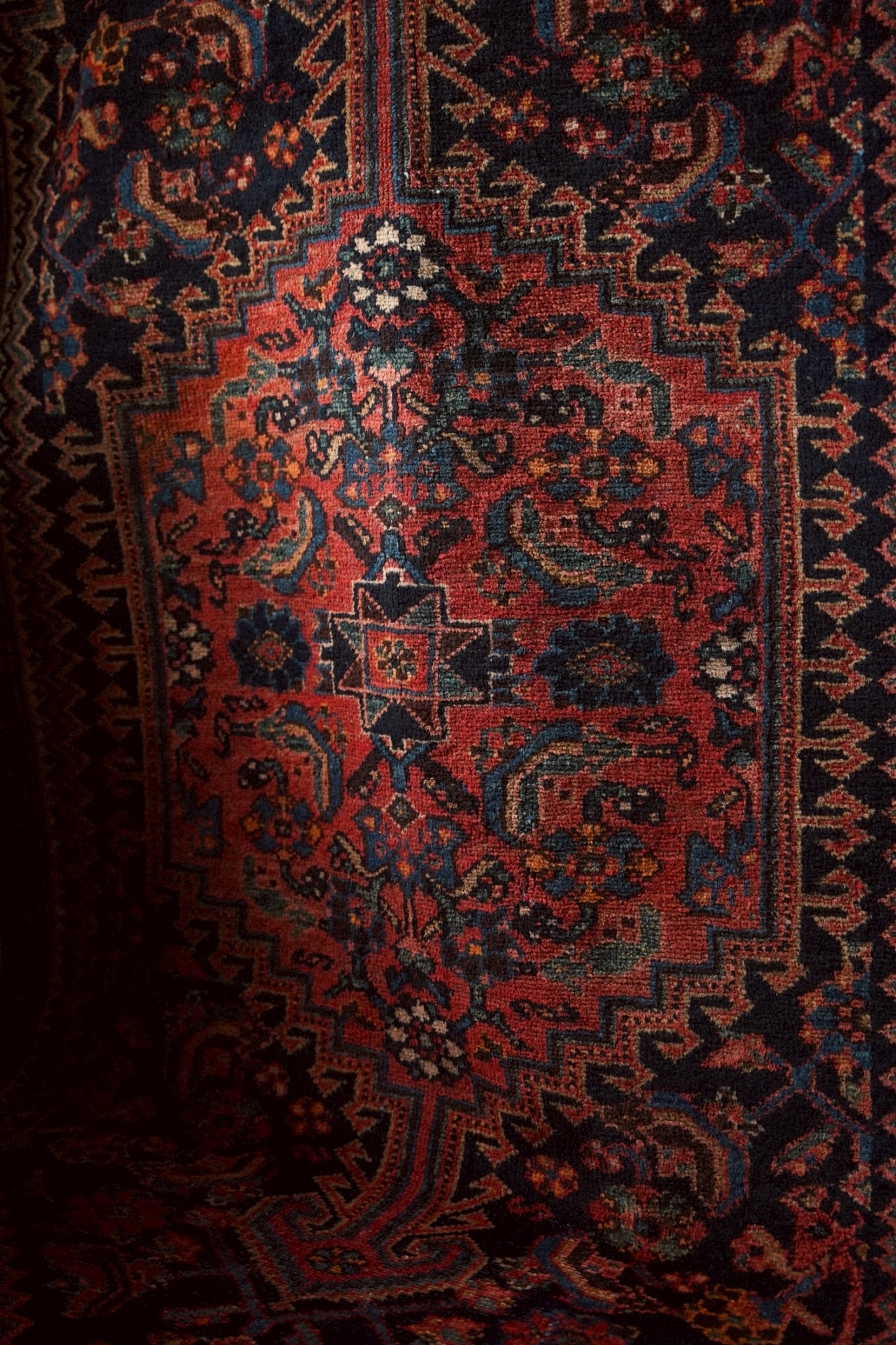 茜色をベースに真ん中にはネイビーの力強いメダリオン、フィールドには幾何学的なボタニカル文様が織り込まれた華やかなデザイン。