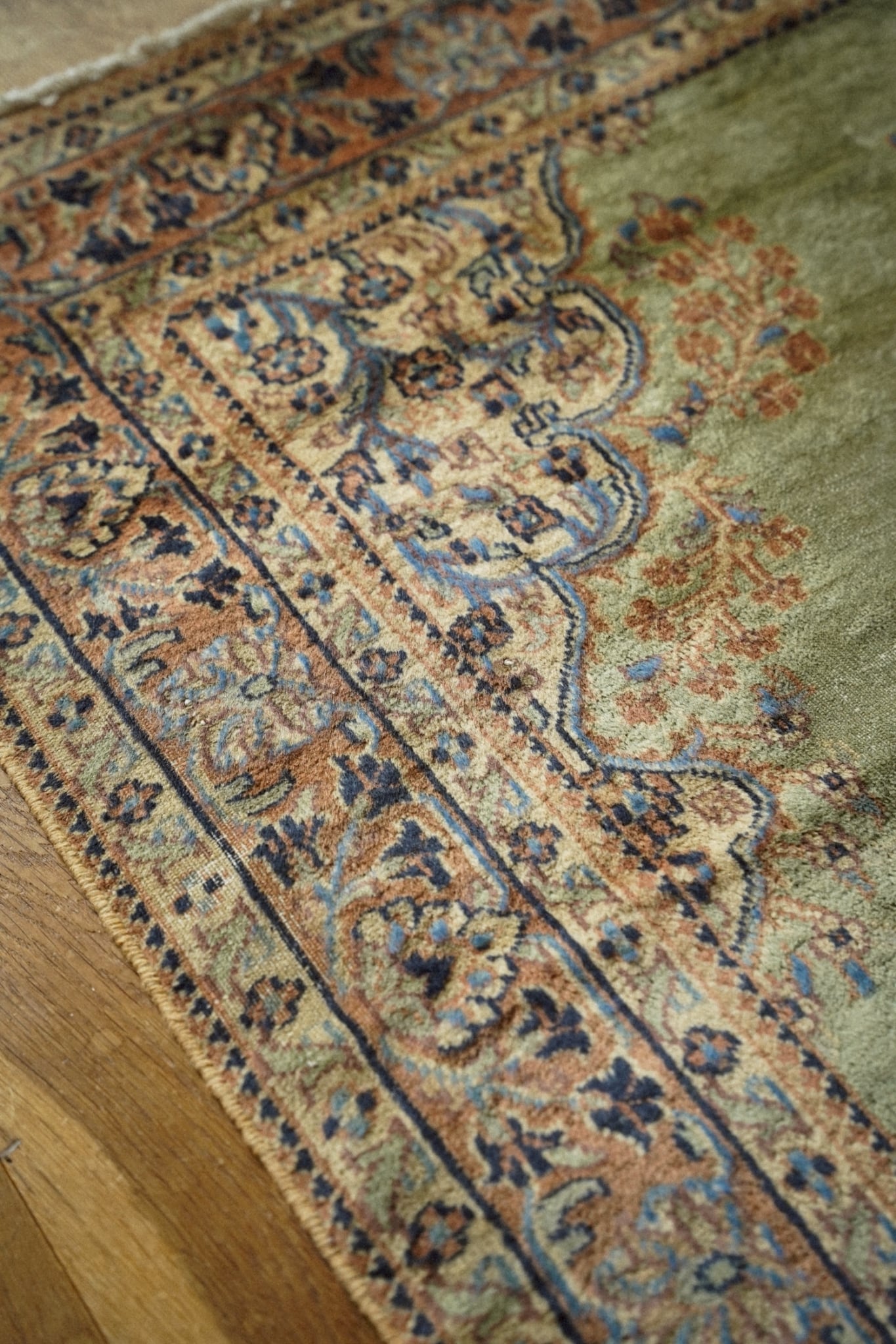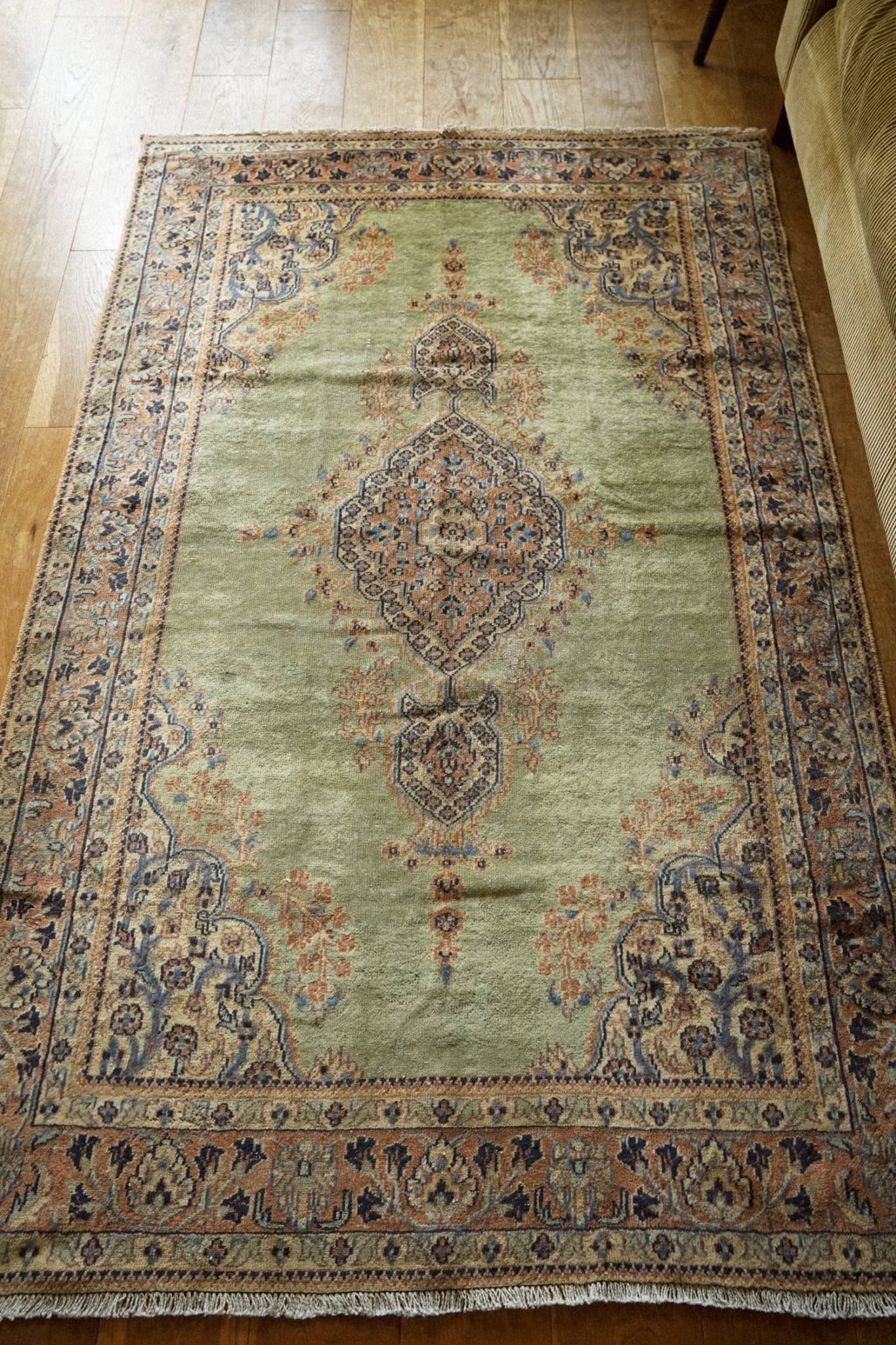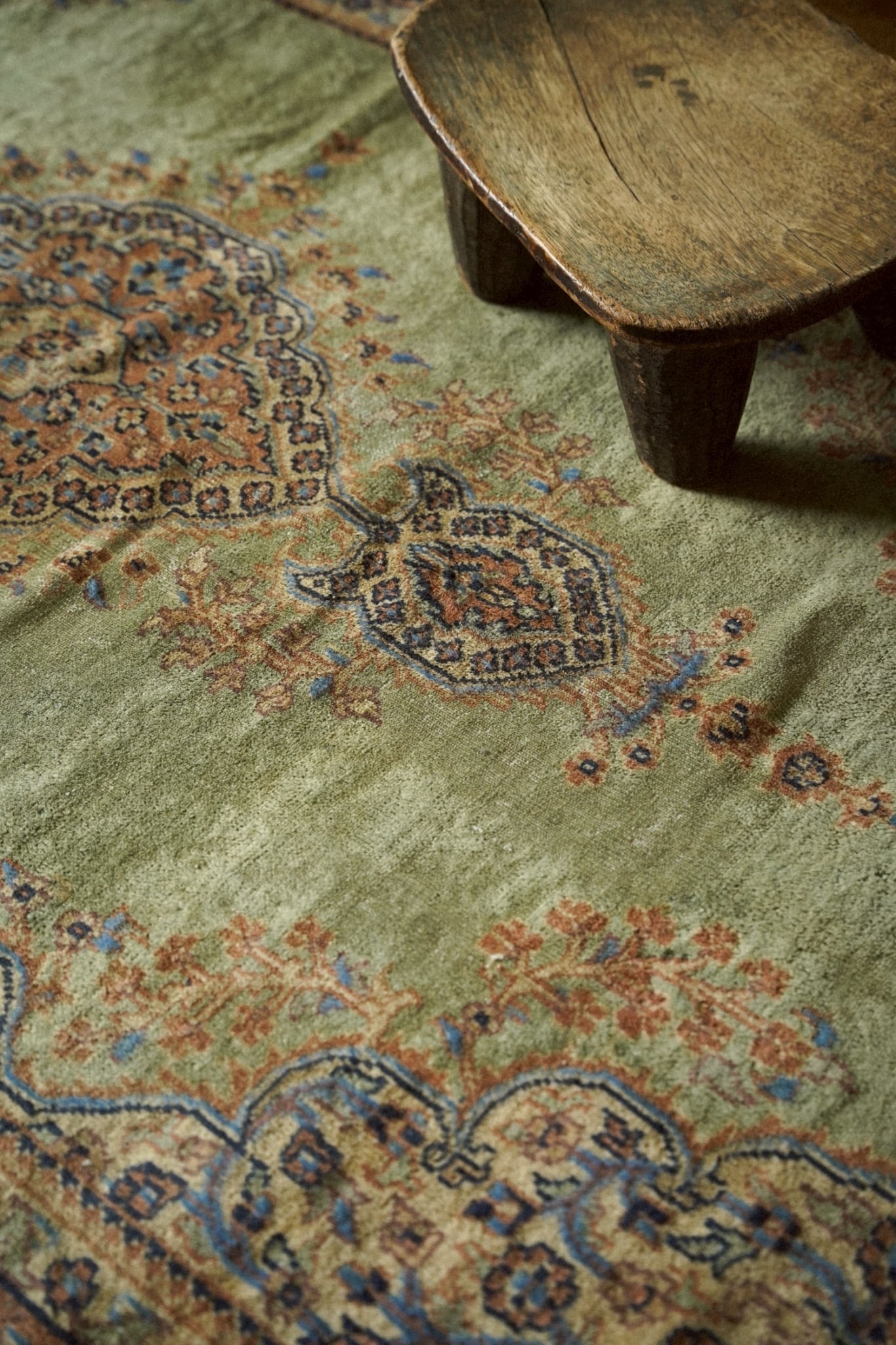 1980年代に織られたパキスタンラグ。春らしいペパーミントグリーンのフィールドに、シャンデリアのような華やかなデザインのメダリオン。