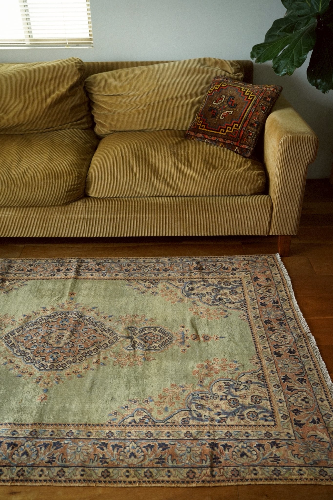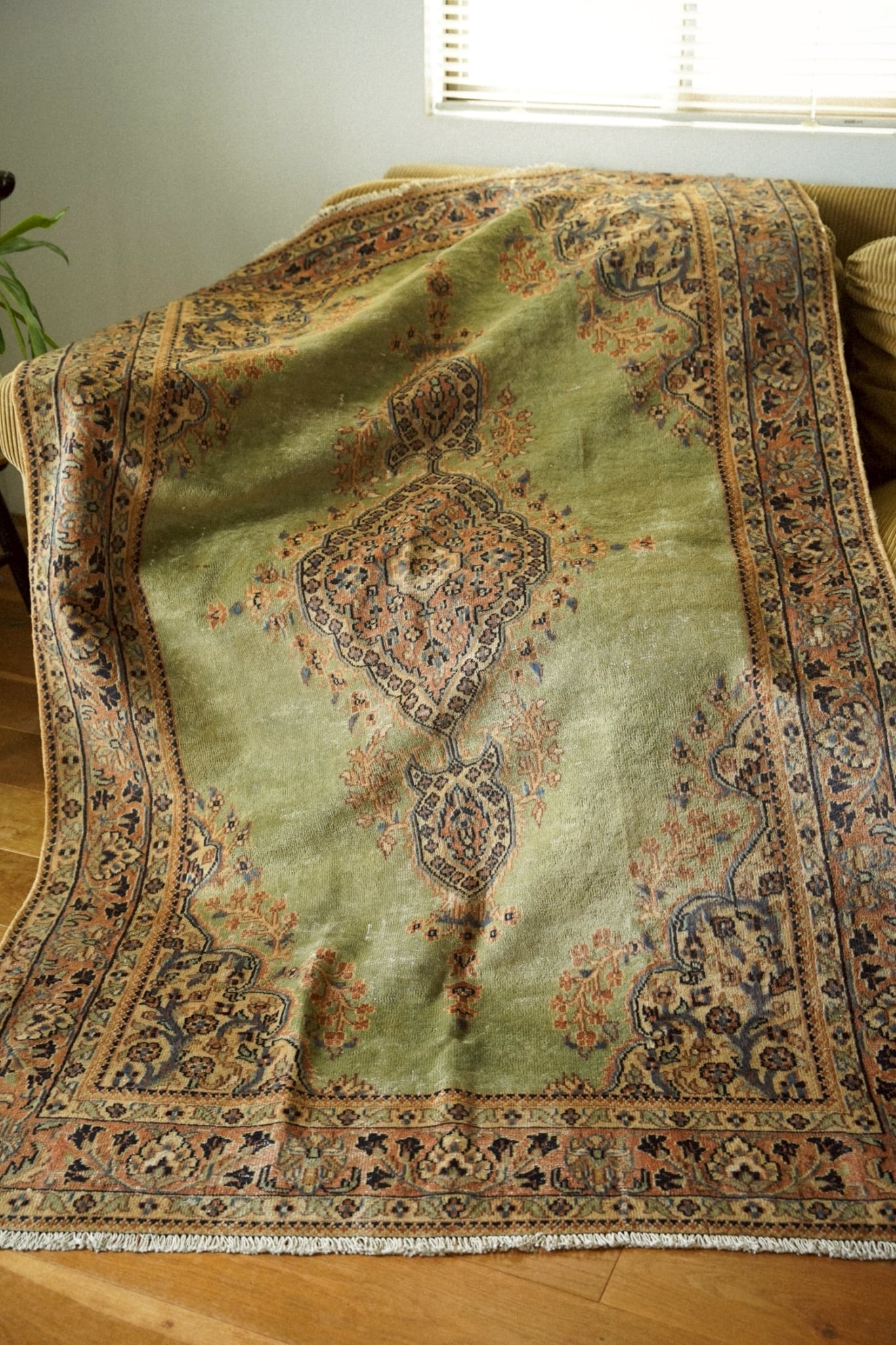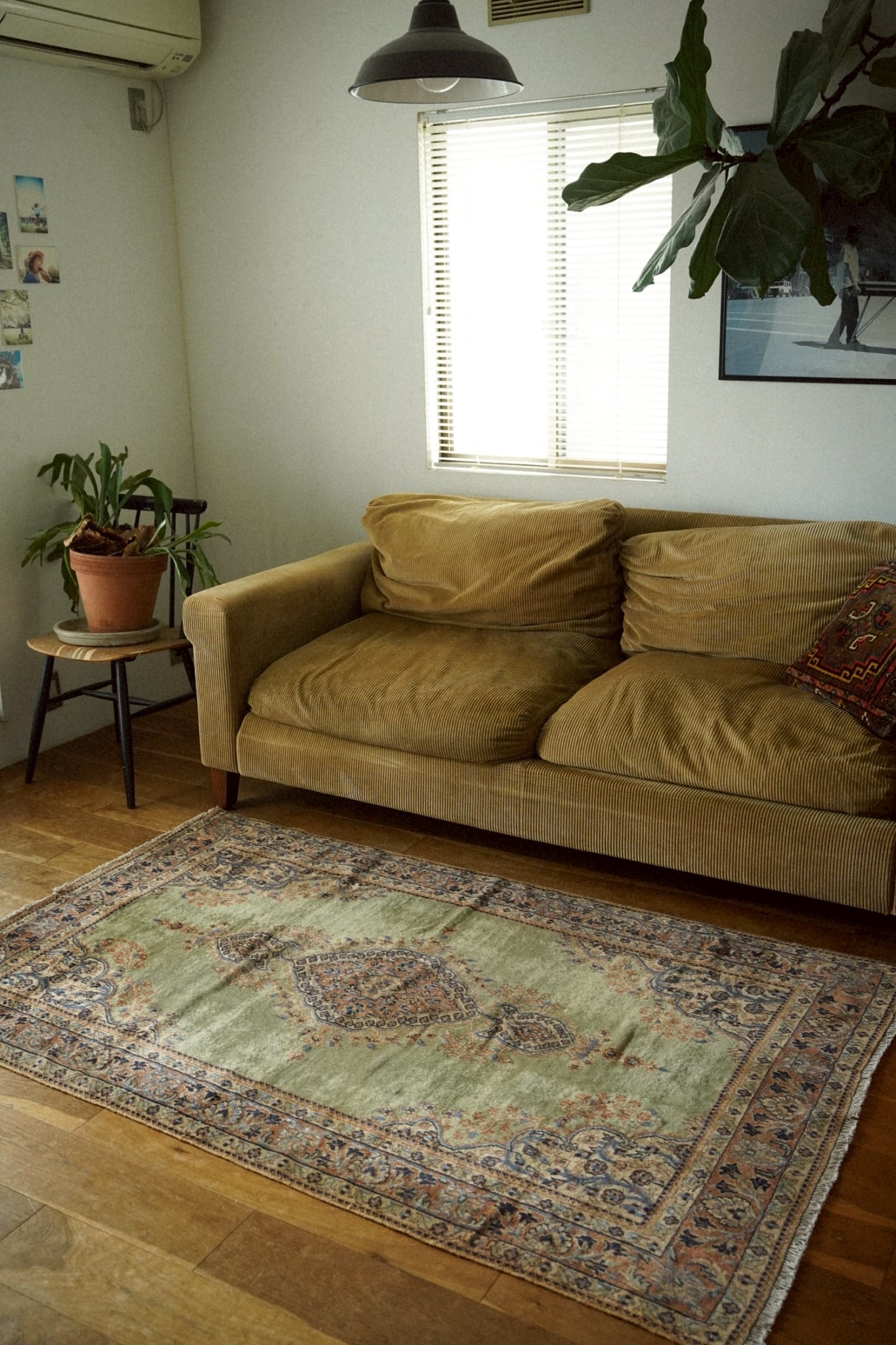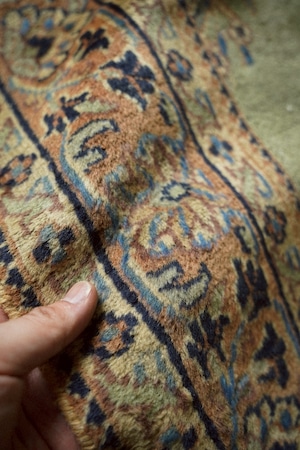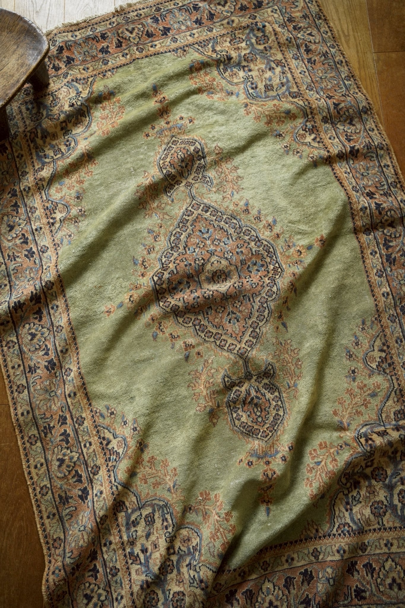 パイルは経年による擦れやリペア跡もありますが、ヴィンテージラグの風合いとしてお楽しみください。滑らかでとても柔らかな手触りも魅力です。取れない小さなシミあり(画像の最後のページをご確認下さい)。