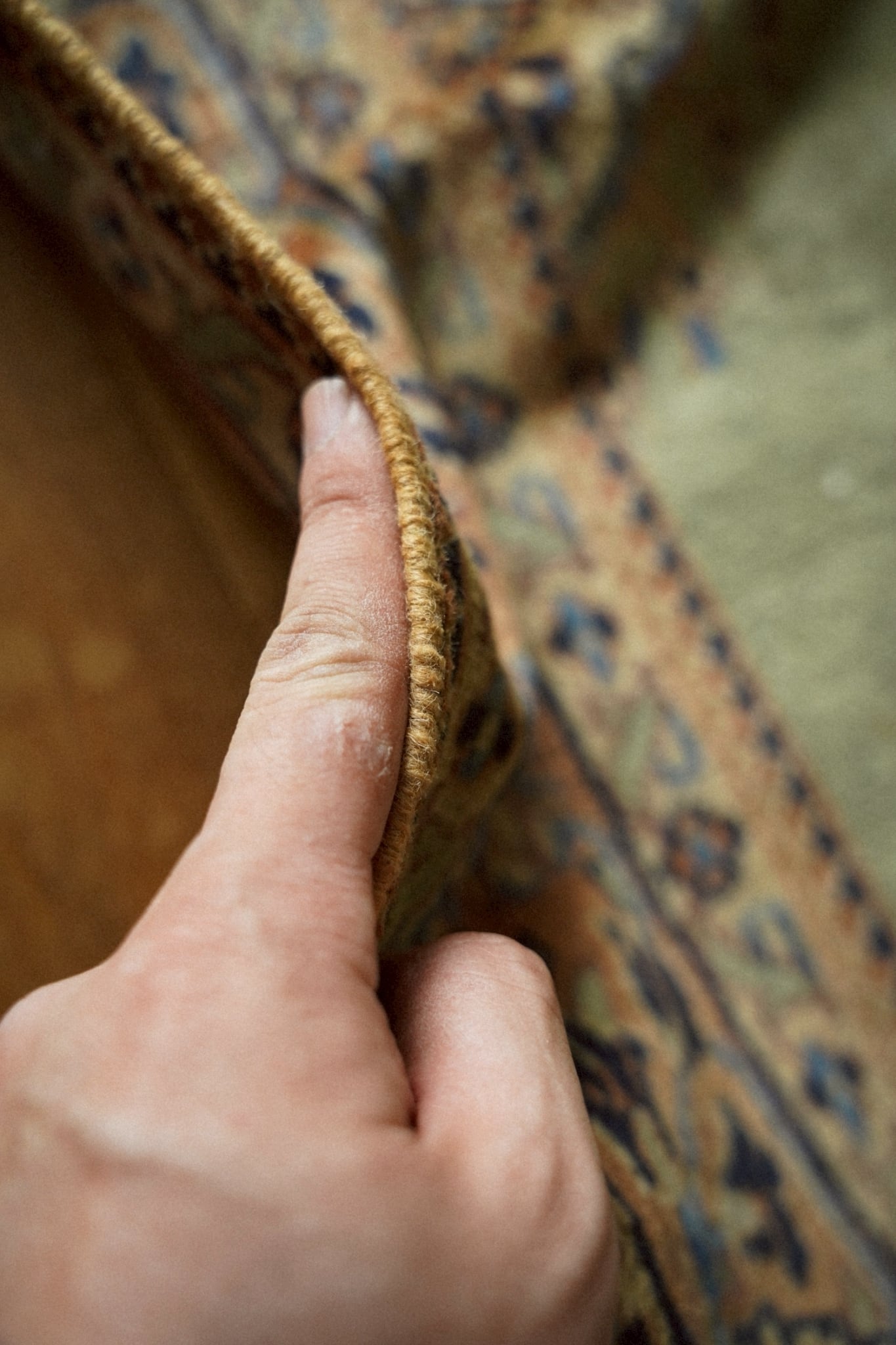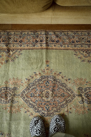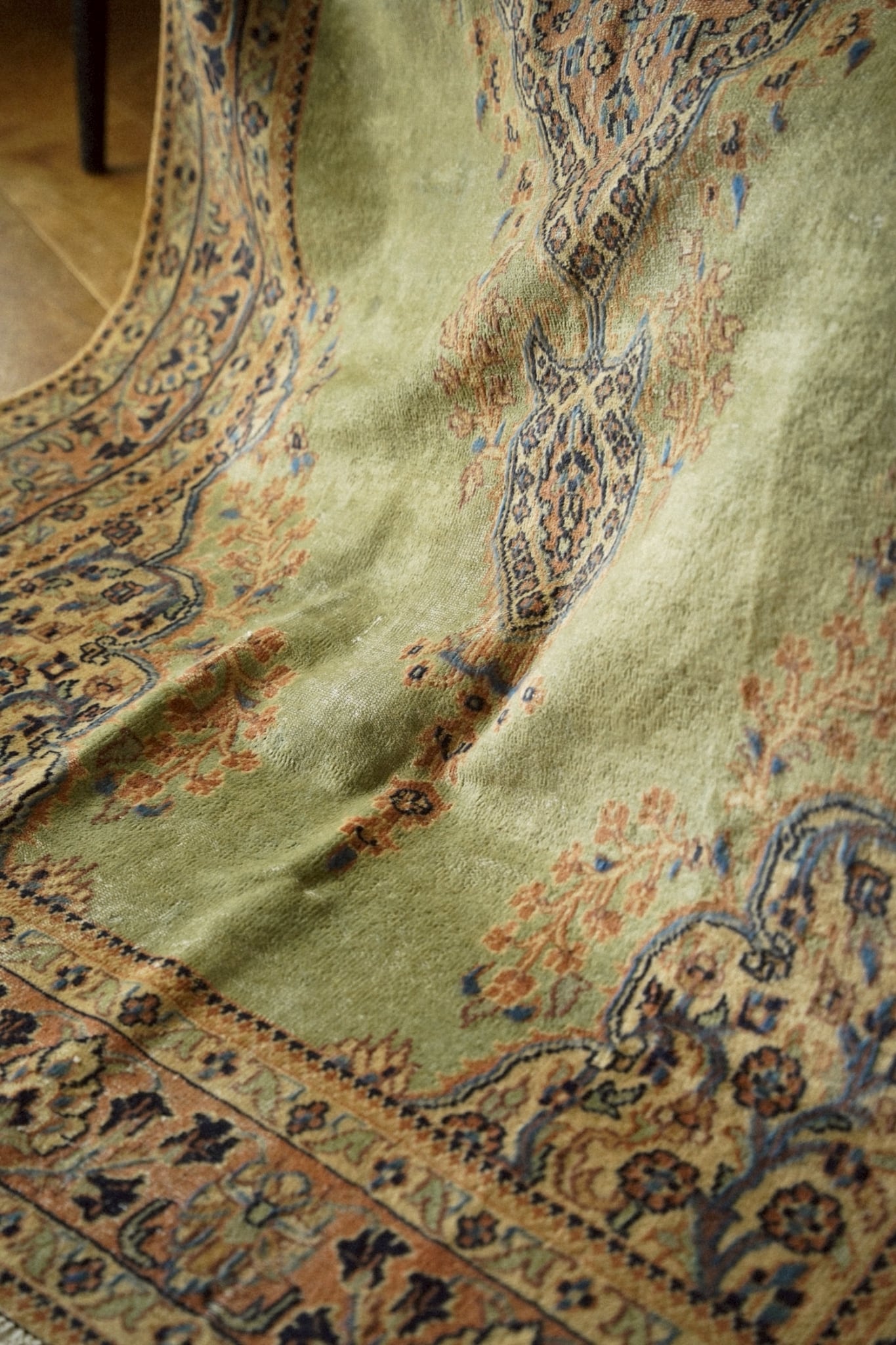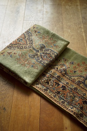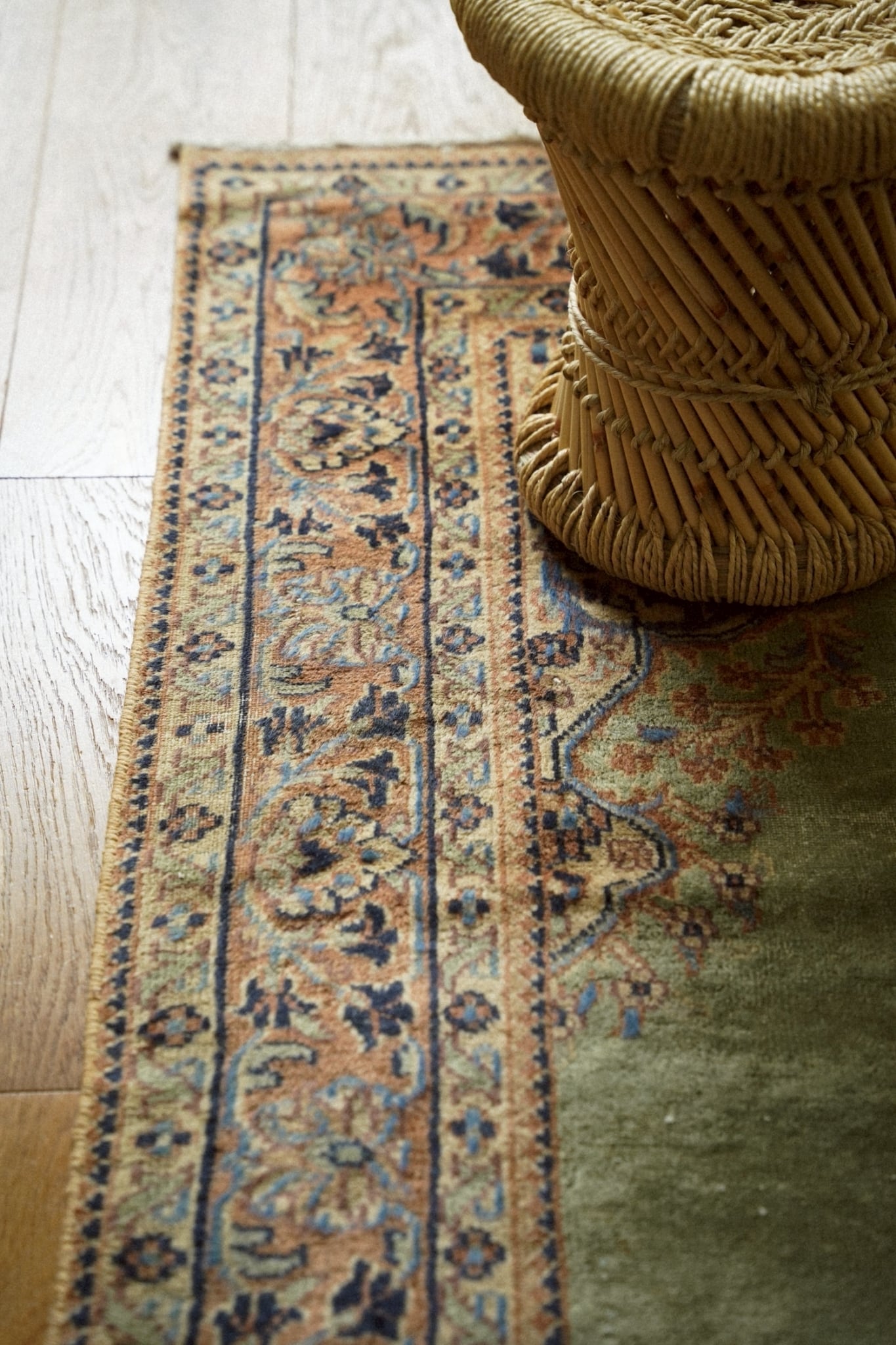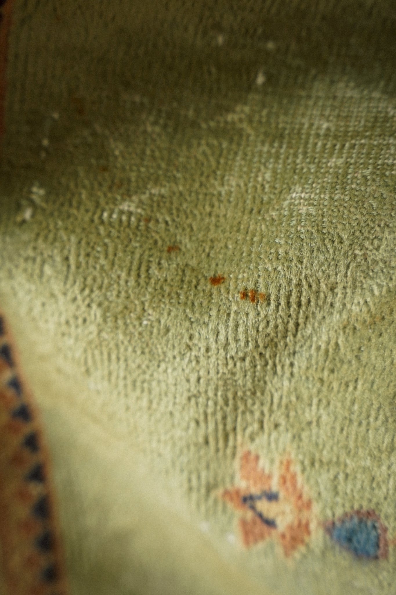 パイルは経年による擦れやリペア跡もありますが、ヴィンテージラグの風合いとしてお楽しみください。滑らかでとても柔らかな手触りも魅力です。取れない小さなシミあり(画像の最後のページをご確認下さい)。