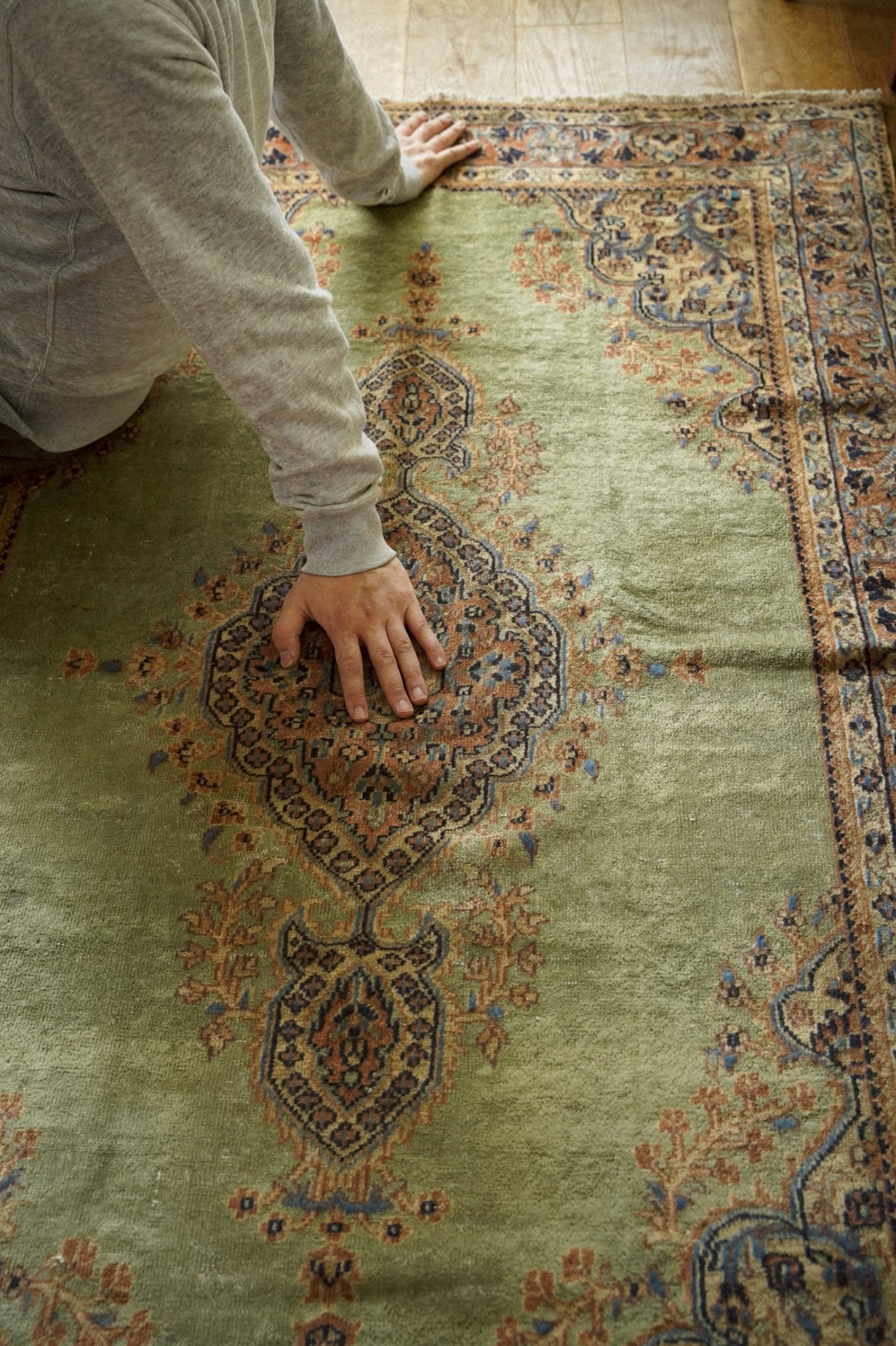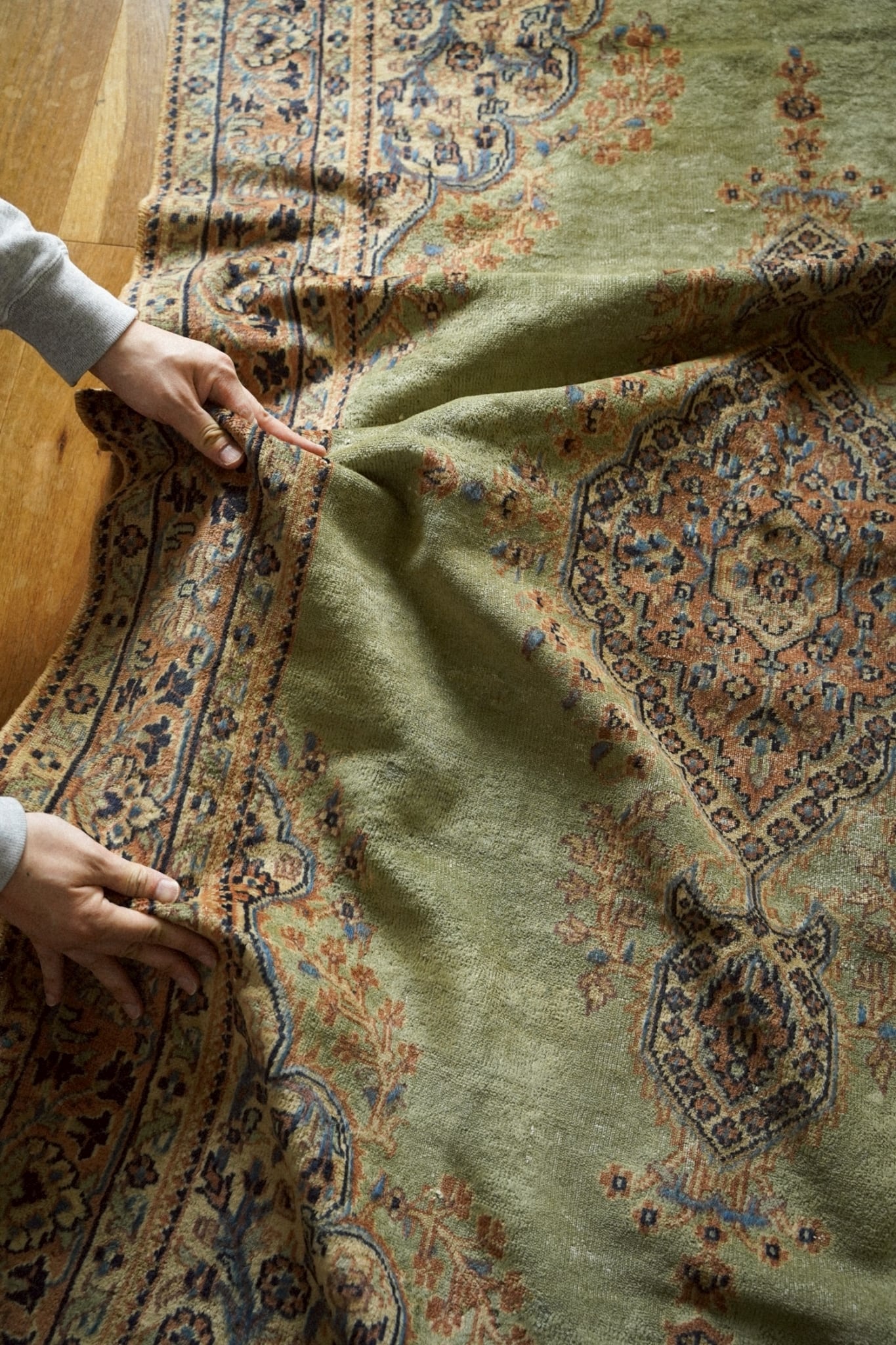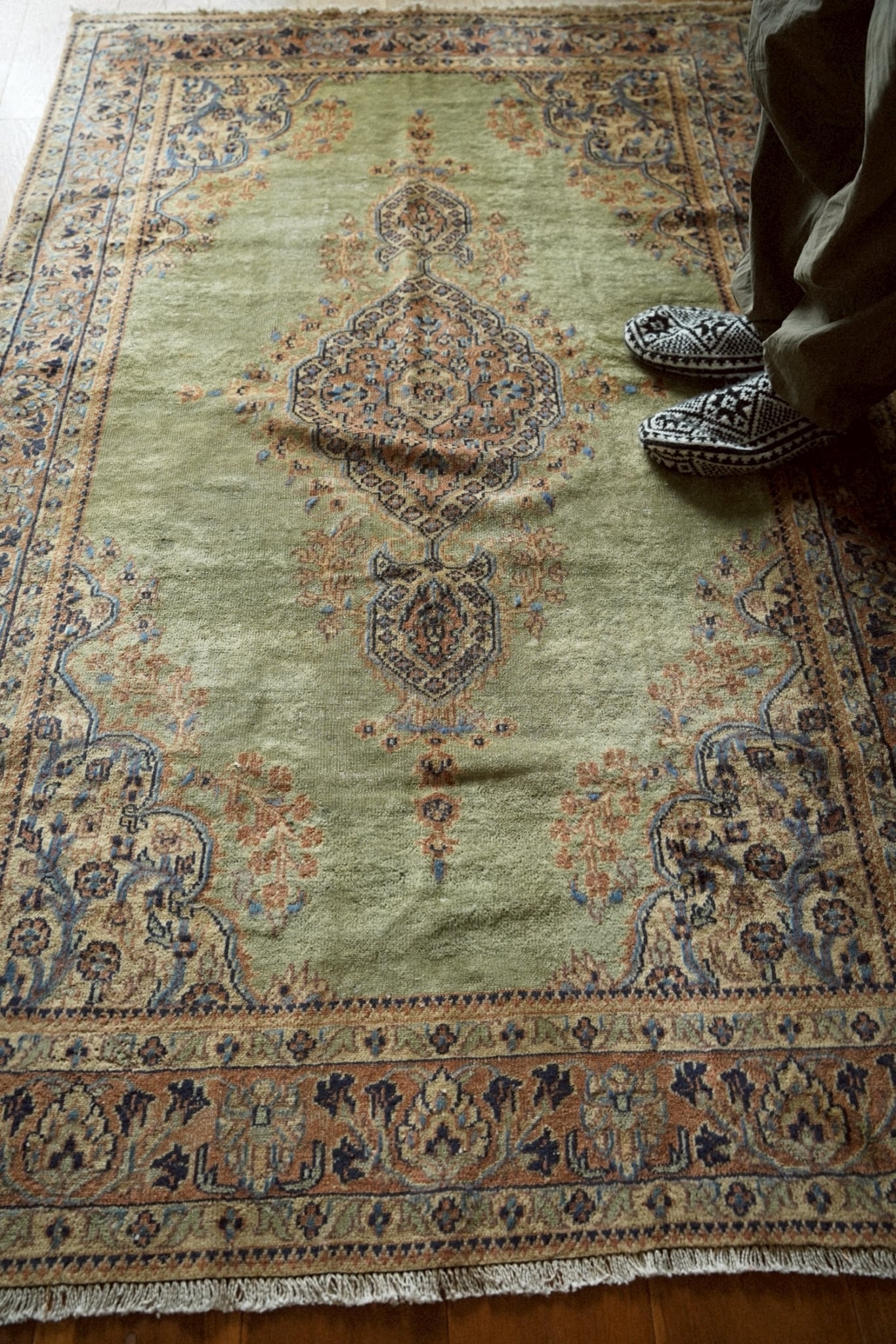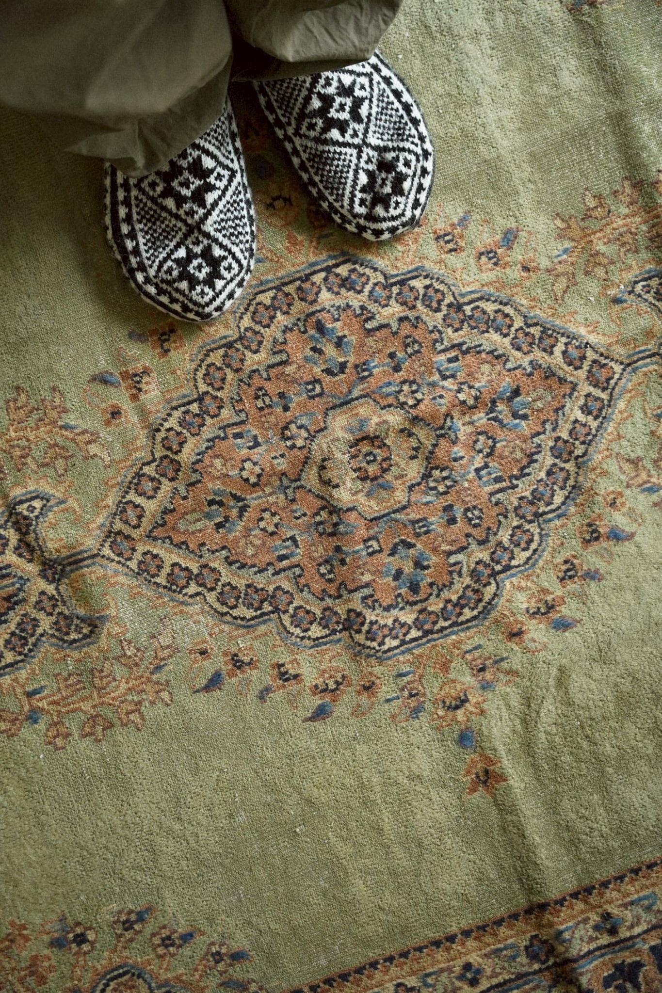 パイルは経年による擦れやリペア跡もありますが、ヴィンテージラグの風合いとしてお楽しみください。滑らかでとても柔らかな手触りも魅力です。取れない小さなシミあり(画像の最後のページをご確認下さい)。