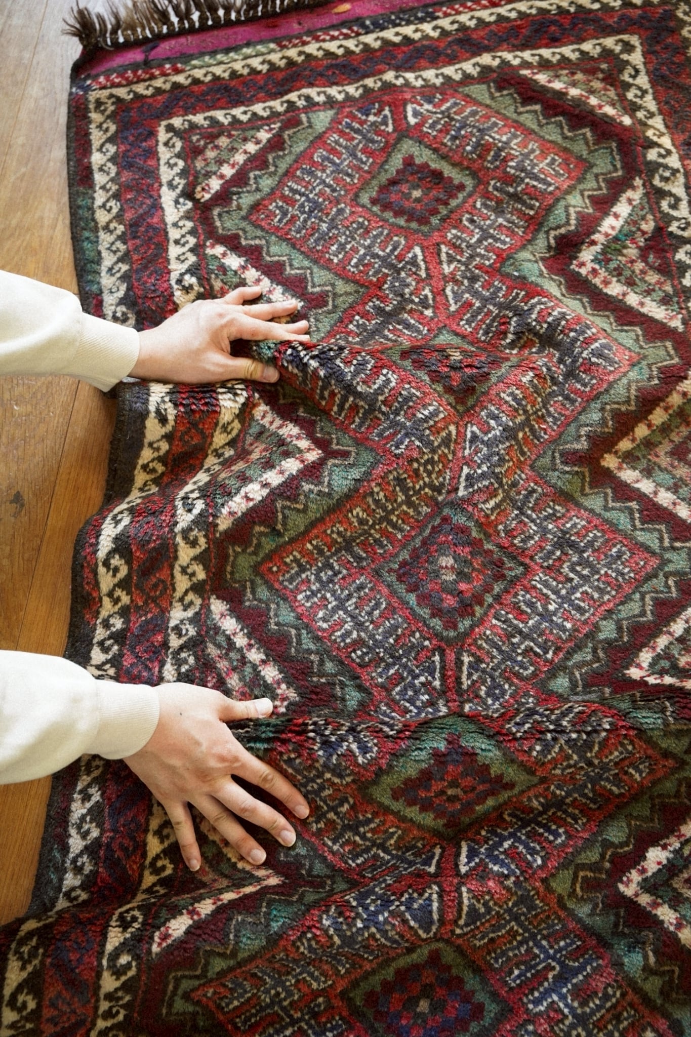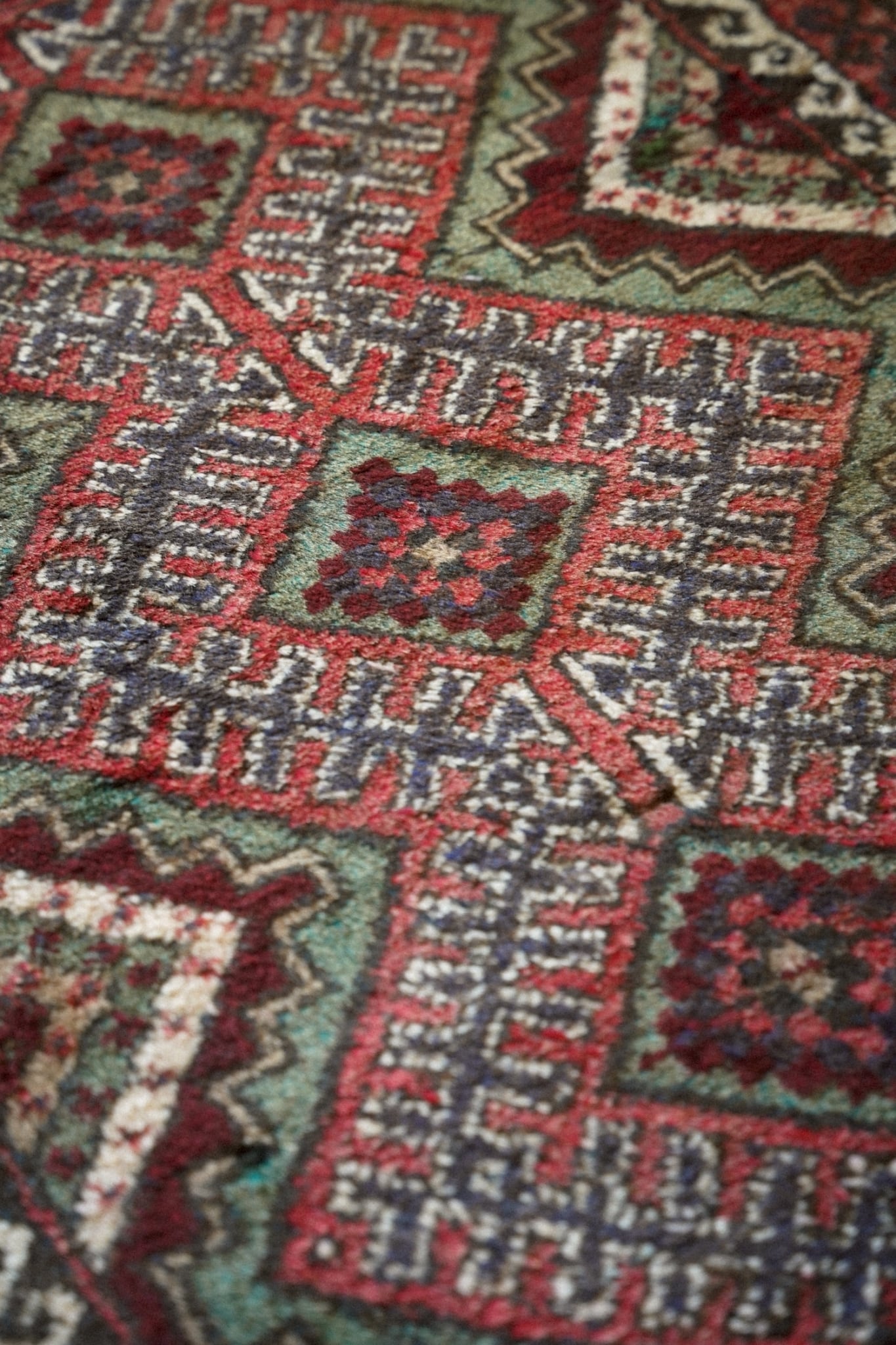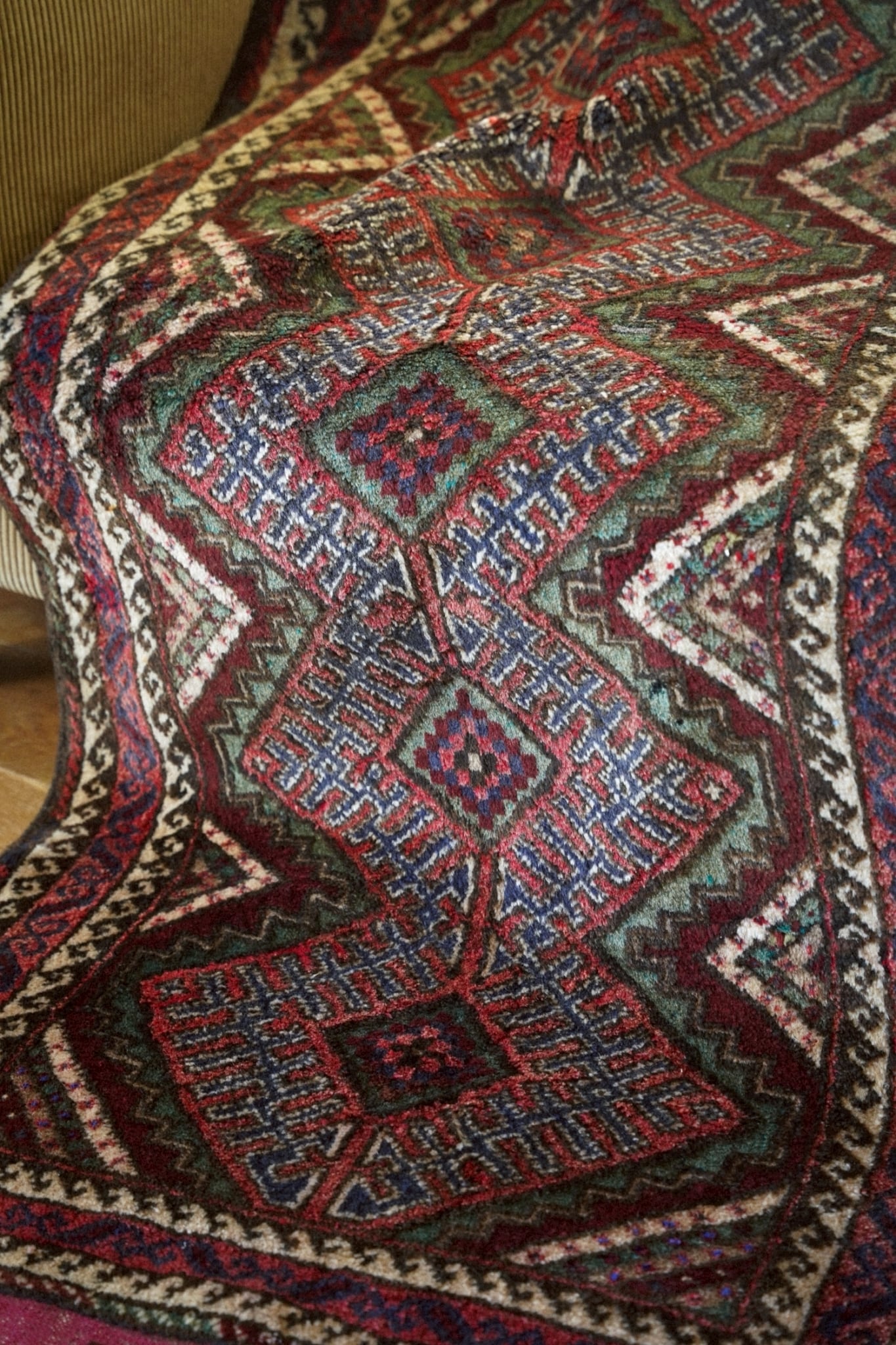 深みのあるレッドとボルドーをベースに、グリーンやネイビー、アイボリーの配色で力強い菱形メダリオンが描かれたデザイン。