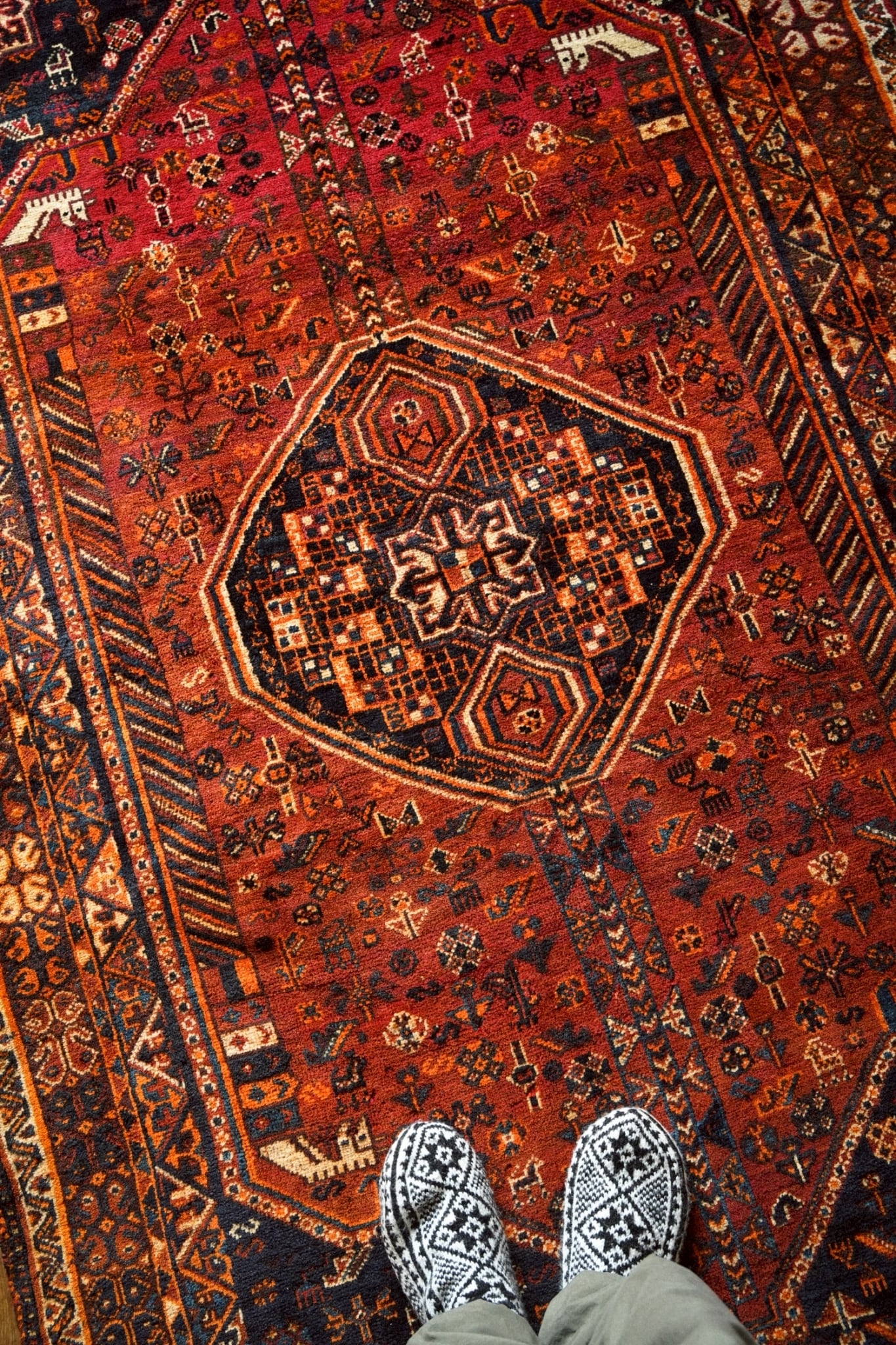 フィールドには草花や動物、部族の伝統的なモチーフが細やかに散りばめられ、まるで宝石箱を開いたかのような賑やかさ。眺めるほどに新しい発見があり、遊牧民の暮らしや願いが感じられる一枚です。