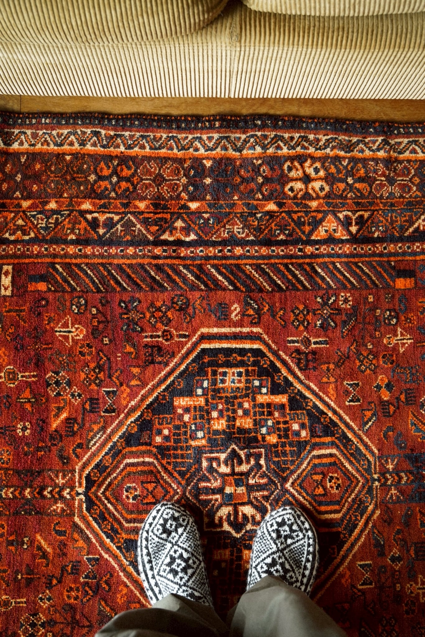 中央には存在感のある力強いメダリオン。色数は豊かですがトーンは落ち着いているため、空間に自然と馴染みやすいのも魅力です。