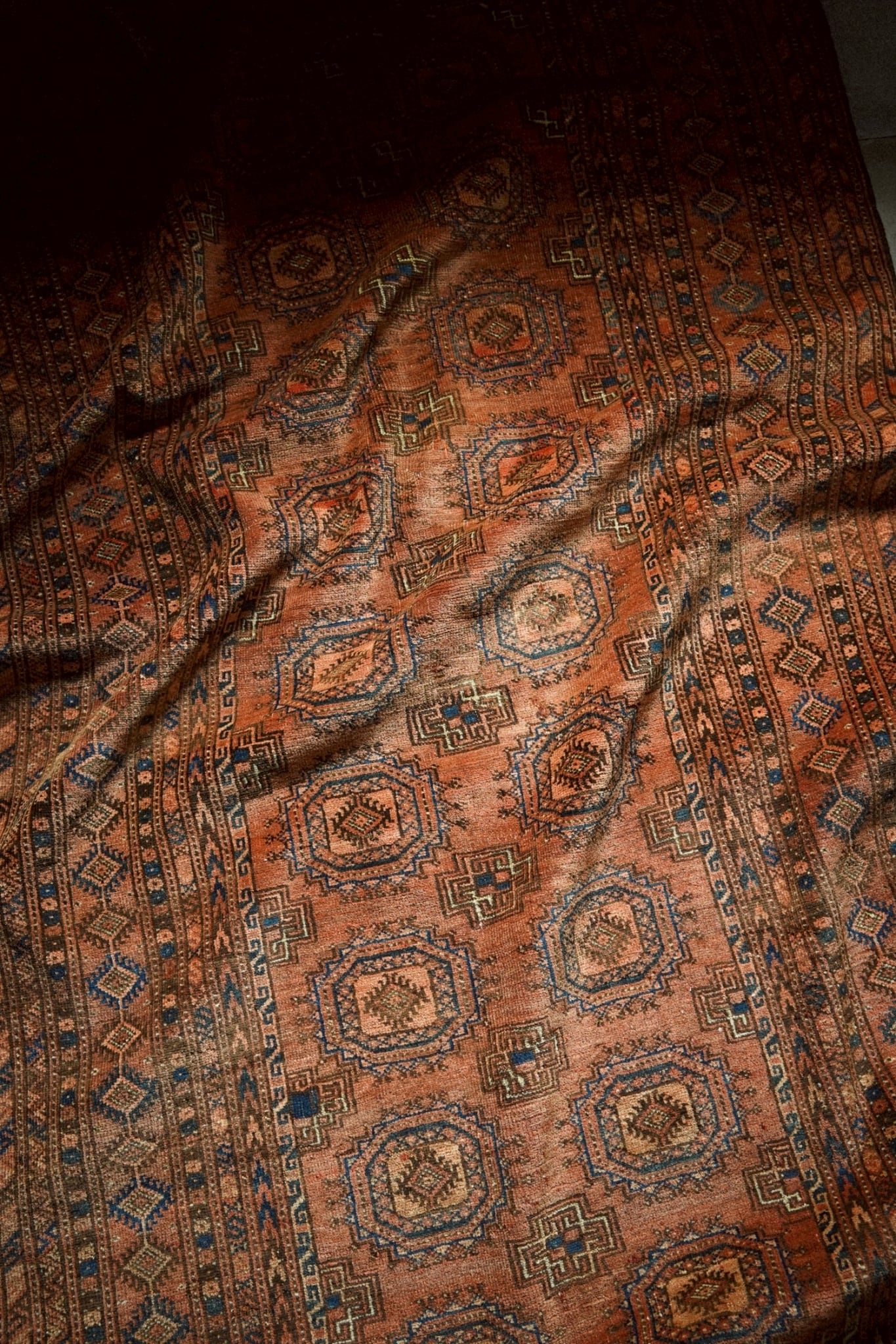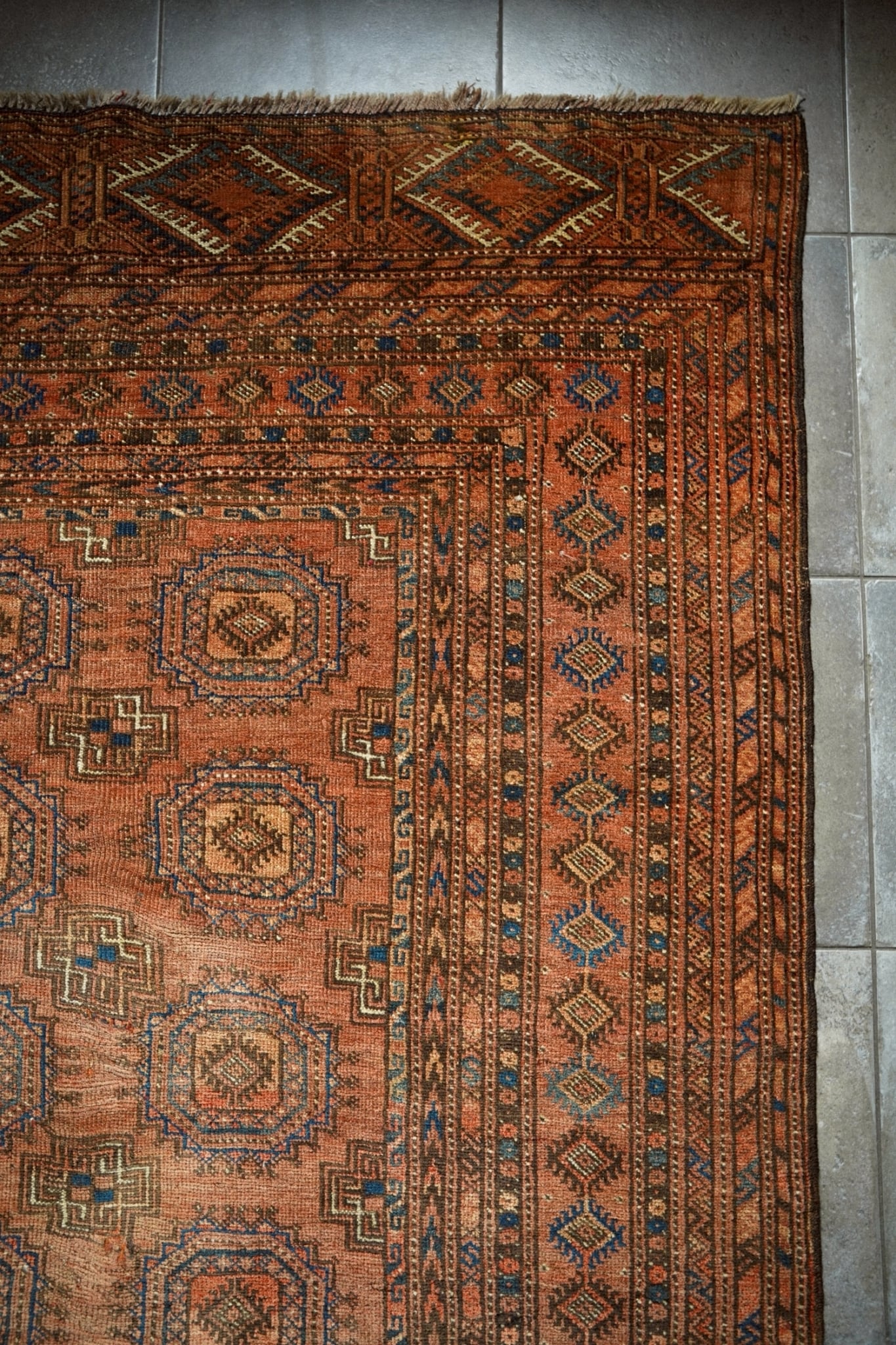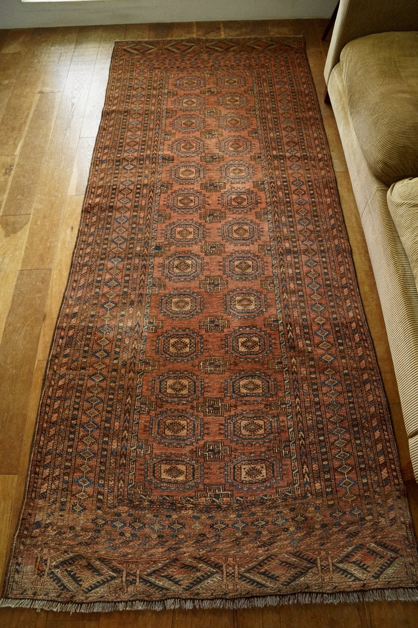 深みのあるレンガ色のフィールドに、トルクメンの伝統的なギュル紋様が整然と並び、力強さと落ち着いた美しさを感じさせます。