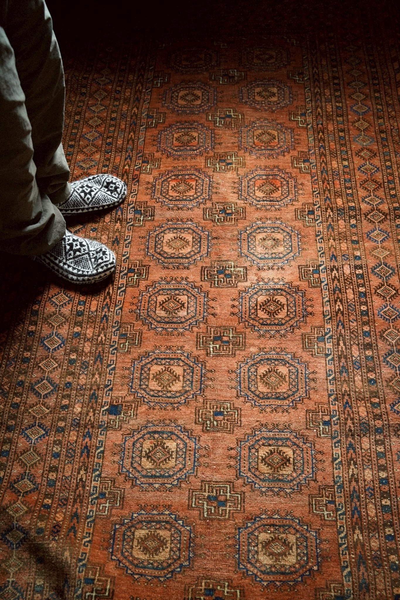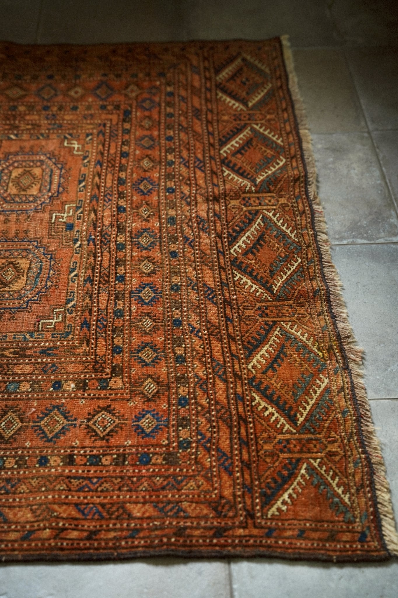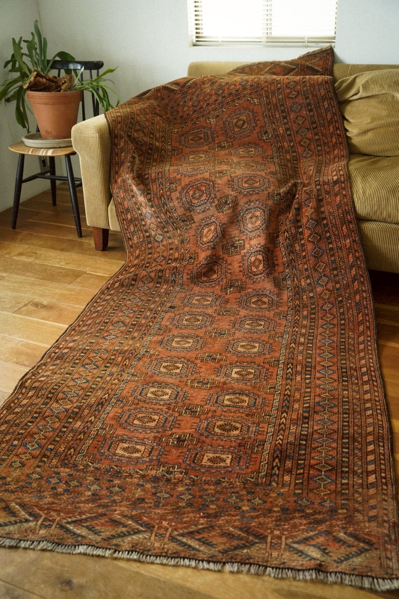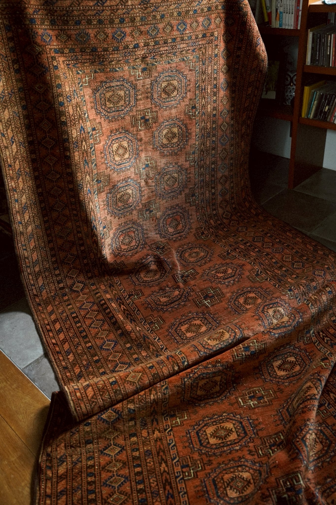 深みのあるレンガ色のフィールドに、トルクメンの伝統的なギュル紋様が整然と並び、力強さと落ち着いた美しさを感じさせます。