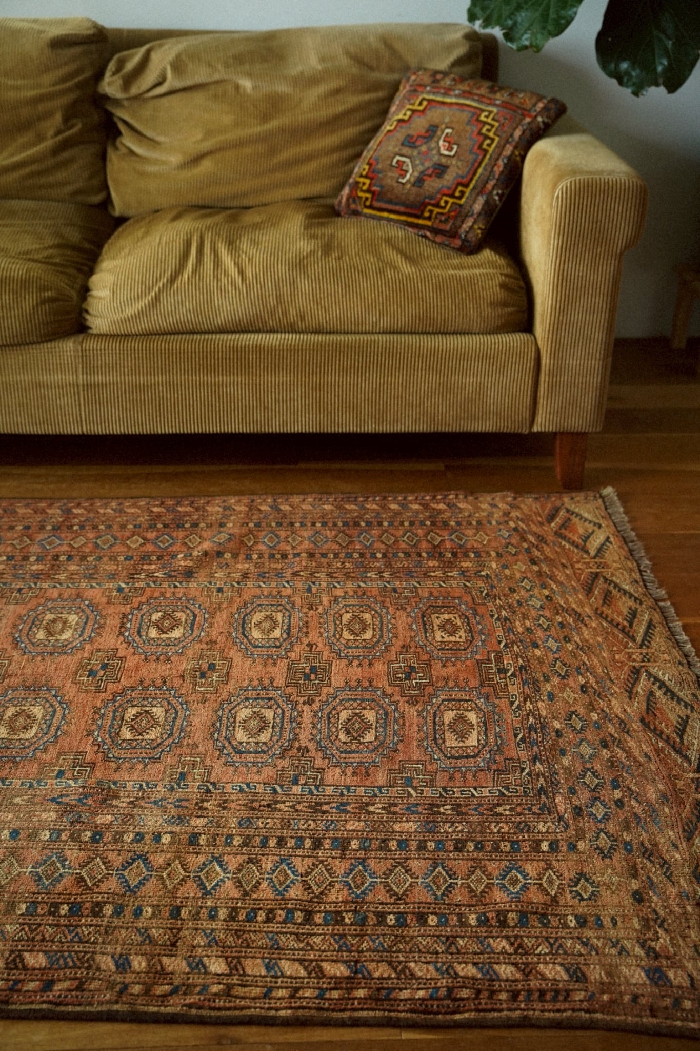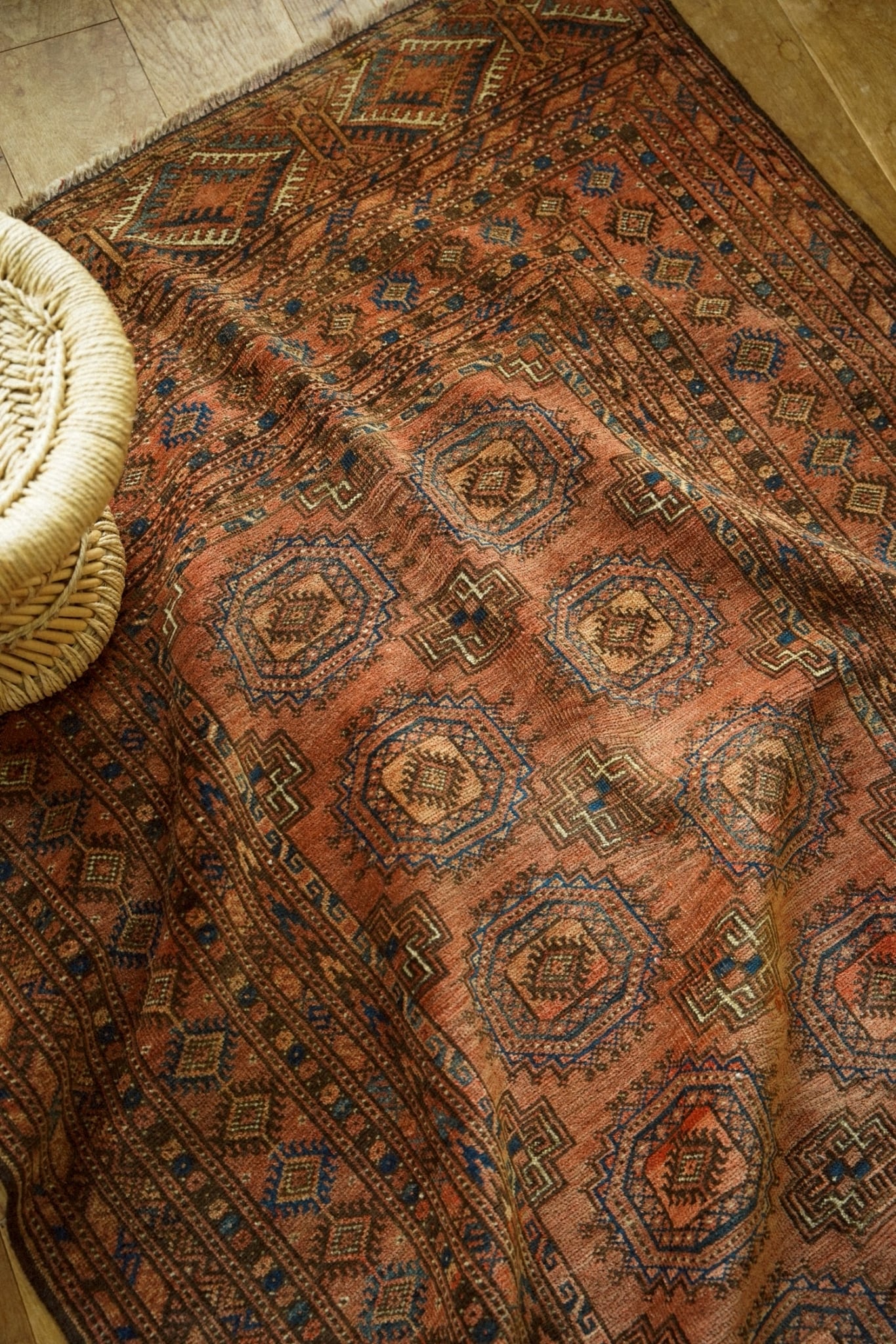 経年によりパイルが低くなっている箇所もありますが使用に問題はなく、アンティークラグならではの風合いや味わいとして楽しんでいただけます。
