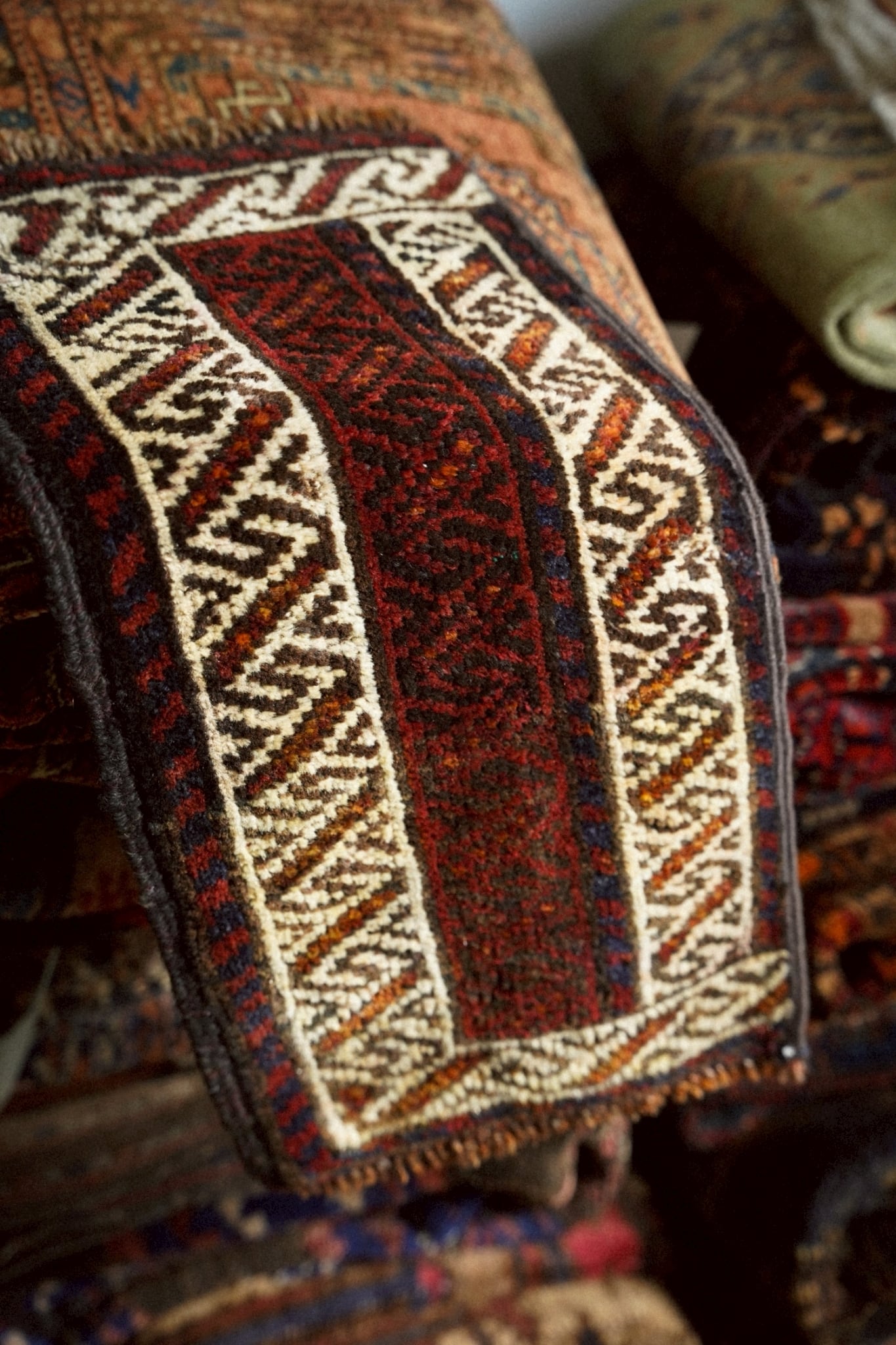 レッド、ブラウン、ネイビー、アイボリーの色構成で描かれた連続紋様。