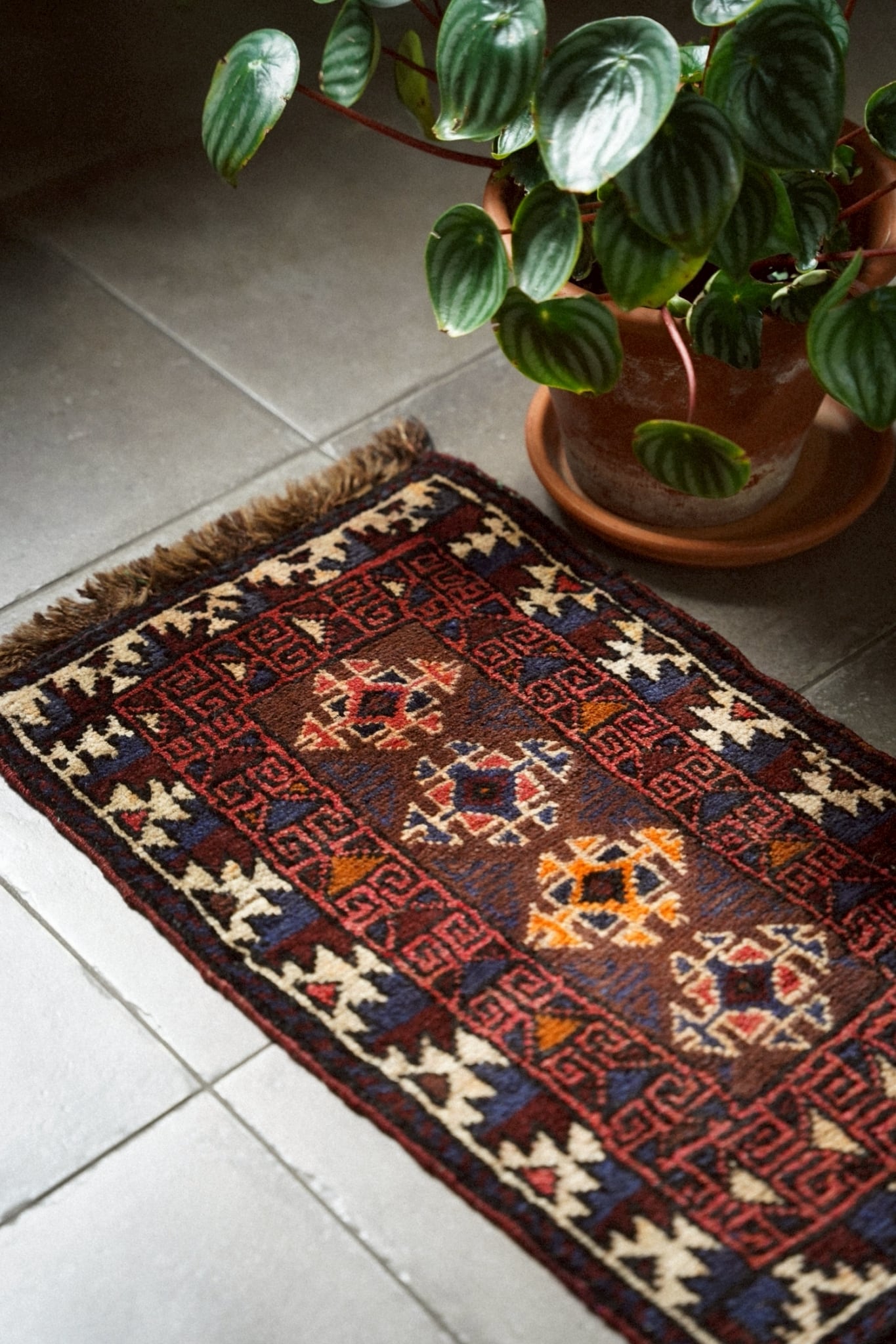 1960年代にバルーチ族によって織られたミニラグ。深みのあるボルドーをベースにネイビーやアイボリー、オレンジでフックドメダリオンが描かれたデザイン。