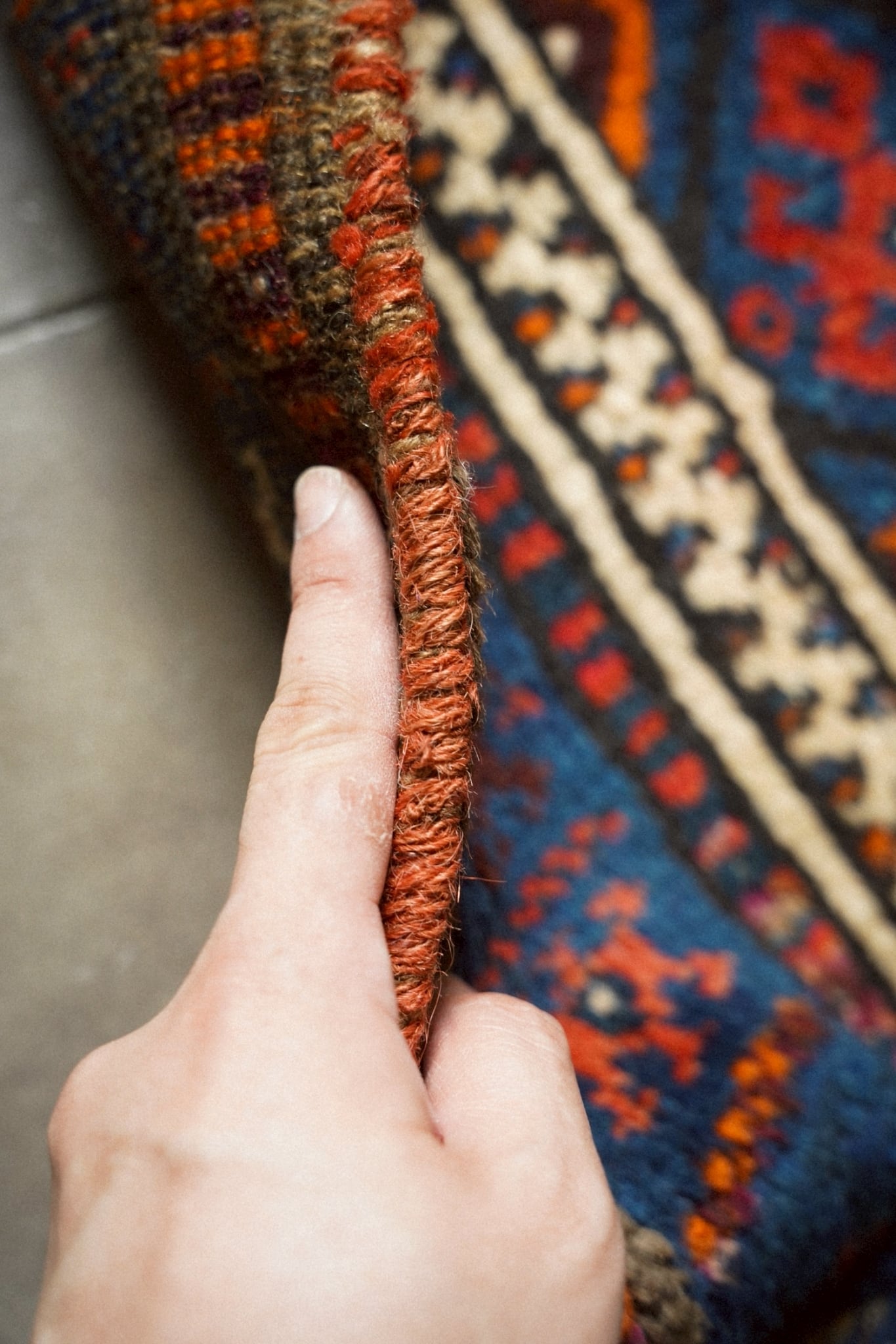 深みのあるインディゴをベースにレッド、オレンジ、アイボリーなどが織り込まれ、コントラストの効いた配色でありながらも調和が取れたバランスの良いデザイン。