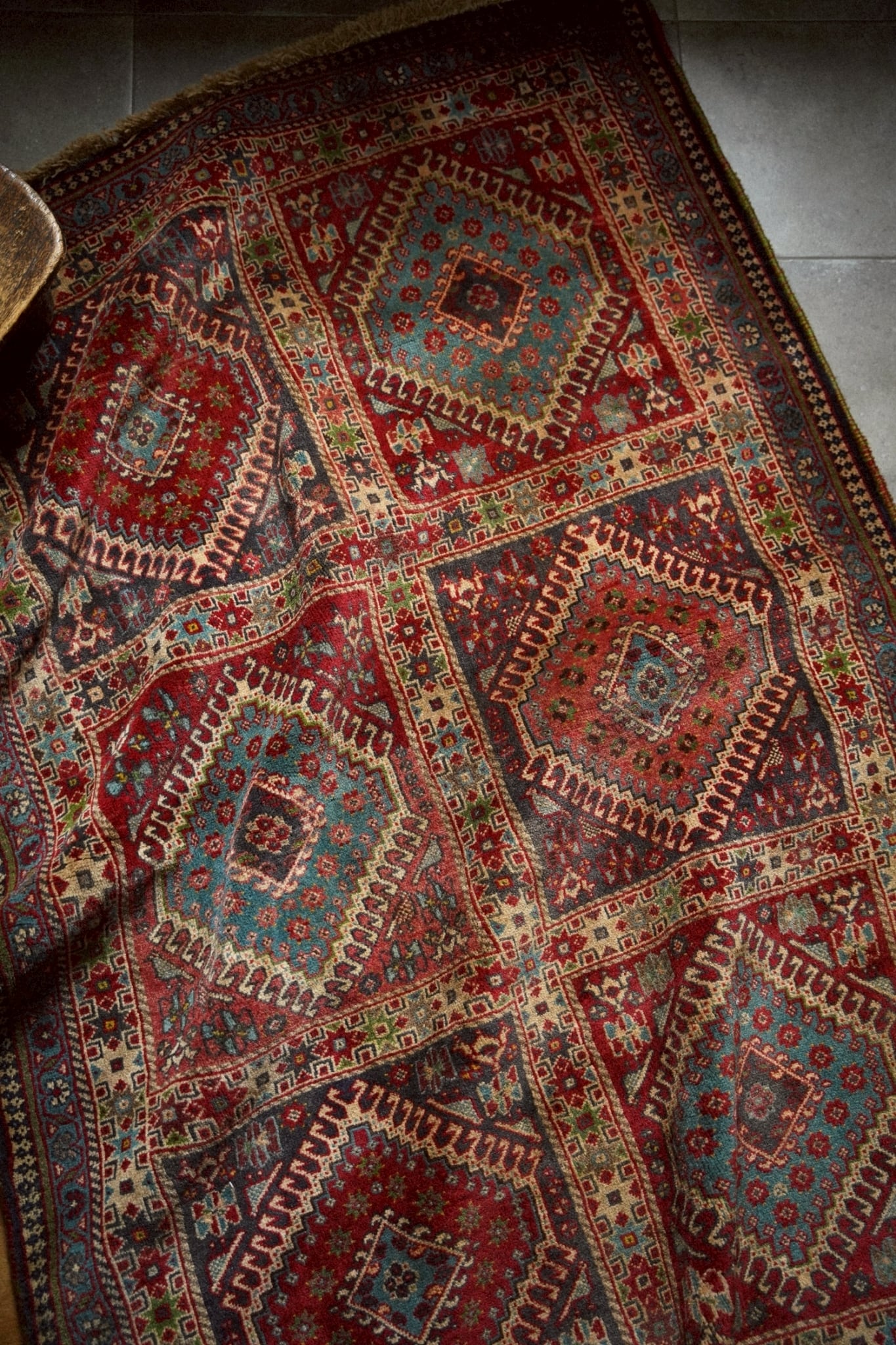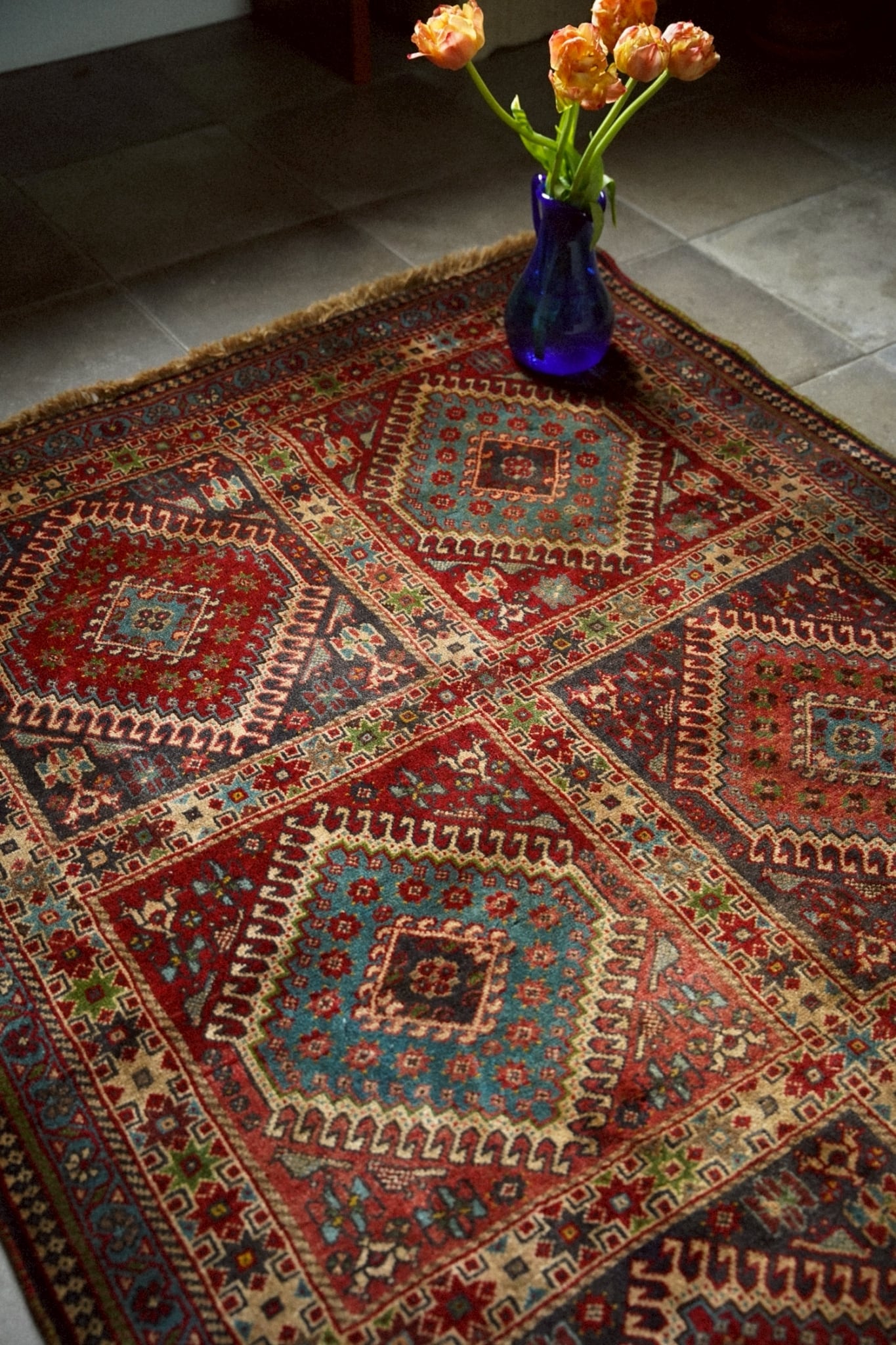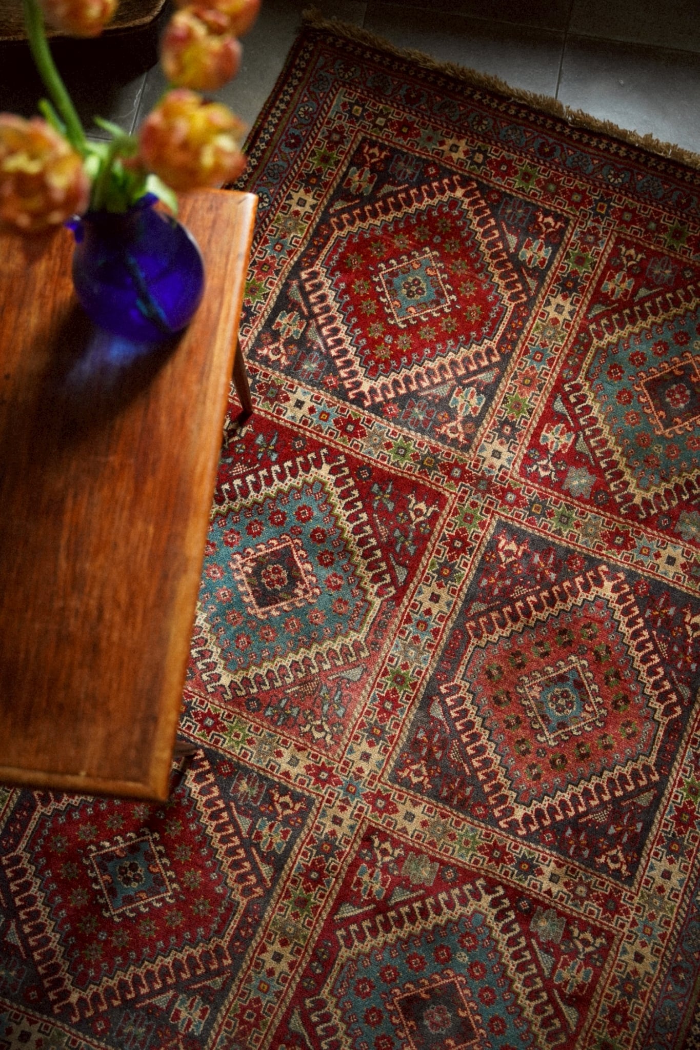 ヴィンテージラグならではの深みを増した色彩が、空間に自然と馴染みます。