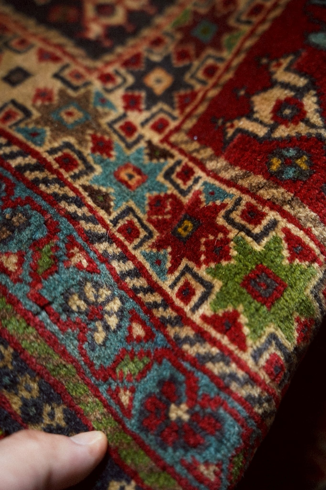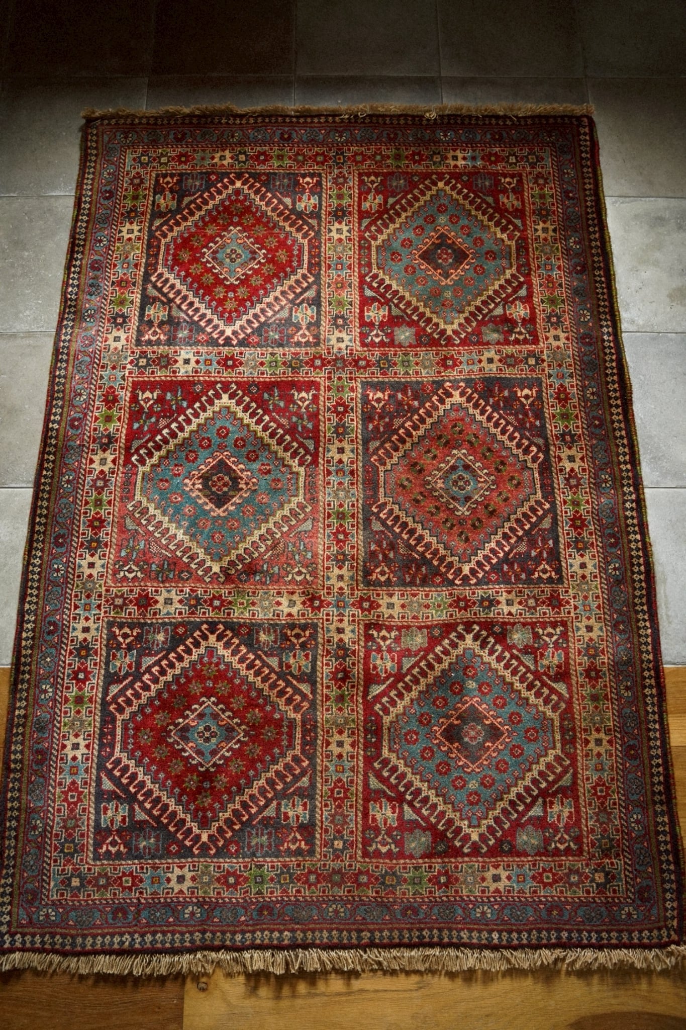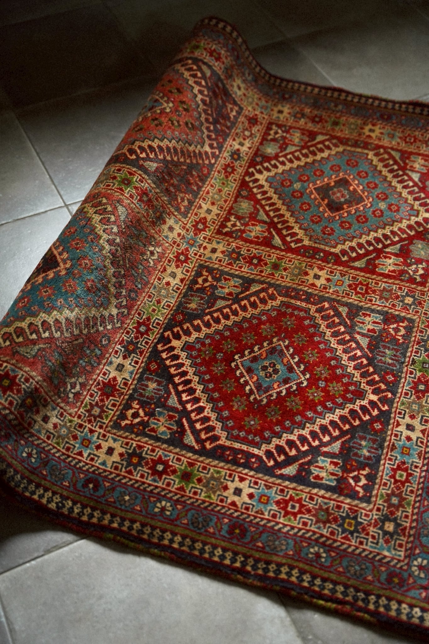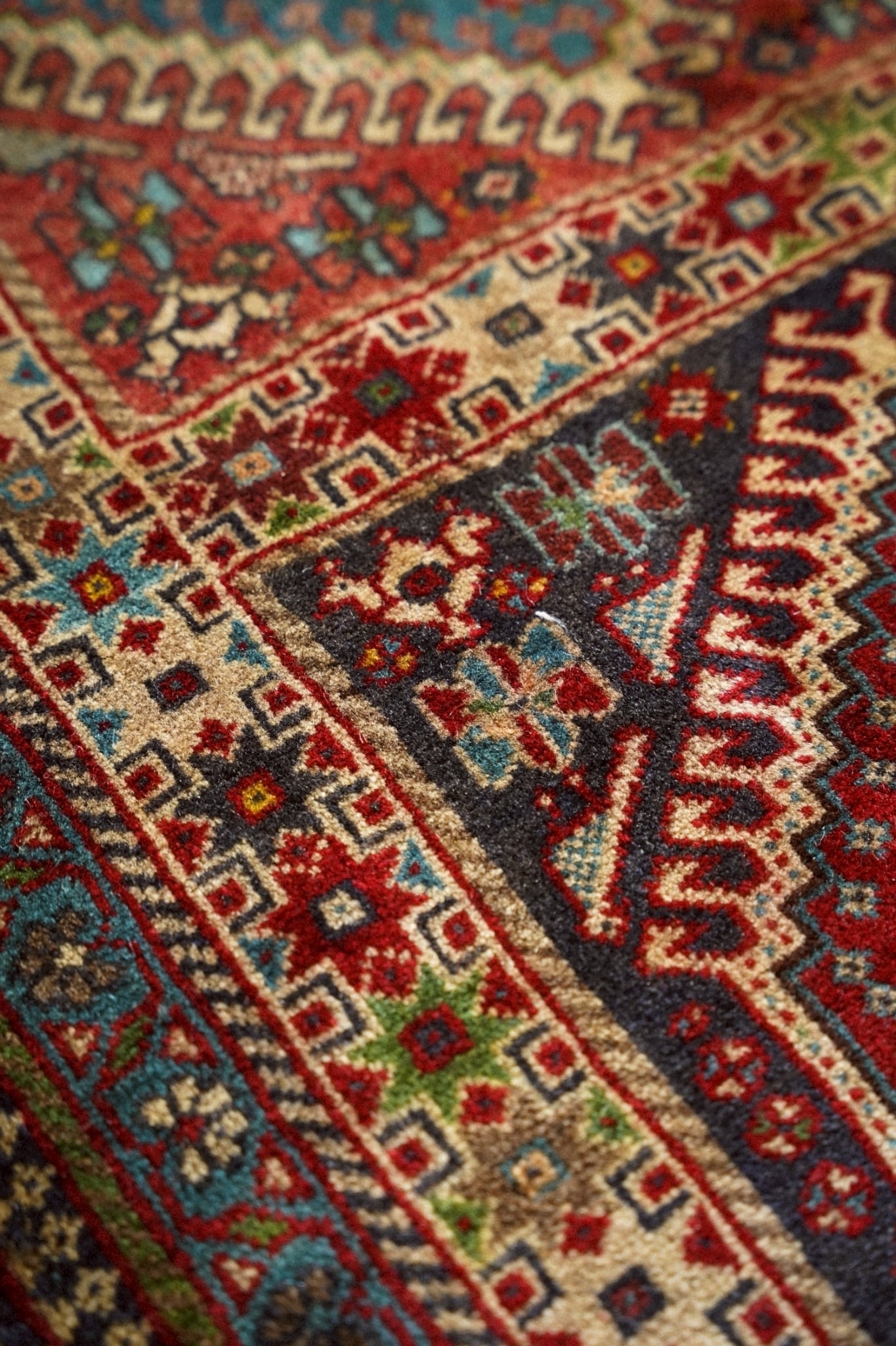 経年により熟成された色合いが美しく、深みのあるレッドを基調にアイボリーやネイビー、ターコイズがアクセントになった華やかな一枚です。