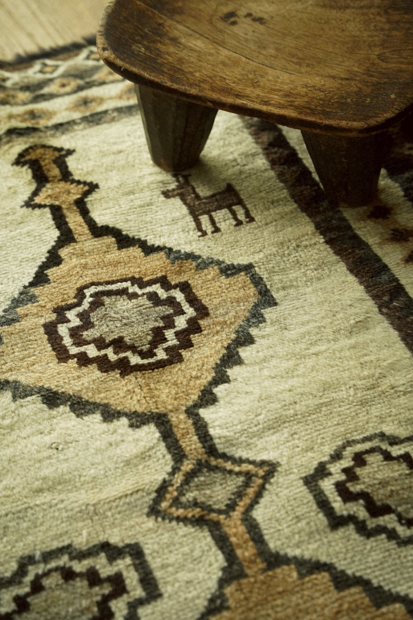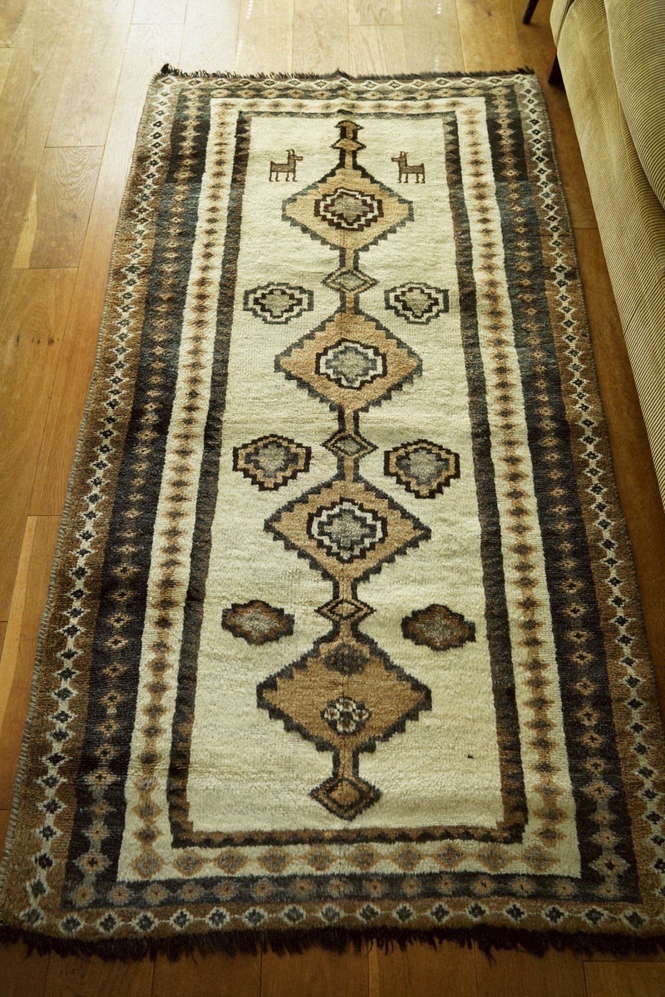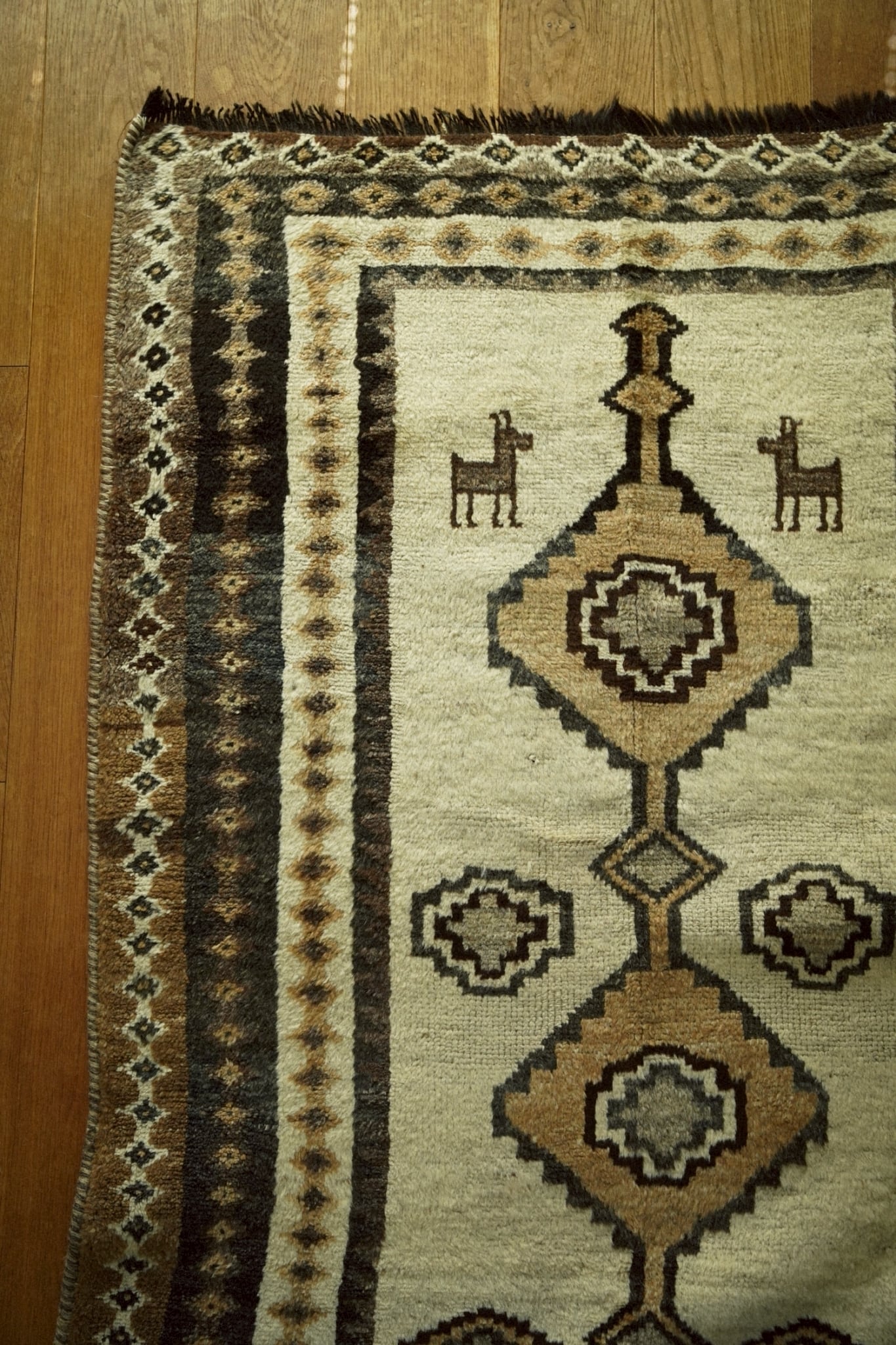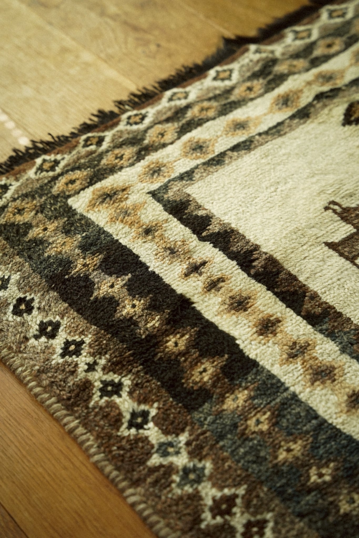 フィールドには4連の菱形メダリオン、ボーダー部分にも小さな連続モチーフが織り込まれたデザイン。上部には可愛らしい動物モチーフも描かれています。上下のフリンジには山羊毛を使用しており独特のしなやかさと光沢感を楽しむことができます。素朴でどこかのんびりとした雰囲気は手織り絨毯の魅力が詰まっています。