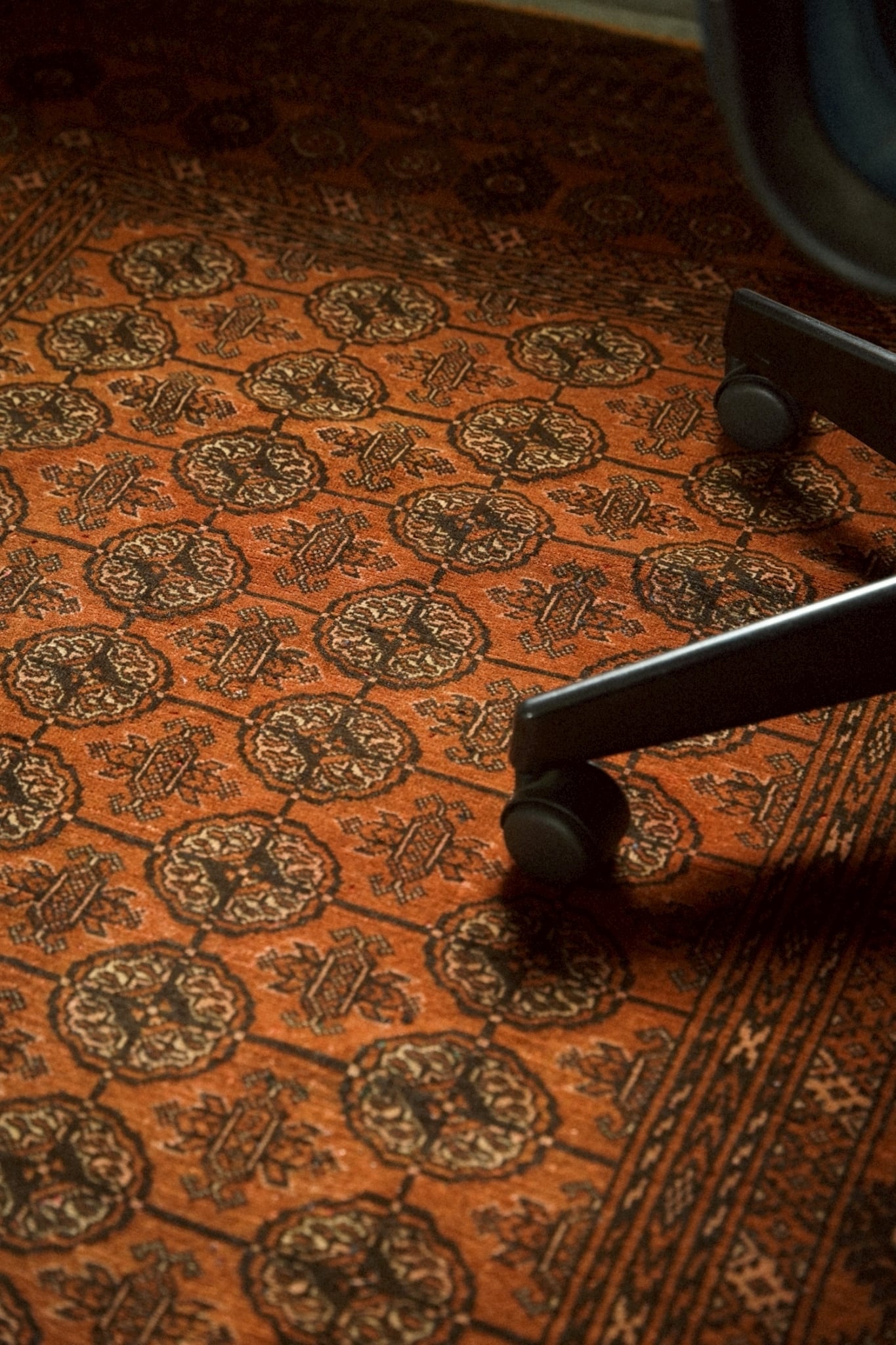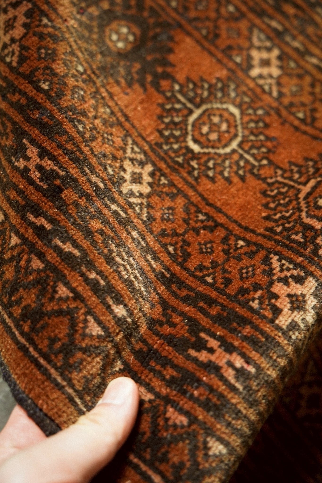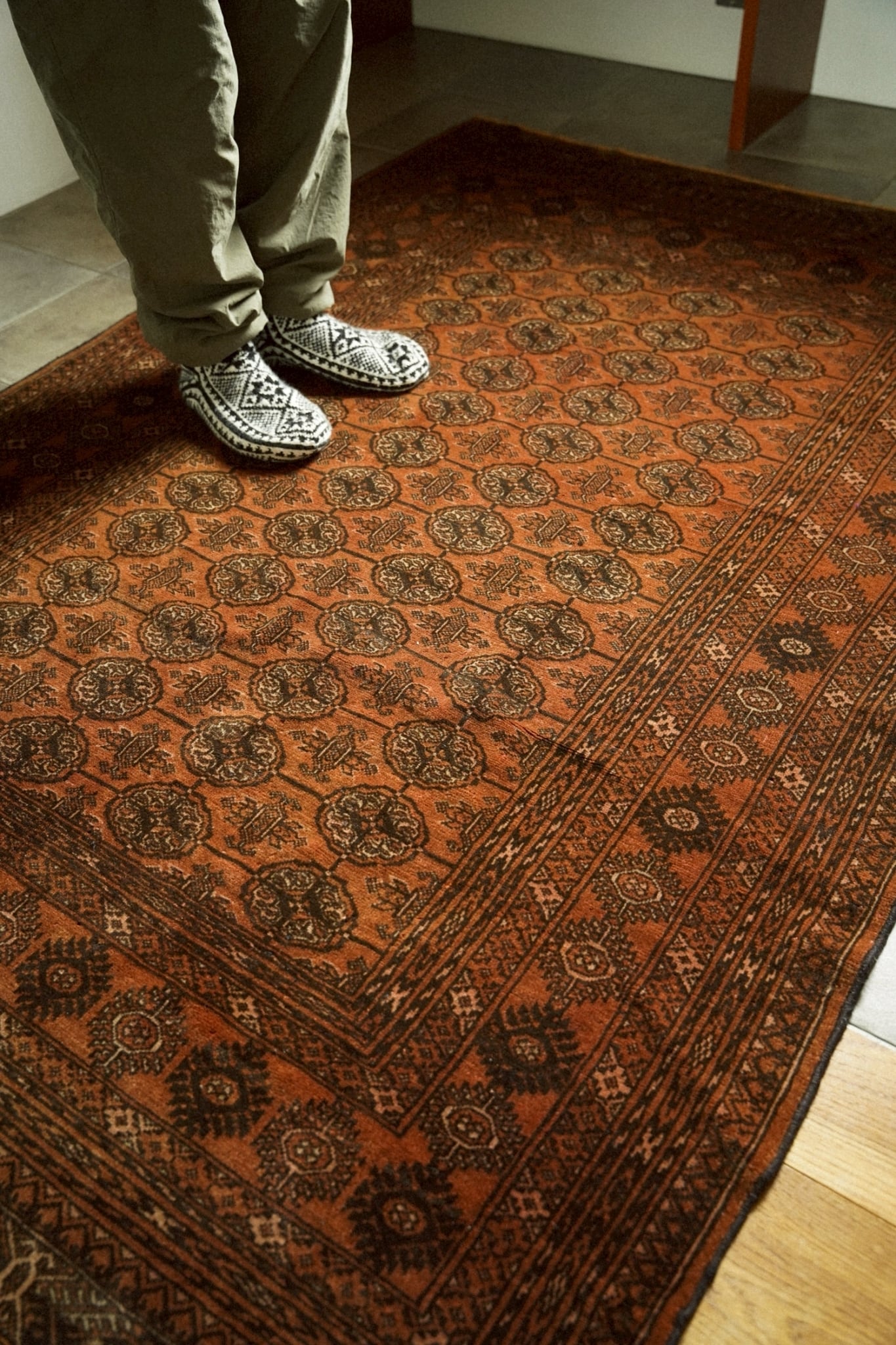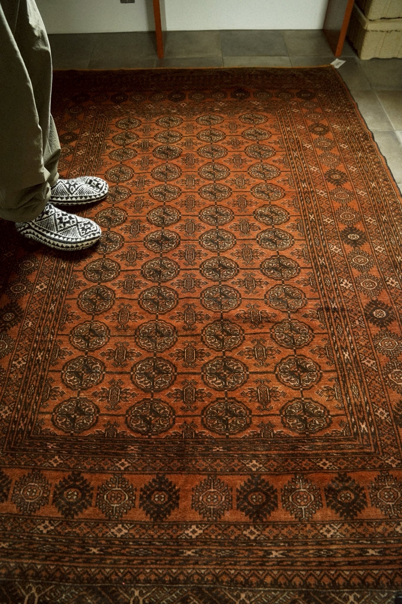 温かみのあるテラコッタに近い朱赤をベースにMauri Gulと呼ばれるギュルがたくさん並んだデザインのアフガントルクメンラグ。